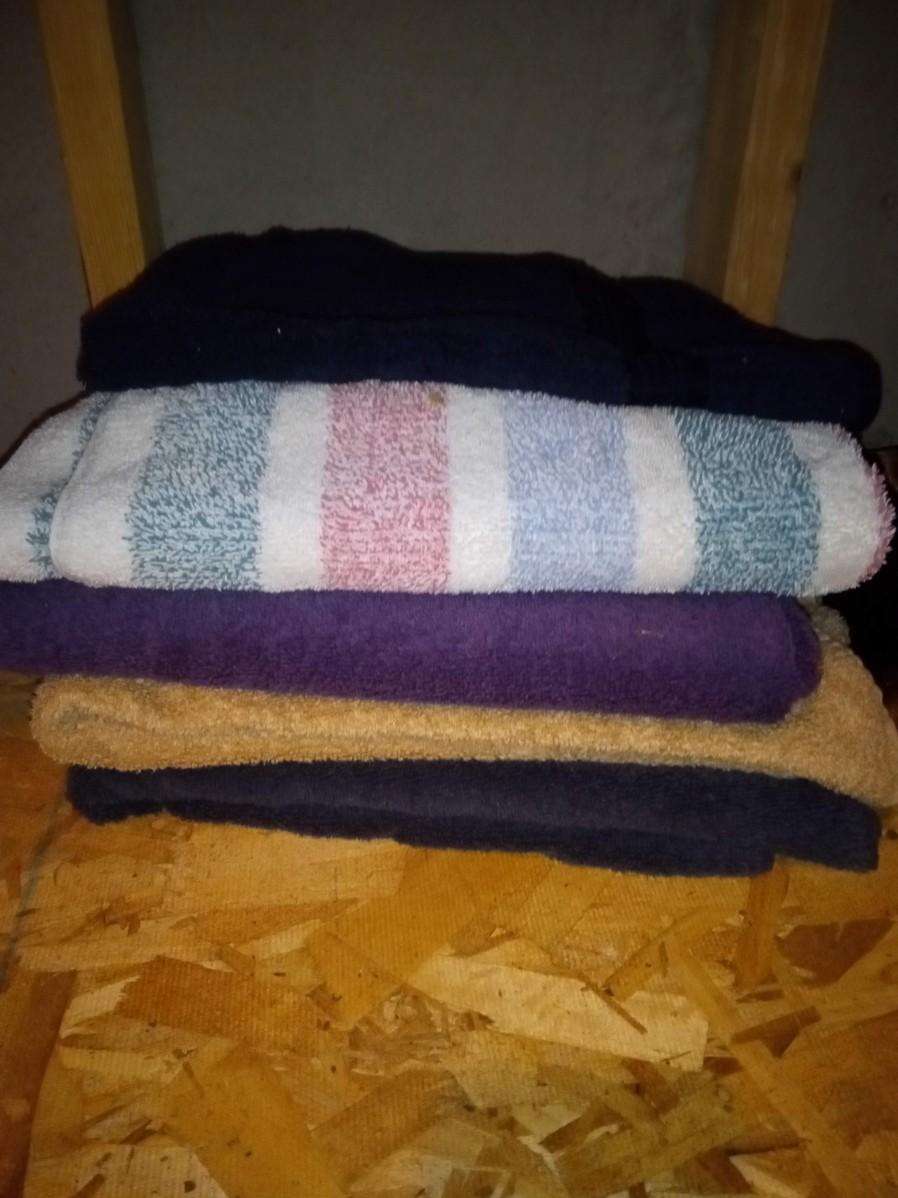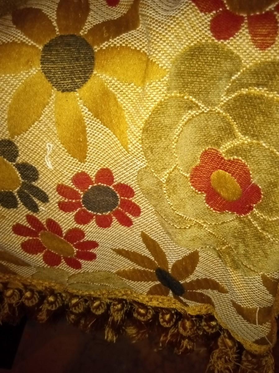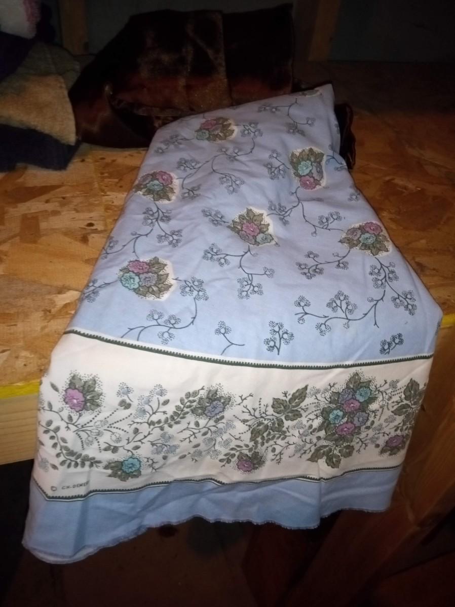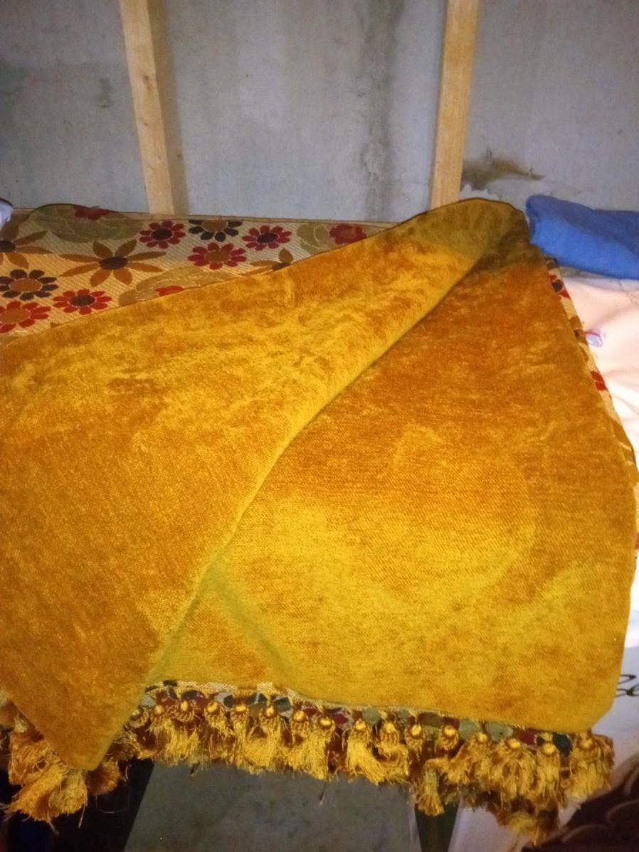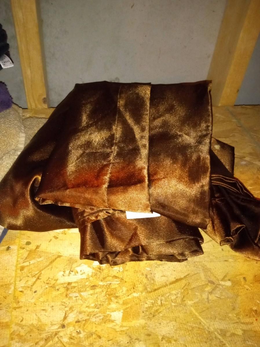 VERY THICK THROW BLANKET WITH TASSELS, VINTAGE TABLECLOTH, SATIN TWIN FLAT SHEET AND 2 PILLOW CASES, BATH TOWELS, 2 LONG CURTAIN PANELS