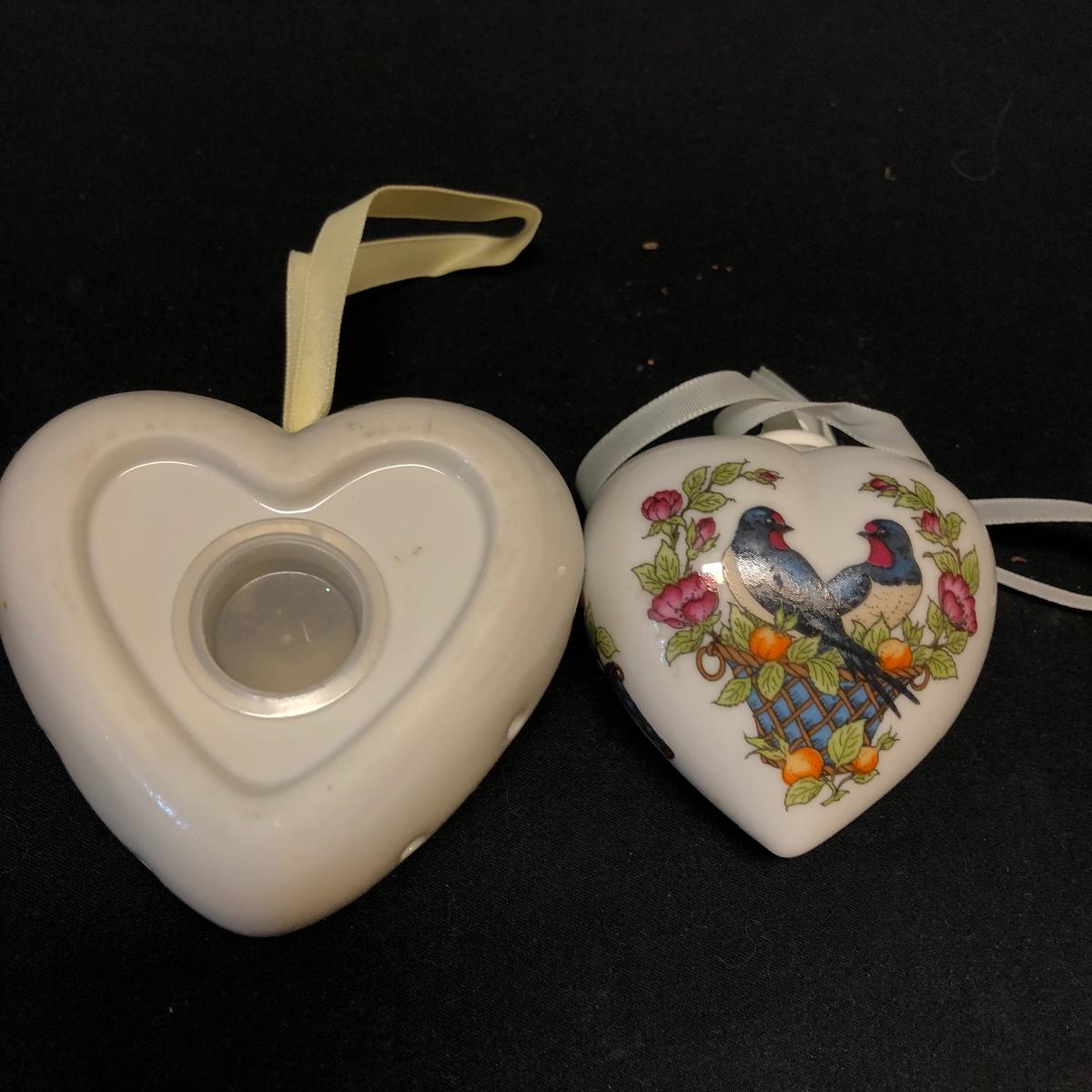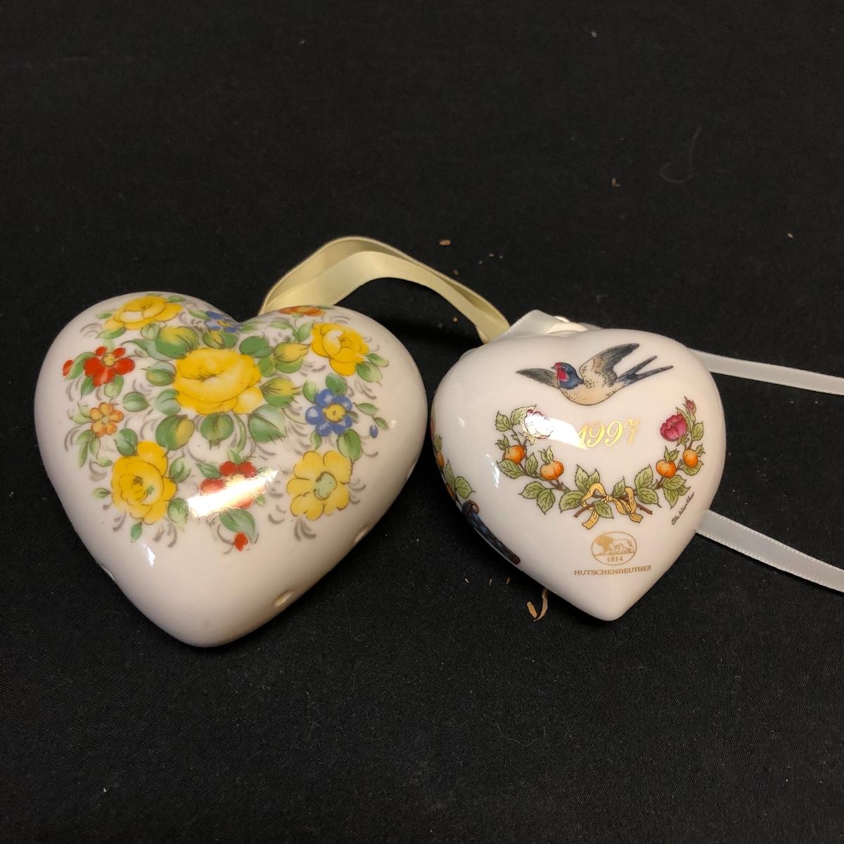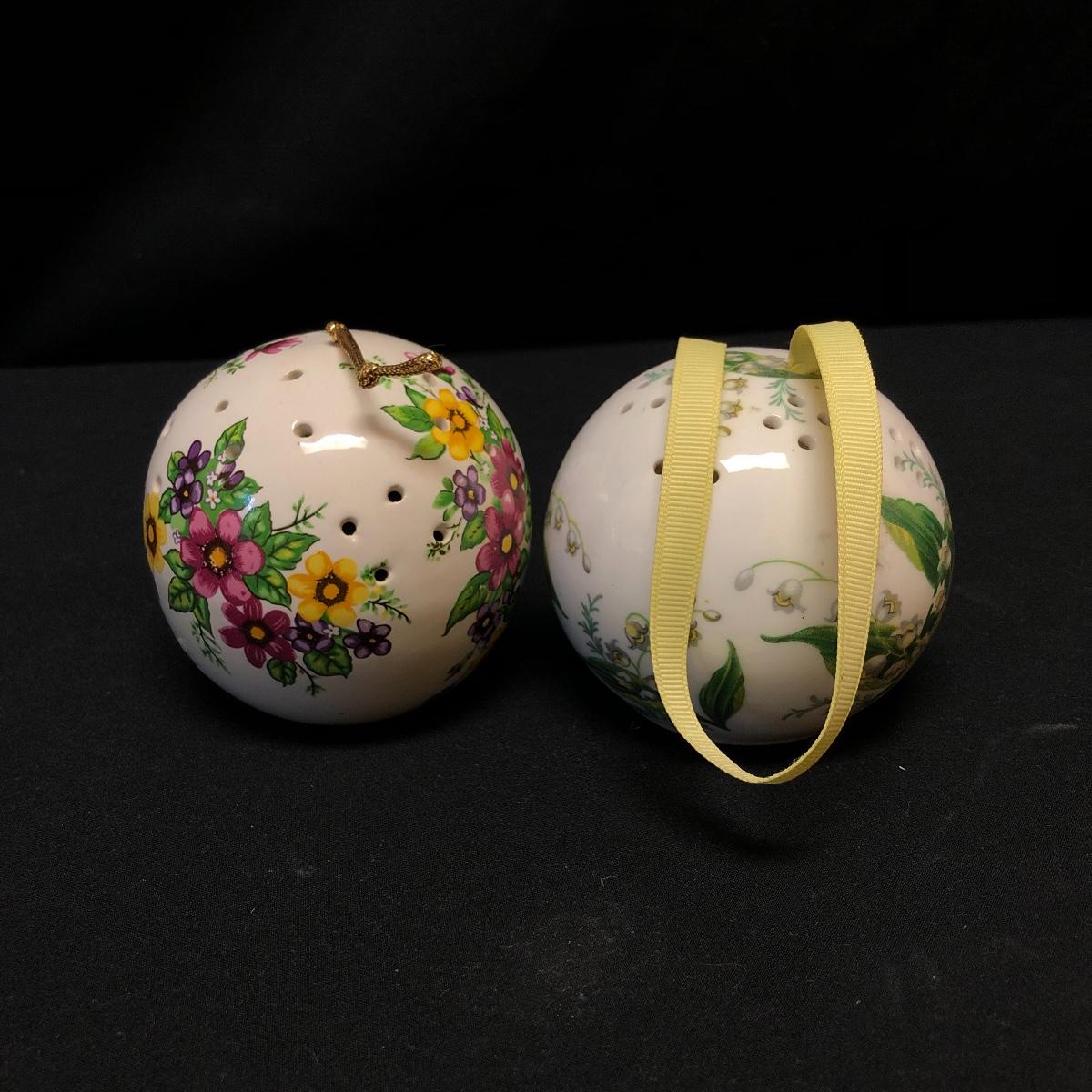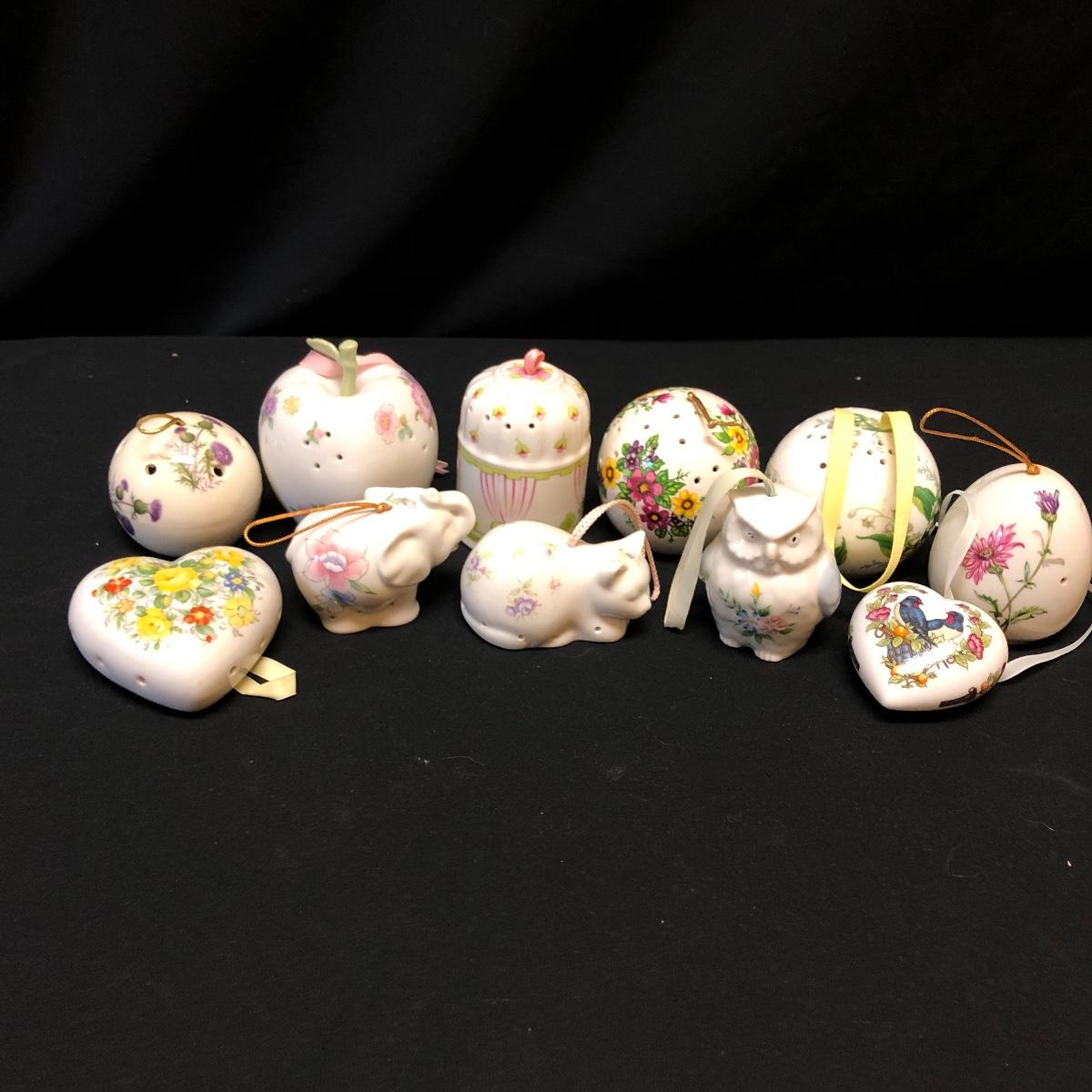 Lot includes Spode Hammersley fragrance ball, four pieces made in Japan, three unmarked pieces, ball made in Scotland, Ball made in Taiwan and a heart made by Hutschenreuther. Largest piece measures 3”D x 4”tall.