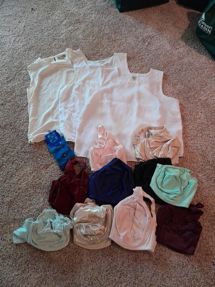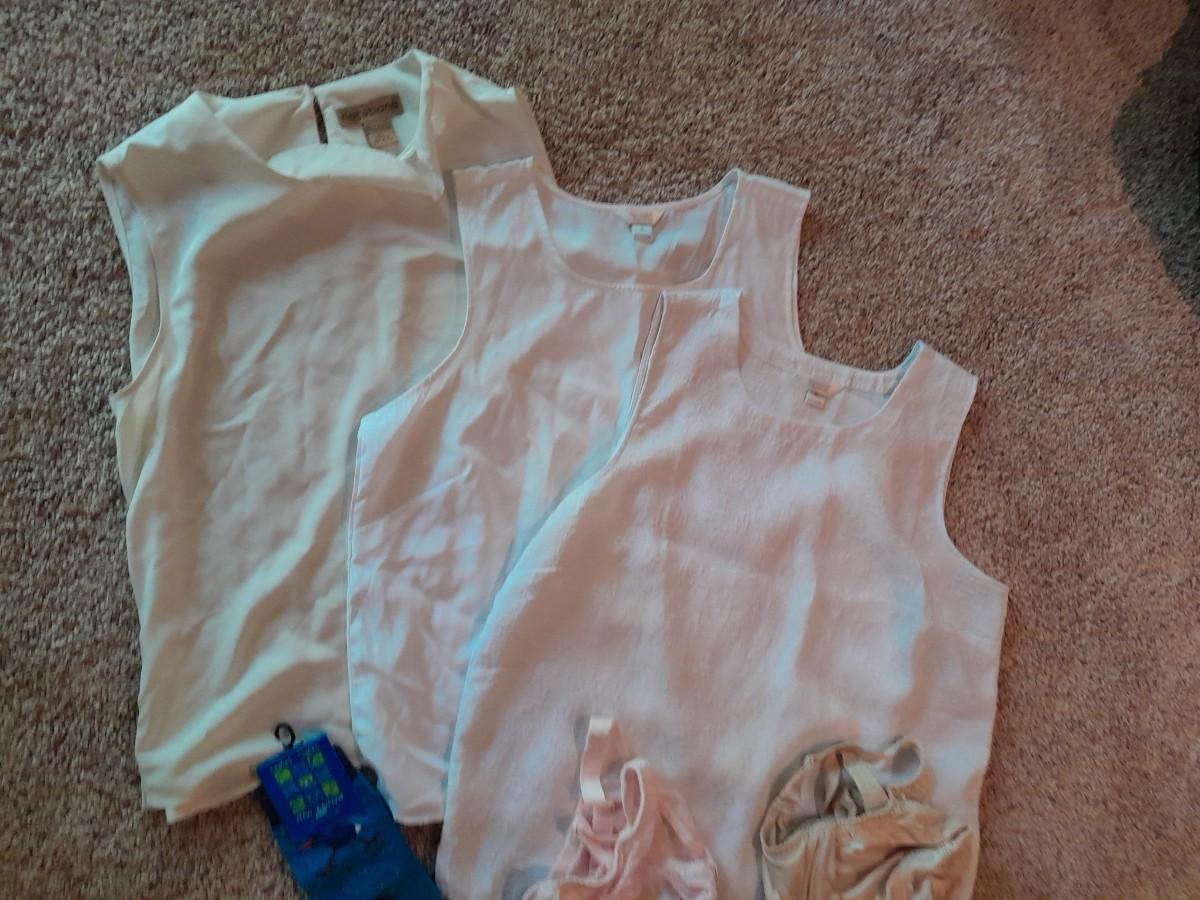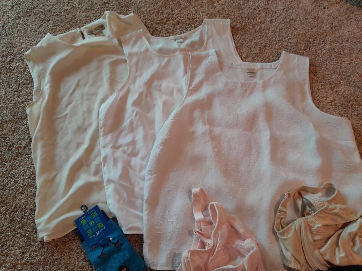 WOMEN'S TANK TOPS SIZE L AND XL , 36G UNDERGARMENTS, AND A NEW PAIR OF SOCKS