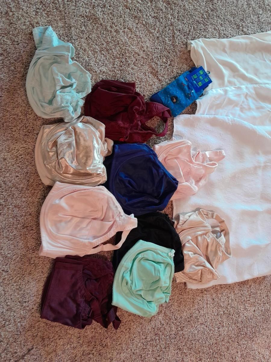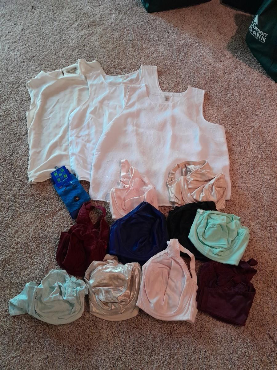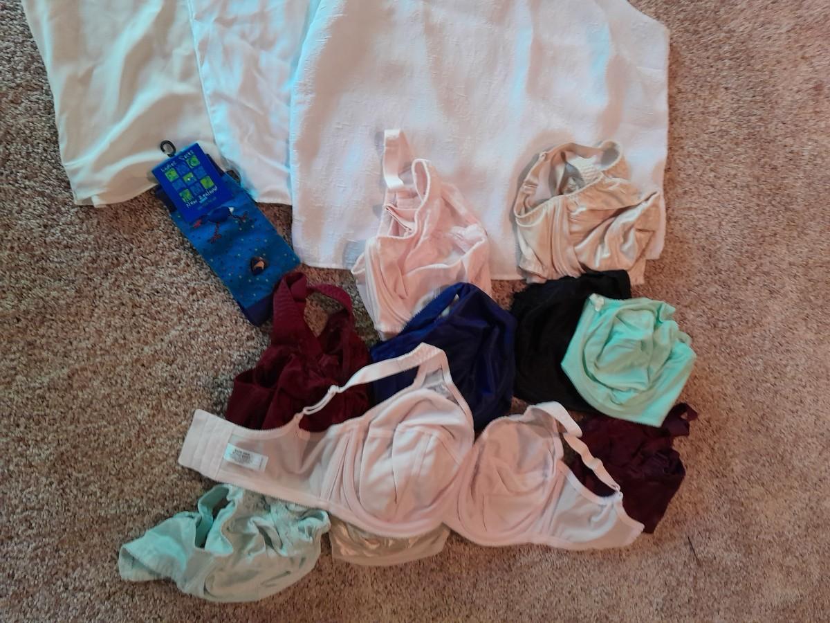 WOMEN'S TANK TOPS SIZE L AND XL , 36G UNDERGARMENTS, AND A NEW PAIR OF SOCKS