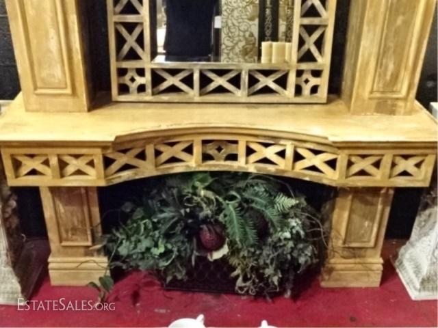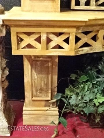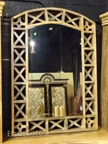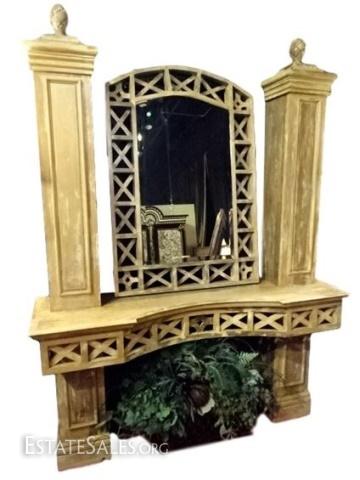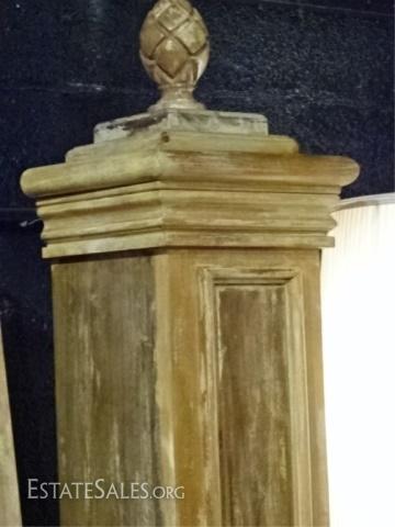 LOT 41A: 2 PC CUSTOM WOOD CONSOLE TABLE AND MIRROR, WITH COLUMNS AND FINIALS, MIRROR HANGS SEPARATELY FROM TABLE, #1 OF TWO IDENTICAL CONSOLE AND MIRROR SETS AVAILABLE THIS AUCTION (SOLD SEPARATELY), VERY GOOD CONDITION, 87"H X 63.5"W X 18"D, SKU351.04