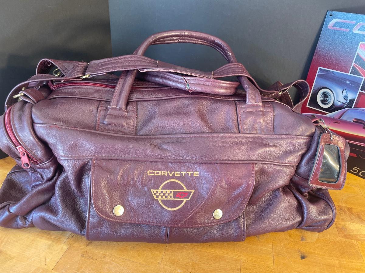 Leather duffel bag in good condition with embroidered Corvette emblem and a metal poster (approx. 12" x 16")