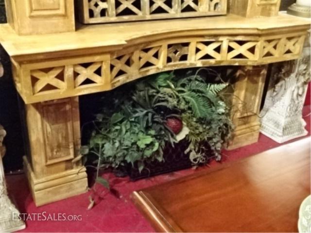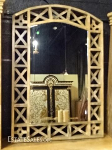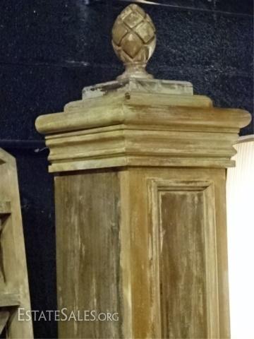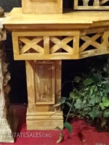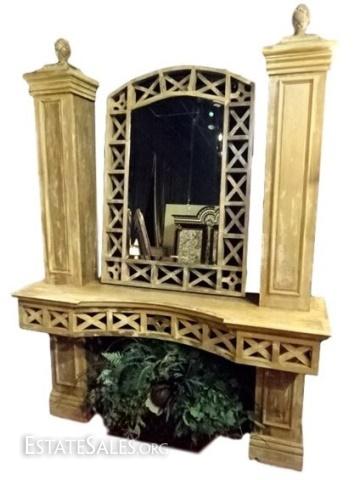 LOT 41B: 2 PC CUSTOM WOOD CONSOLE TABLE AND MIRROR, WITH COLUMNS AND FINIALS, MIRROR HANGS SEPARATELY FROM TABLE, #2 OF TWO IDENTICAL CONSOLE AND MIRROR SETS AVAILABLE THIS AUCTION (SOLD SEPARATELY), VERY GOOD CONDITION, 87"H X 63.5"W X 18"D, SKU351.04
