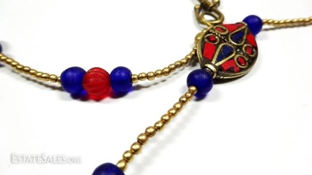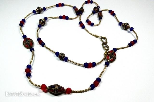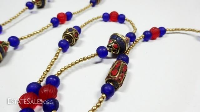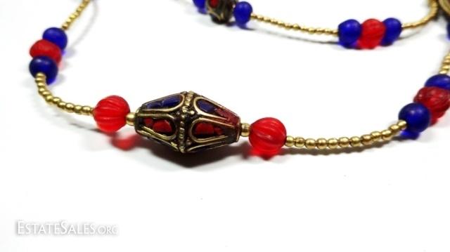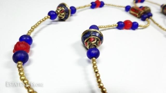 LOT 41D: TIBETAN LAPIS & CORAL NECKLACE, BLUE & RED GLASS BEADS, BRASS ACCENTS, APPROX 44"L, SKU321.104