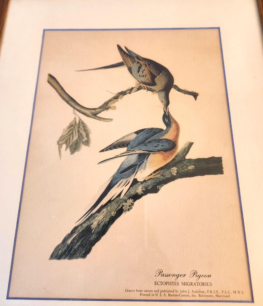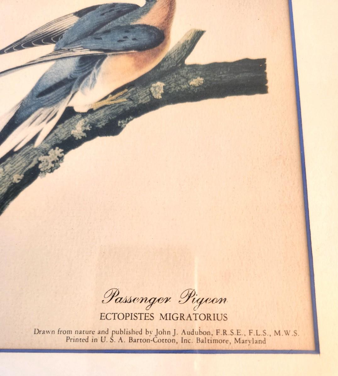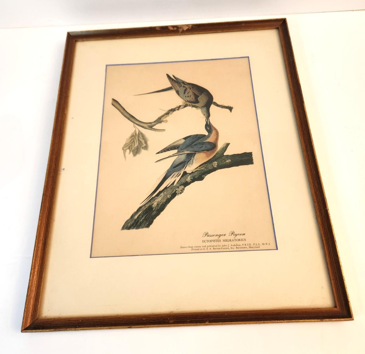 Vintage 1950's John James Audubon print depicting a Passenger Pigeon as reprinted by the Burton-Cotton Company - frame has some wear. 12.5" across, 15.75" tall.