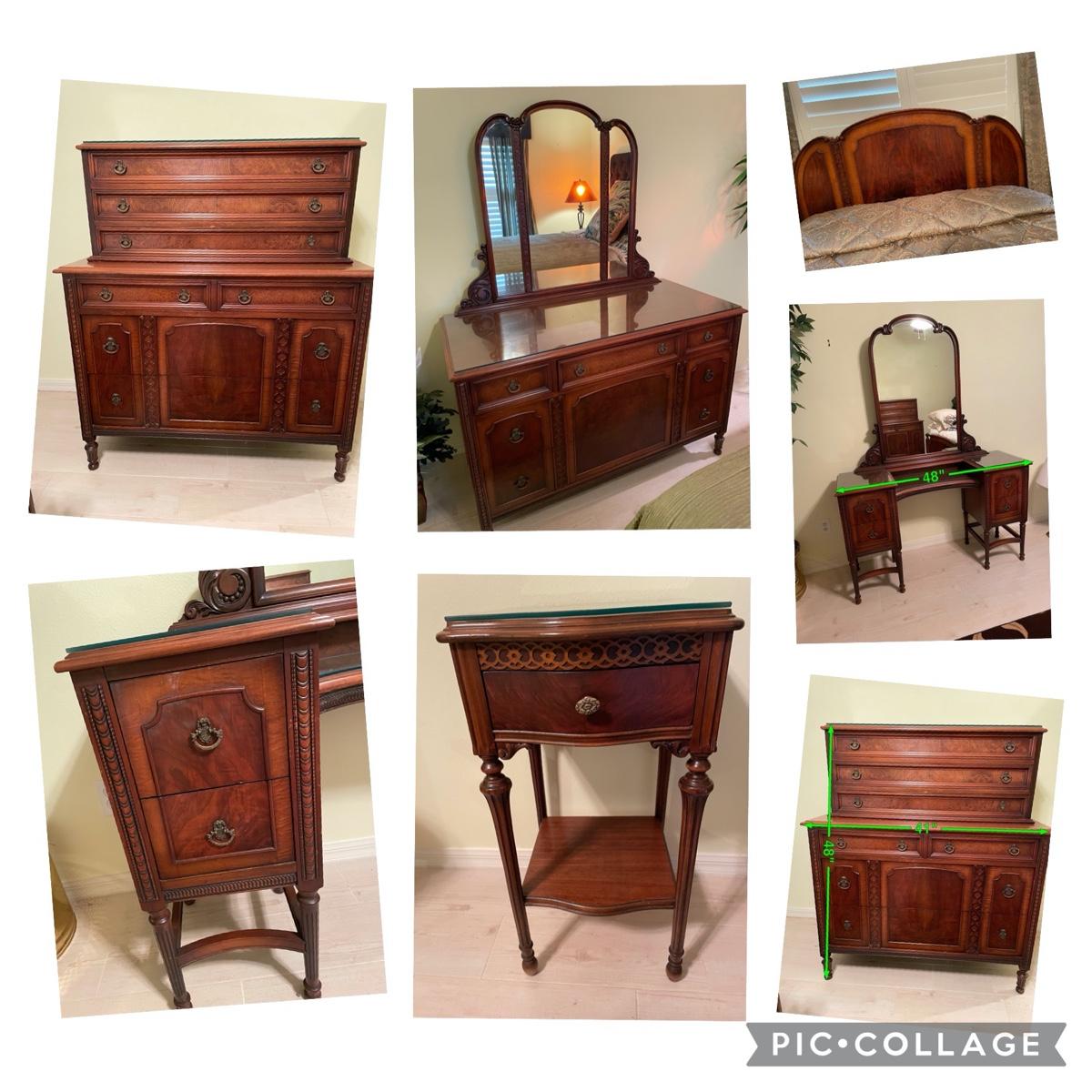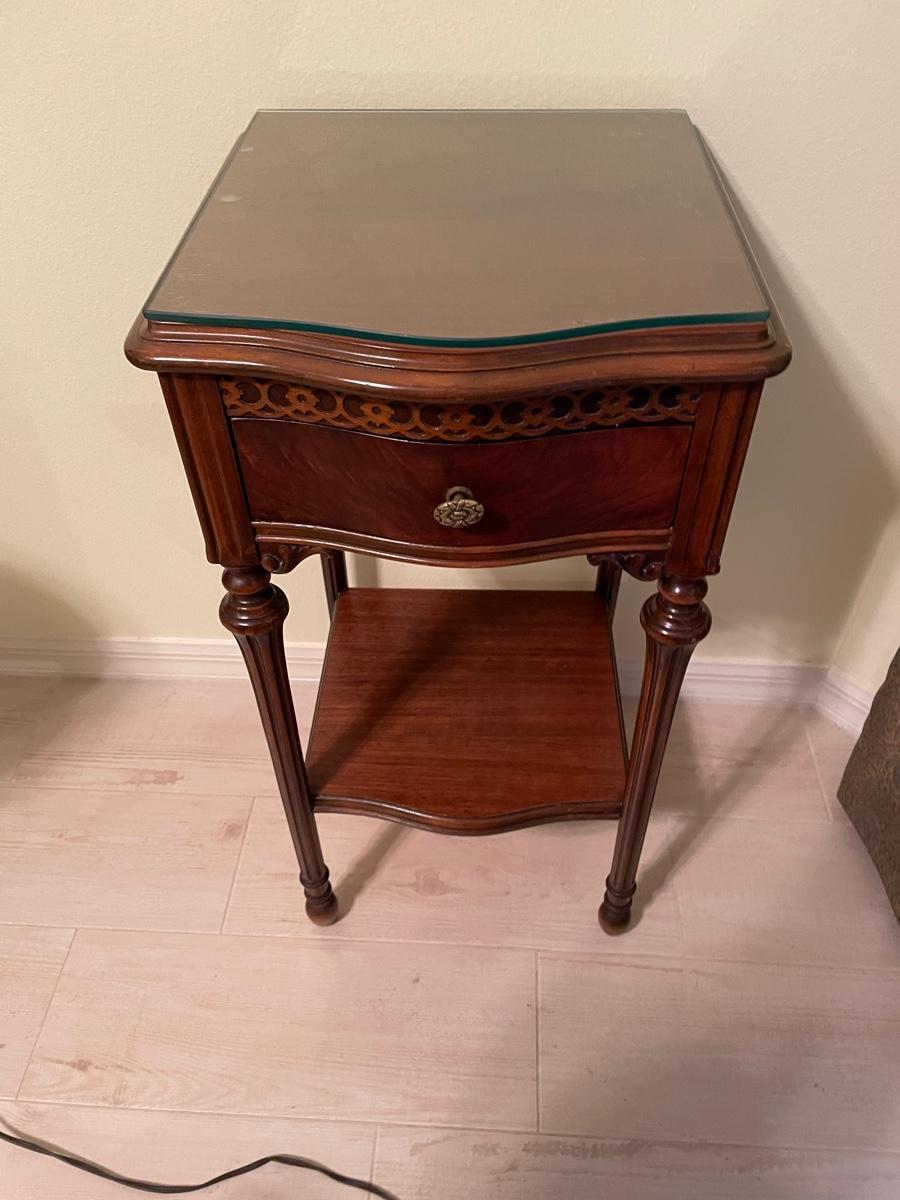 Beautiful dressing table/vanity with burl wood accents and mirror. Custom glass protector top. Excellent condition. Companion pieces listed in next lots