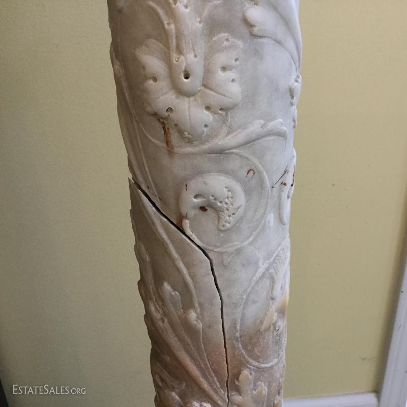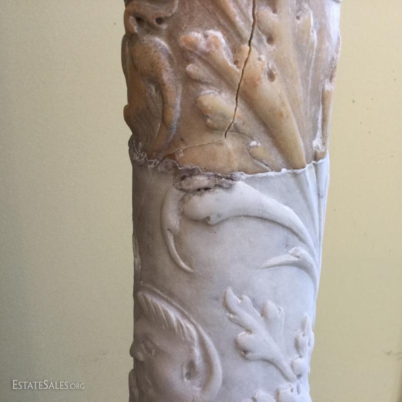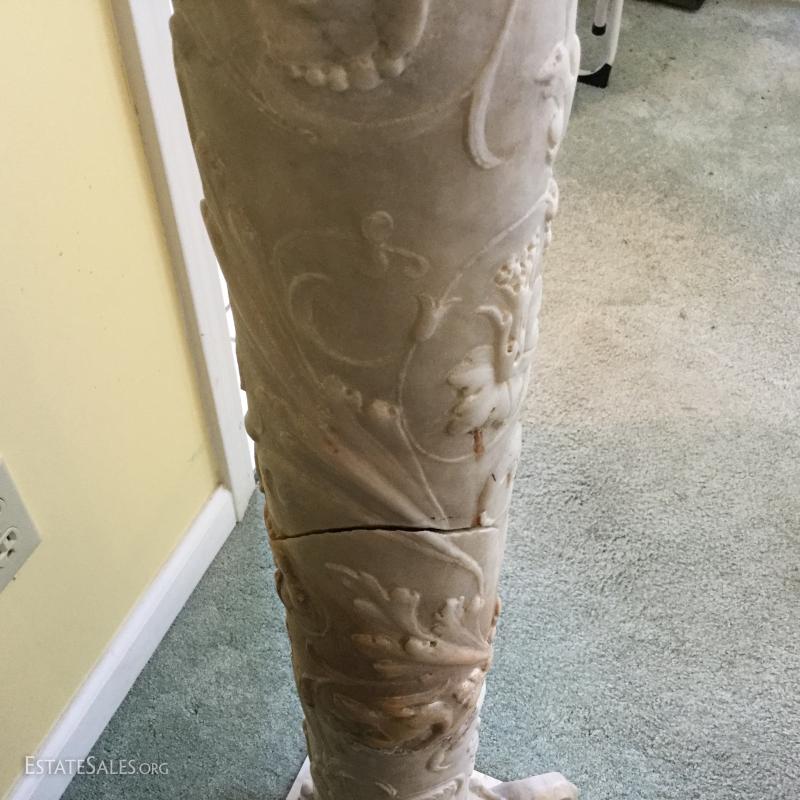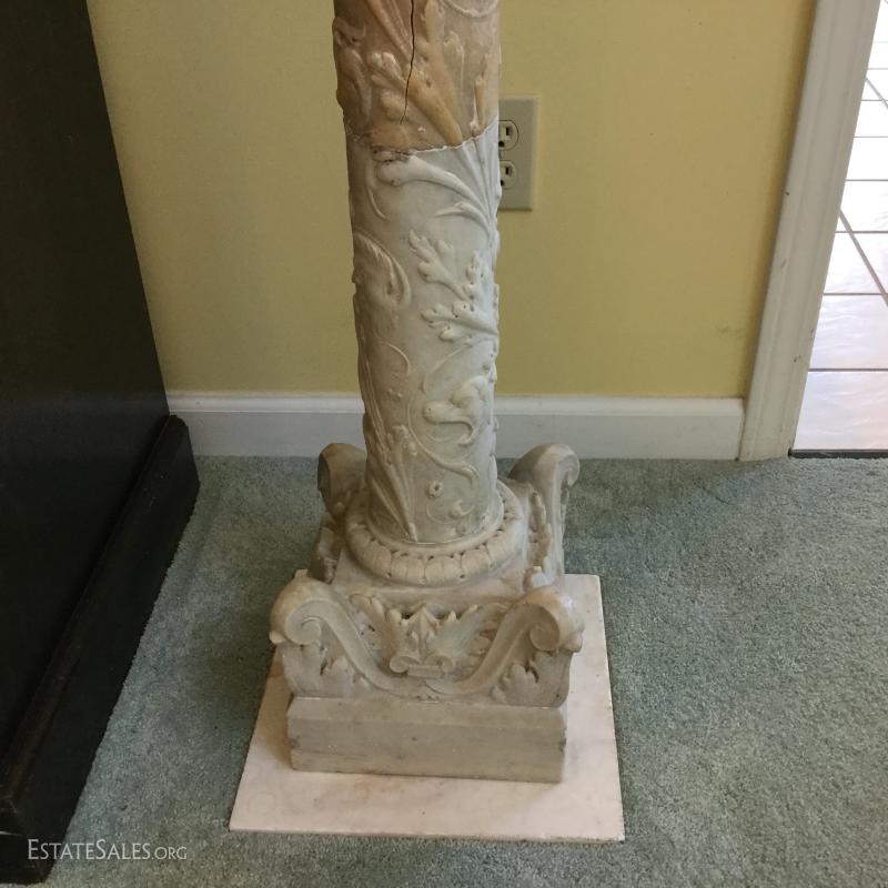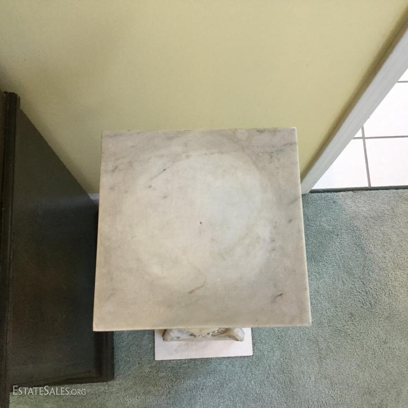 Marble pedestal stand sits on 12" detached marble square. Marble has some discoloration in center. Pedestal has been repaired but has a second crack. Probably not sturdy enough for weight unless repaired, though a nice accent piece in a room. Pedestal is 47" high with a 7.5" square top and 8.5" square bottom. See photos for details.