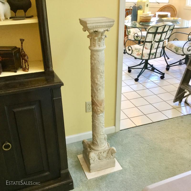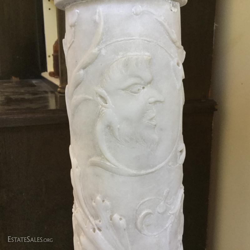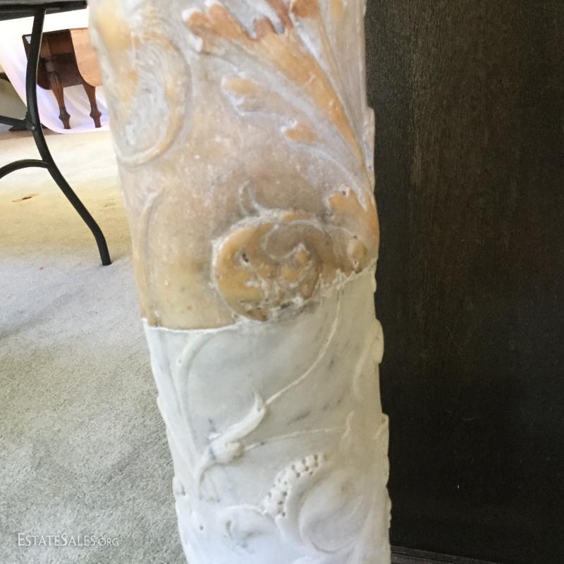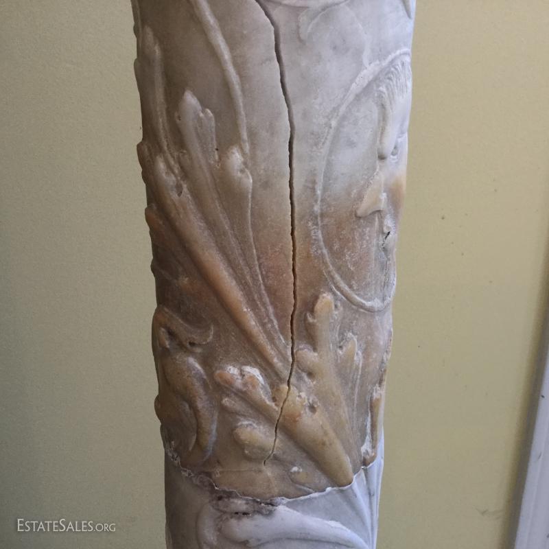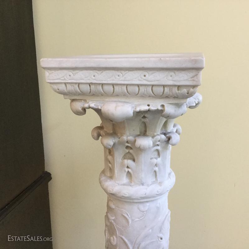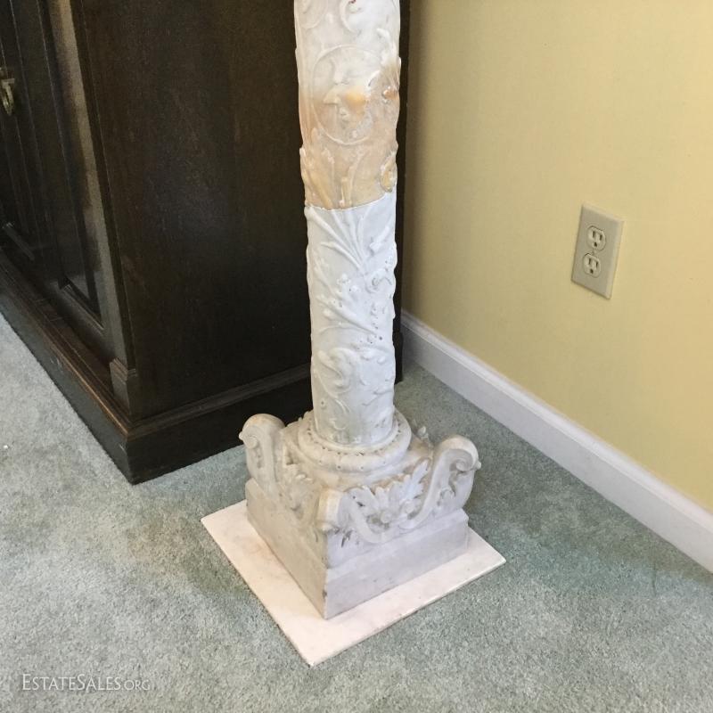 Marble pedestal stand sits on 12" detached marble square. Marble has some discoloration in center. Pedestal has been repaired but has a second crack. Probably not sturdy enough for weight unless repaired, though a nice accent piece in a room. Pedestal is 47" high with a 7.5" square top and 8.5" square bottom. See photos for details.
