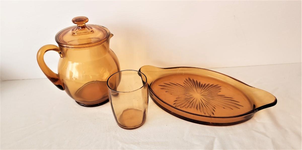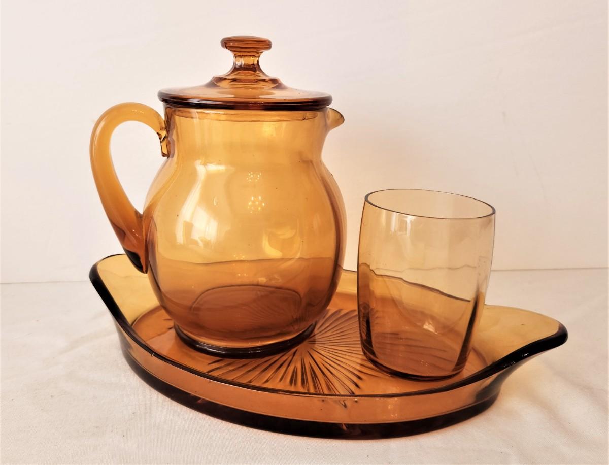 It is so rare to find a complete set in good condition - 3 piece (pitcher, glass, tray) bedside carafe set, 1940's. Pitcher is 6" tall, tray 10" long.