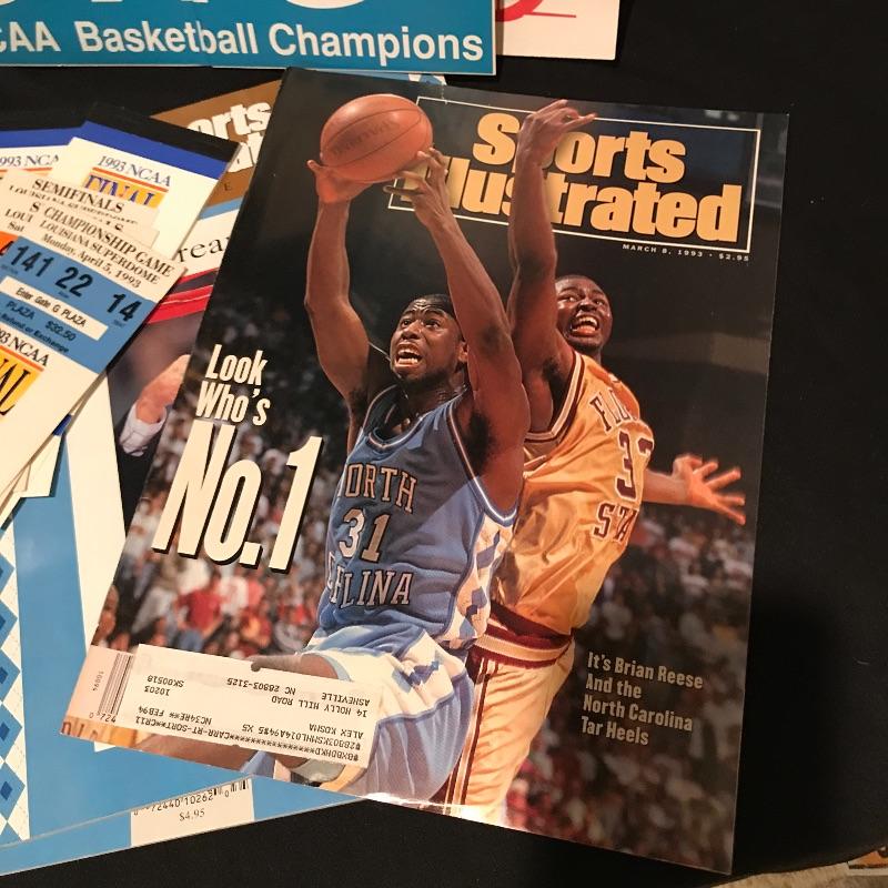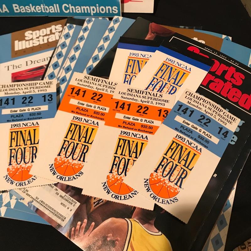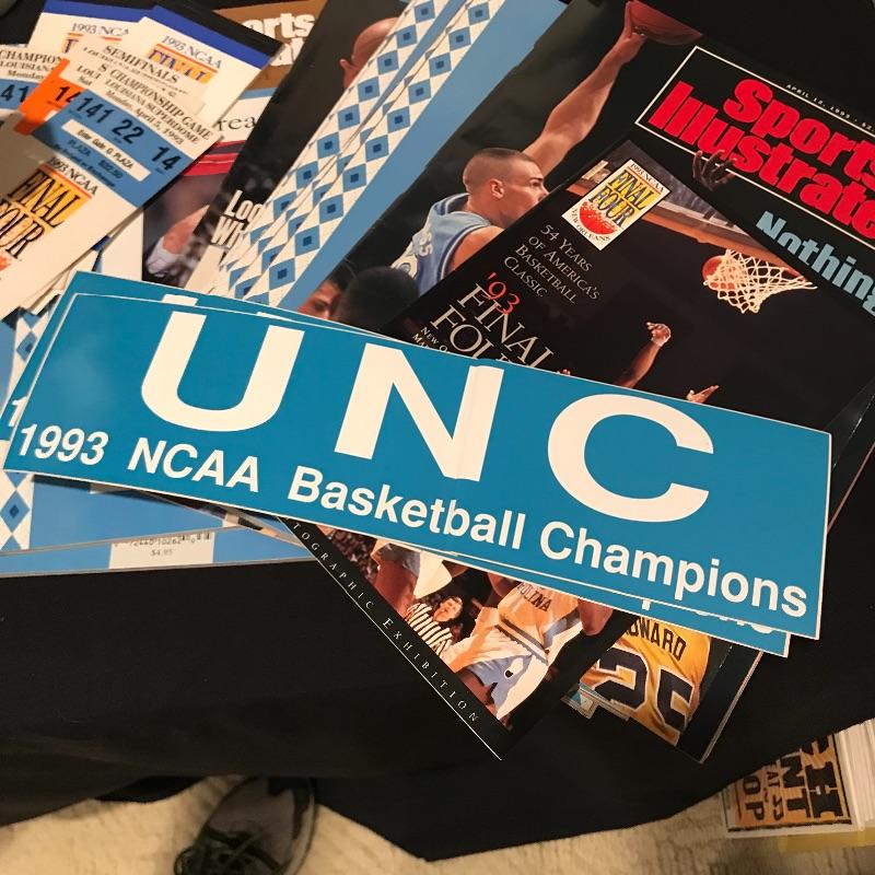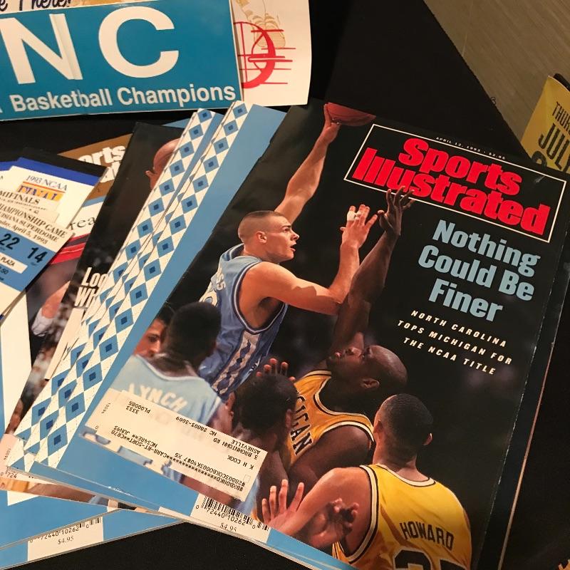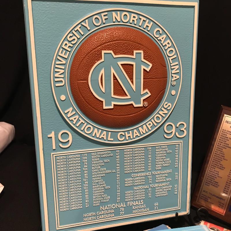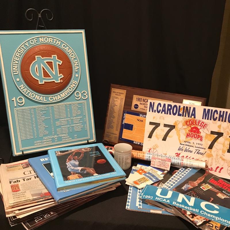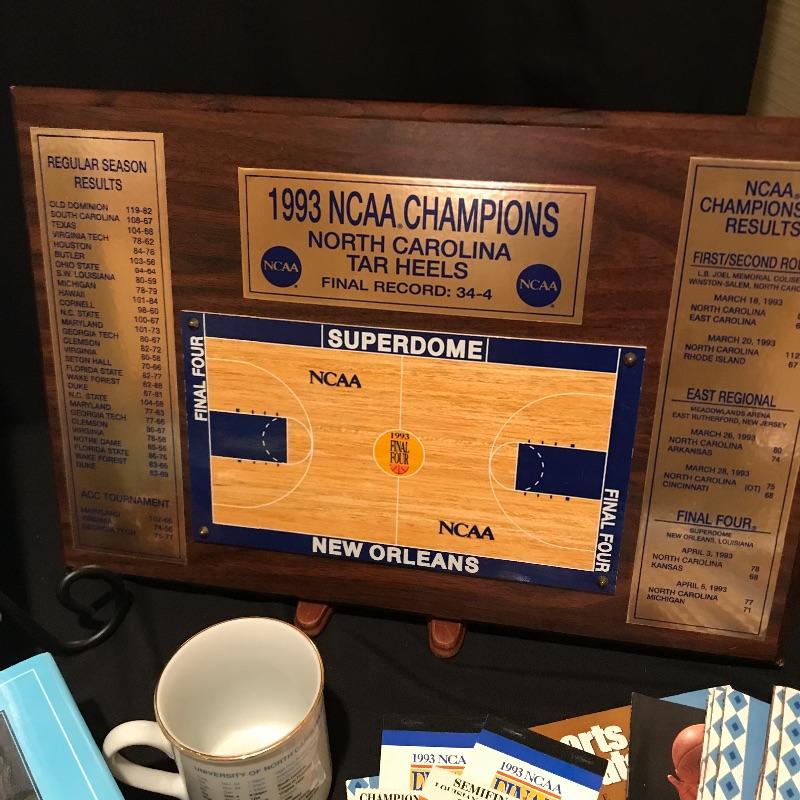 Lot includes many different items commemorating the 1993 NCAA Final Four Championship, including two plaques(large blue measures 20" x 14"), magazines, Season of Dreams book, Return to the Top book, Sports Illustrated magazines, a mug, bumper stickers and tickets. Shipping is available, please contact UPS at 828-252-6930 for shipping quote prior to bidding.