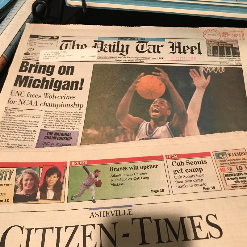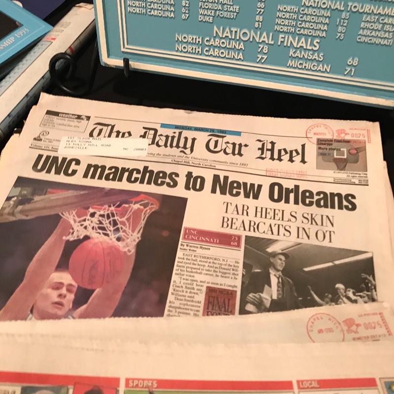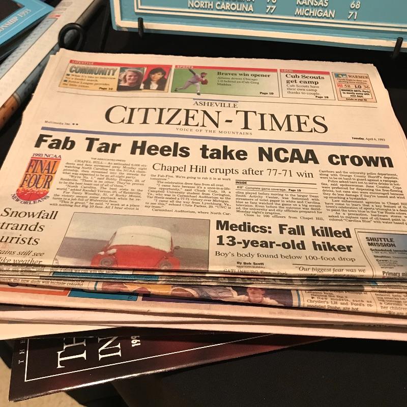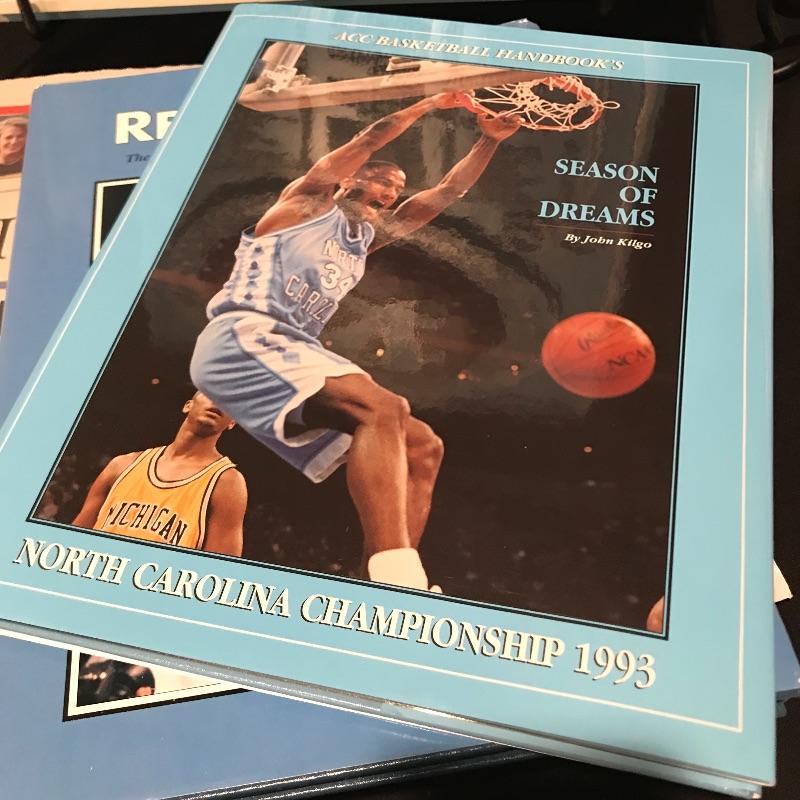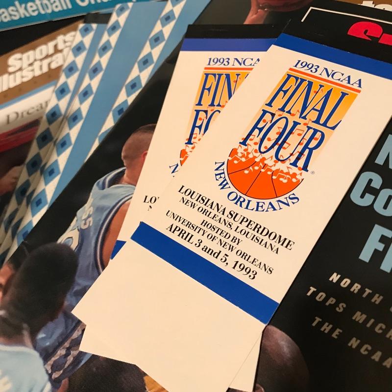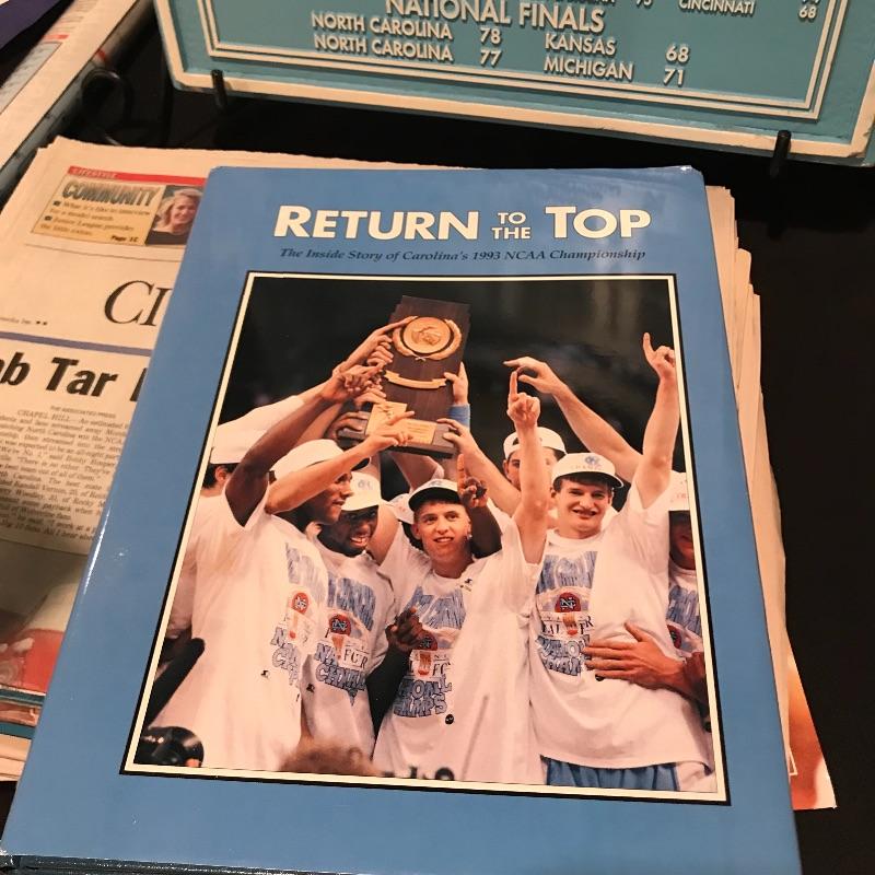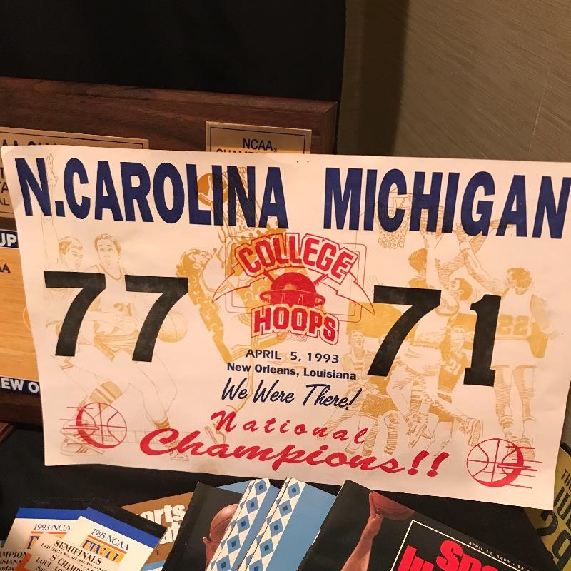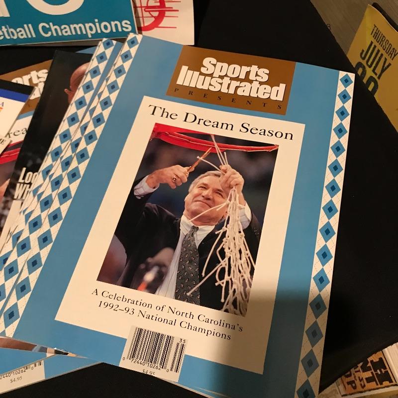 Lot includes many different items commemorating the 1993 NCAA Final Four Championship, including two plaques(large blue measures 20" x 14"), magazines, Season of Dreams book, Return to the Top book, Sports Illustrated magazines, a mug, bumper stickers and tickets. Shipping is available, please contact UPS at 828-252-6930 for shipping quote prior to bidding.