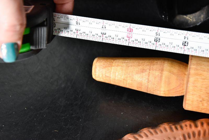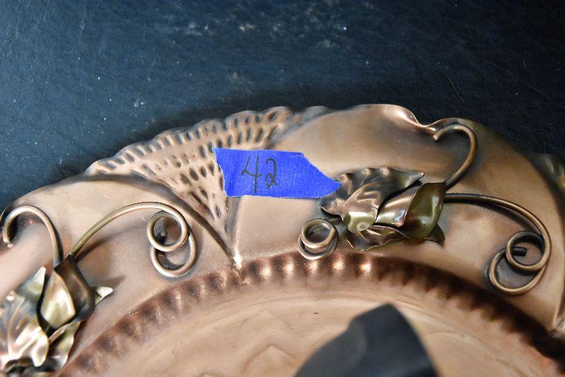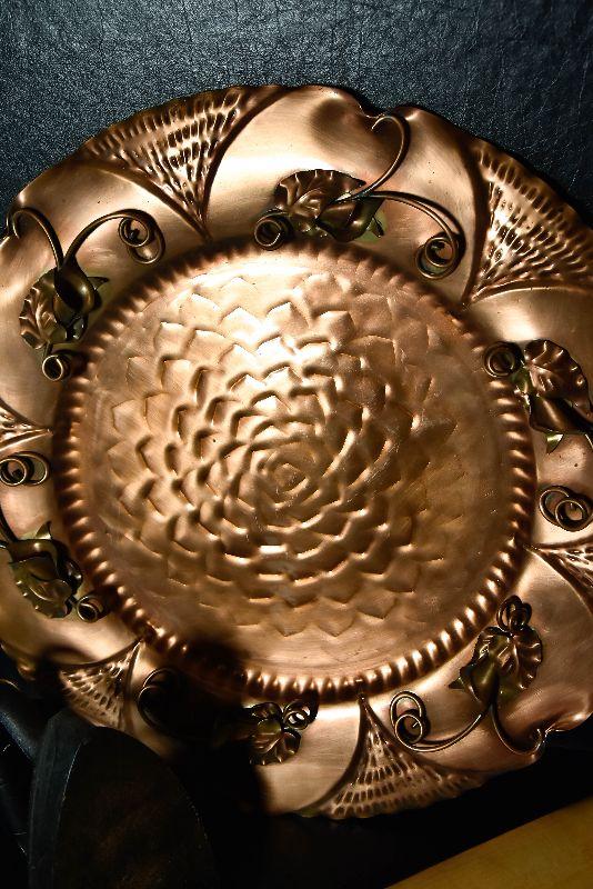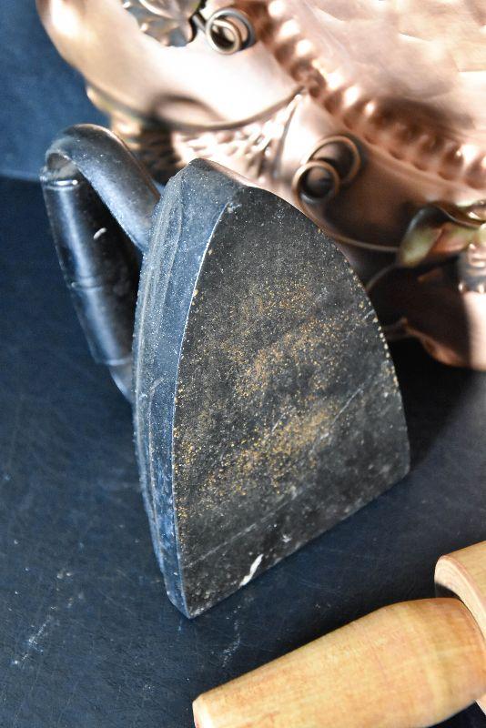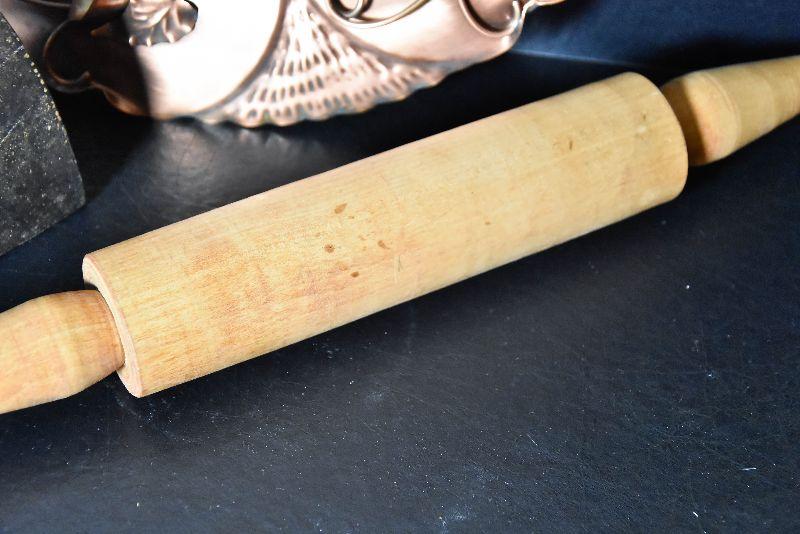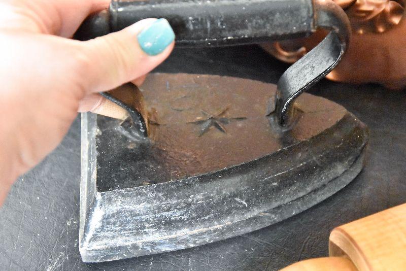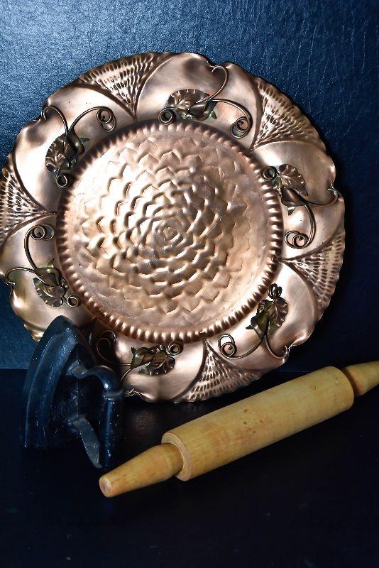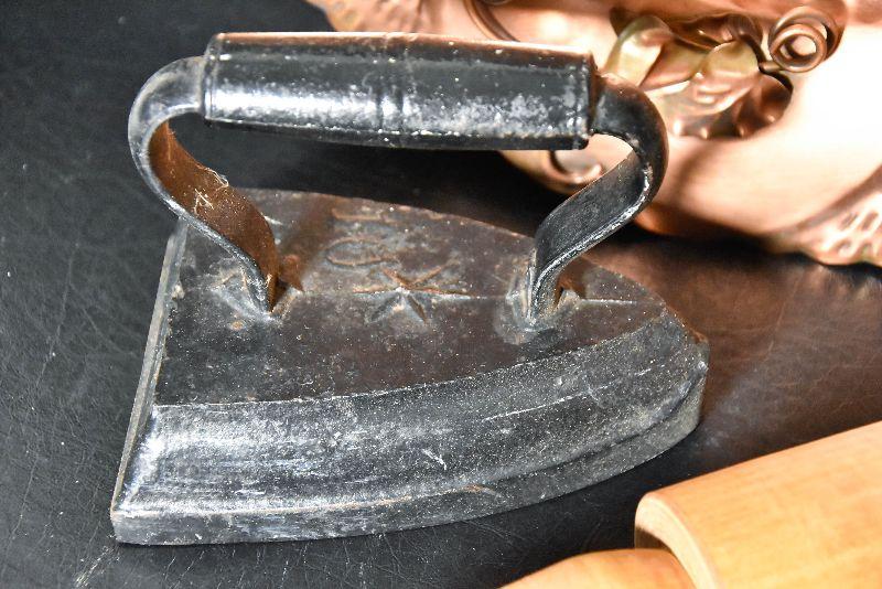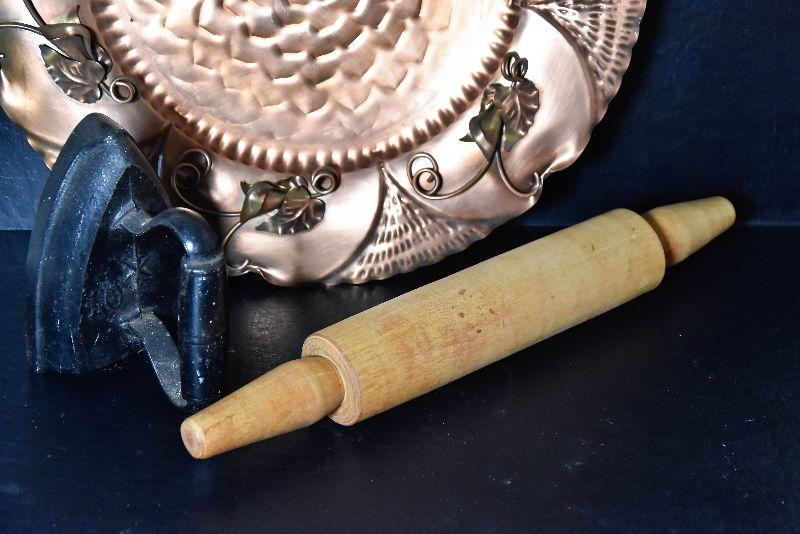 Wooden rolling pin, sad iron and a copper, decorative flower platter.