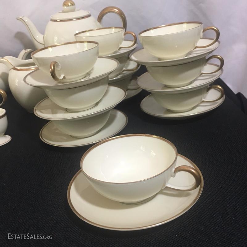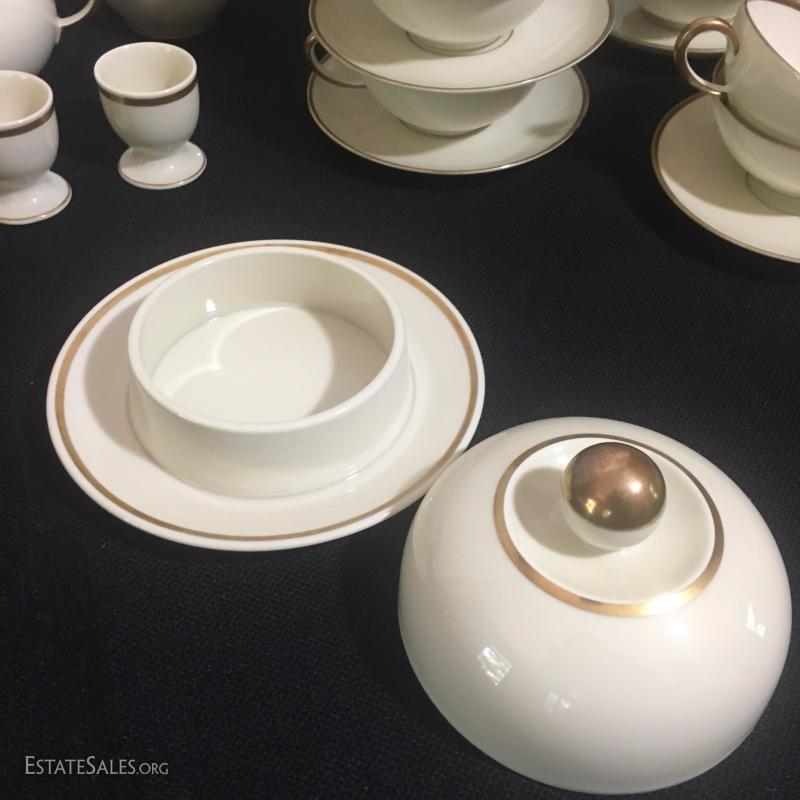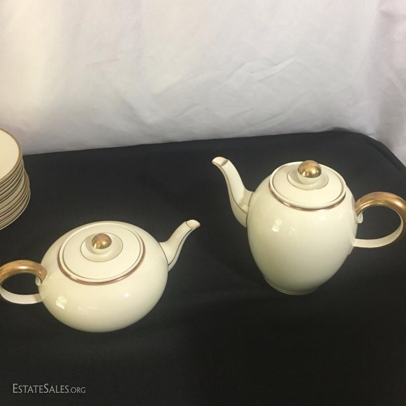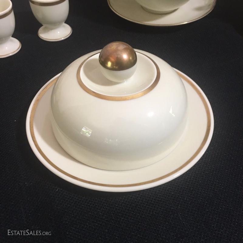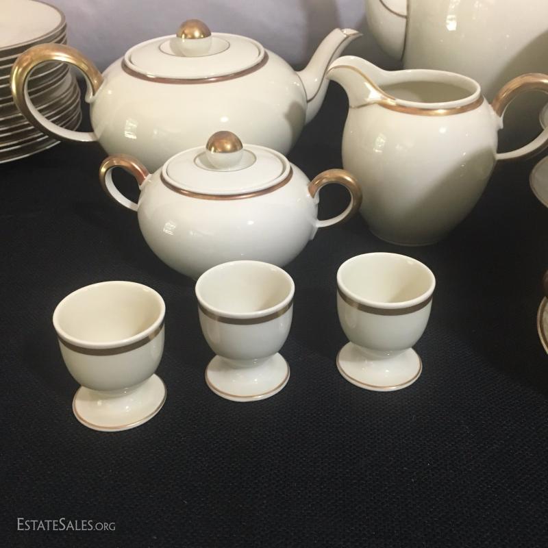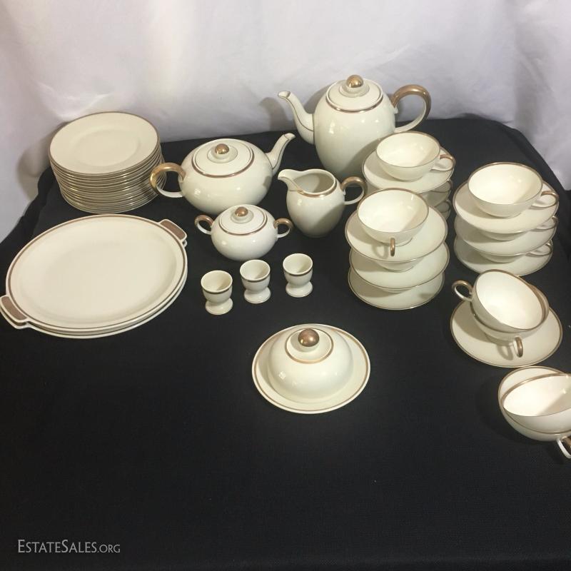 49 pic china desert set by Volkstedt Elfenbein. Beige with gold rim. Good condition as barely used. See photos.