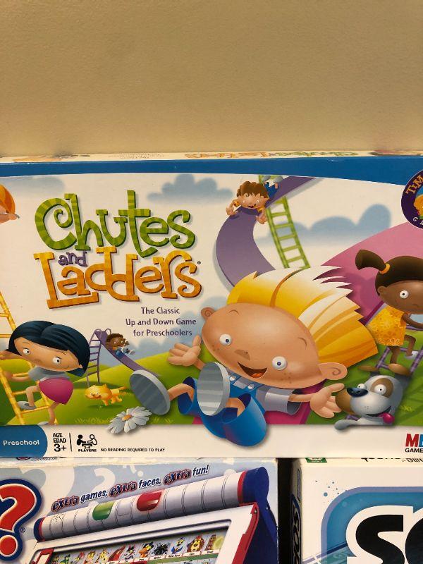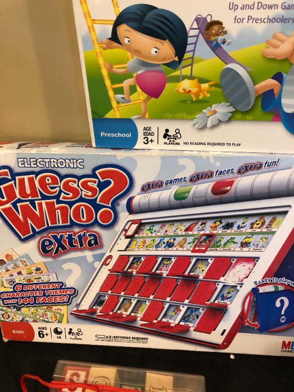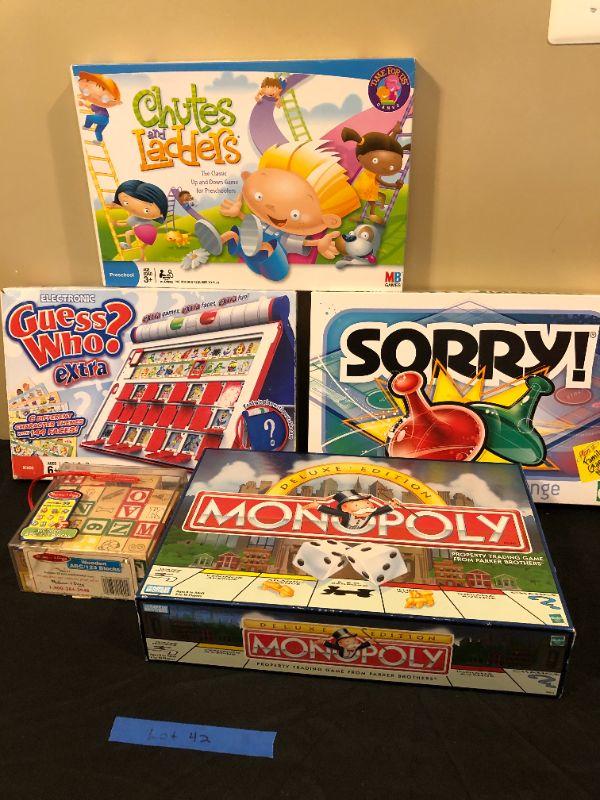 Board Games including Deluxe Edition of Monopoly, Sorry, Guess Who (Electronic Version), Chutes and Ladders and Wooden ABC/123 Blocks
