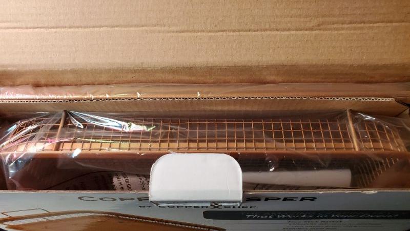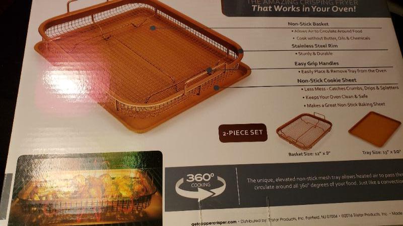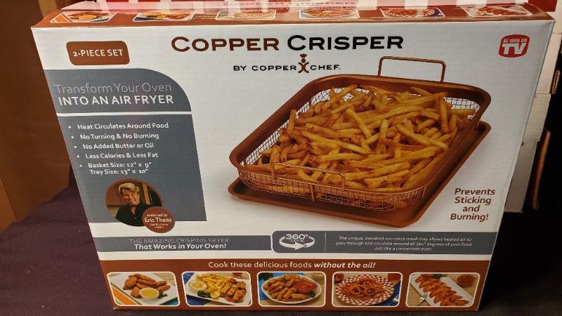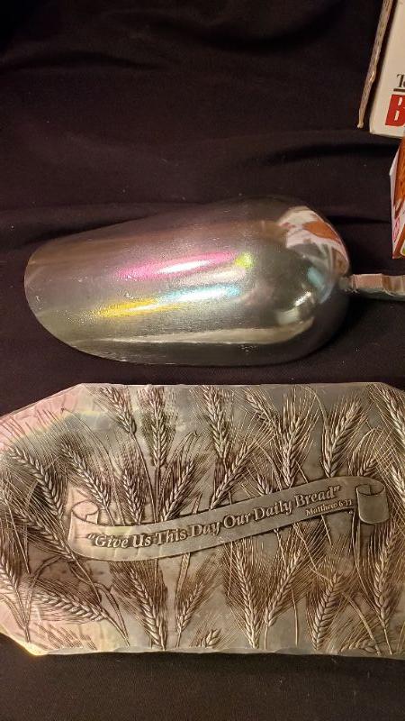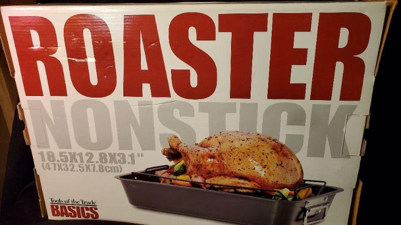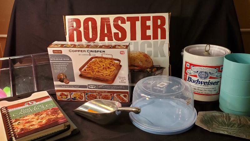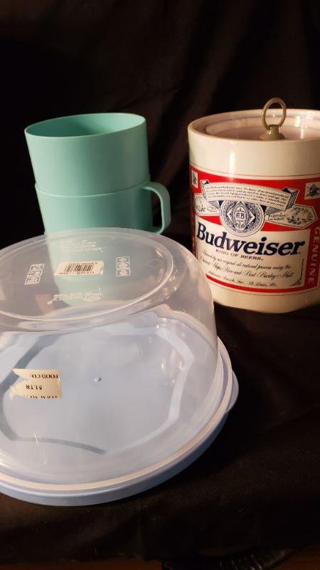 Roasting pan, a Copper Crisper, a Budweiser ice bucket, a new, large size scoop, an alunimun tray, plastic stacking mugs, and a cake keeper.