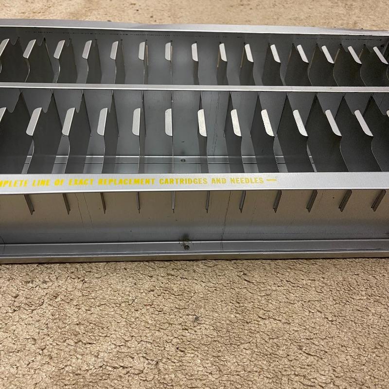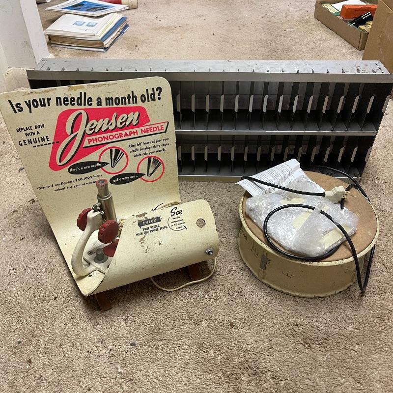 This lot is made up of three display items including a Jensen phonograph needle scope. The 28.5 inch long metal rack is good for cassette storage. The last item is a Garrard display turntable, GDT3 model.