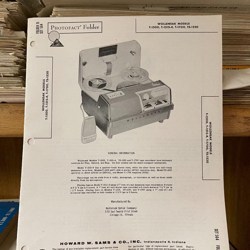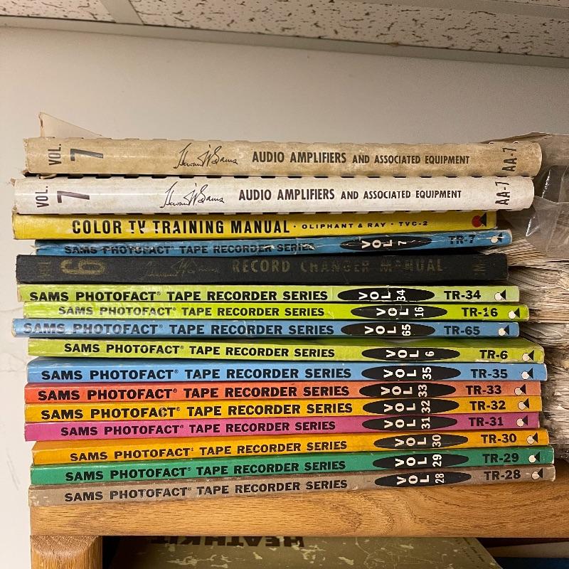 Wide assortment of various manuals. There are over 10 Sam’s Photofact Tape Recorder Series volumes and manuals for radios, record players, and many other electronic items.