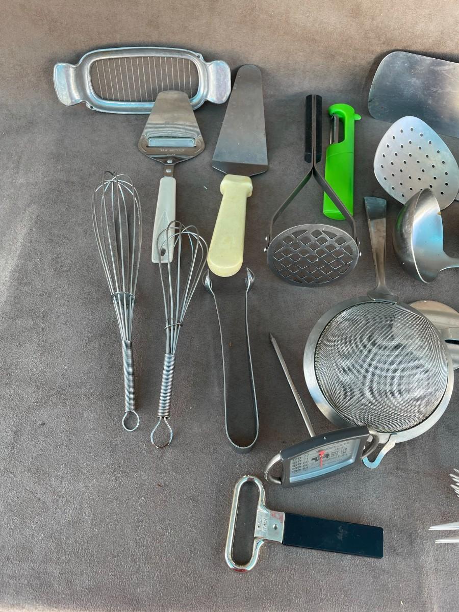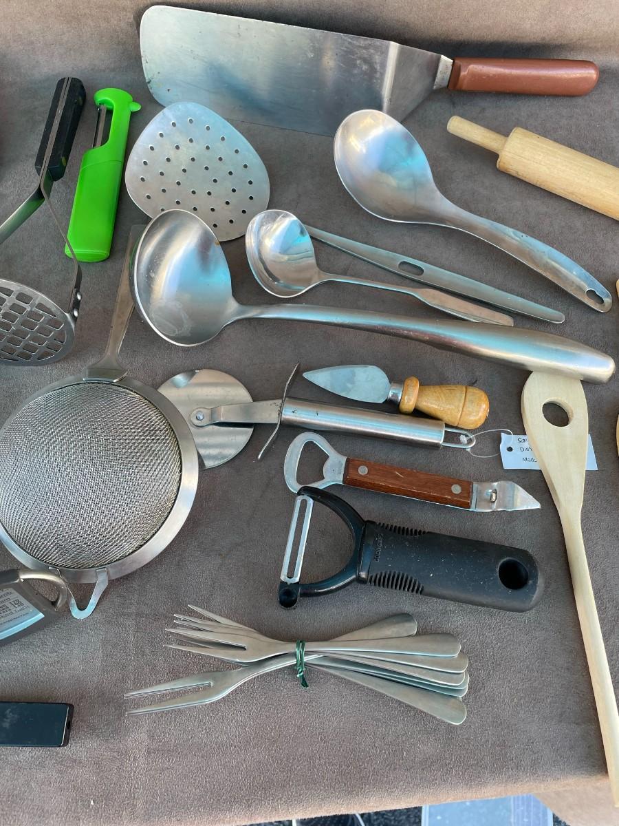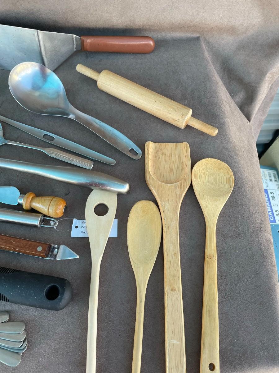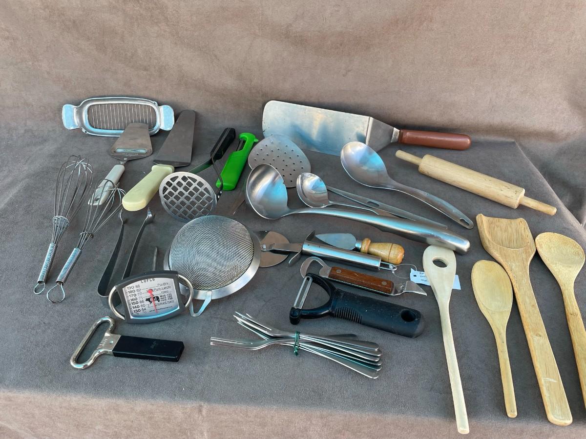 Butter cutter, wooden spoons, peeler, large serving spoons, small rolling pin, bottle opener, whisks, and more.