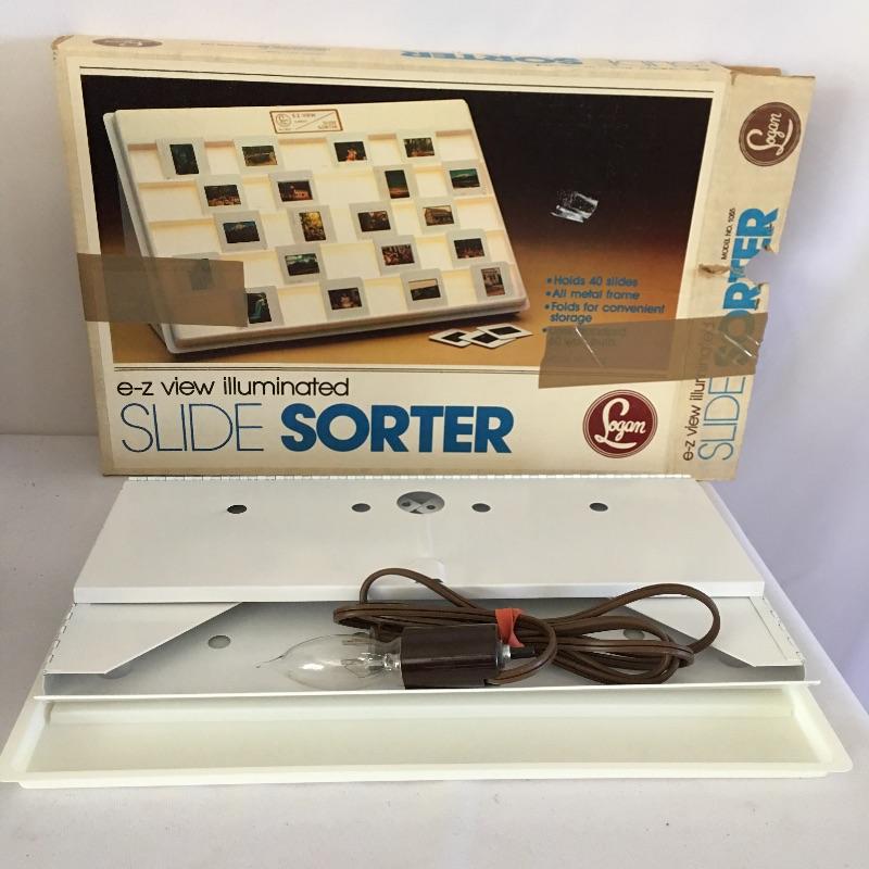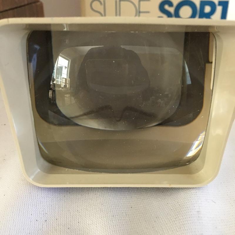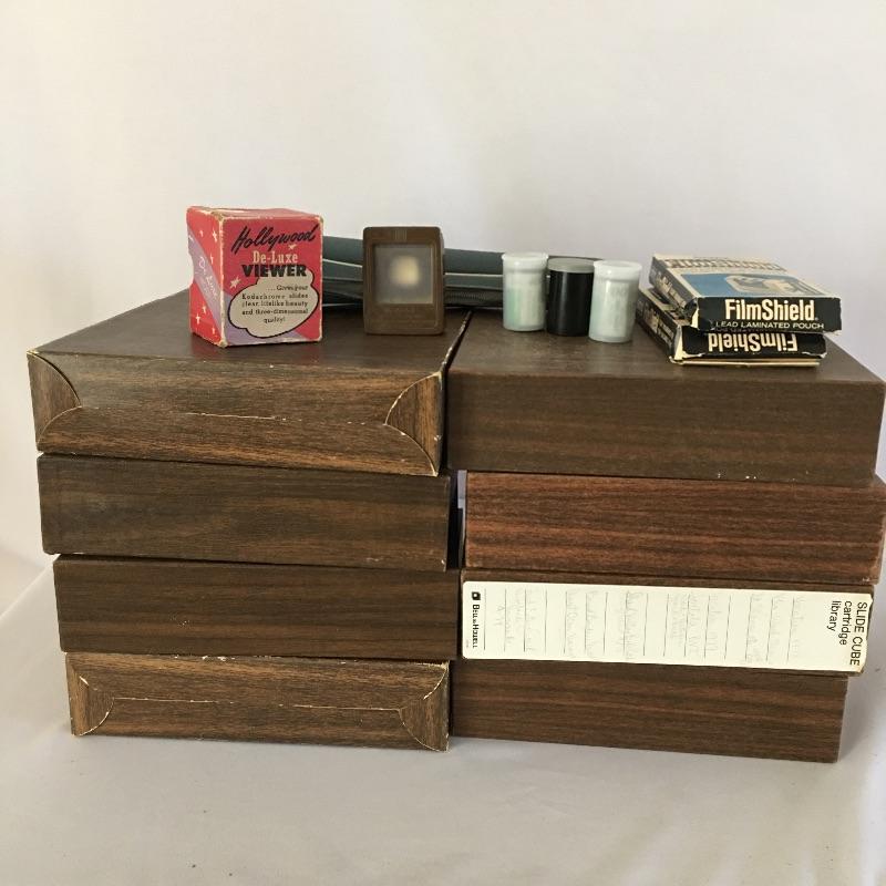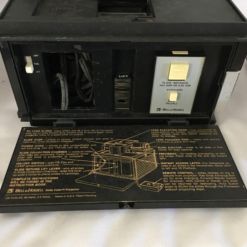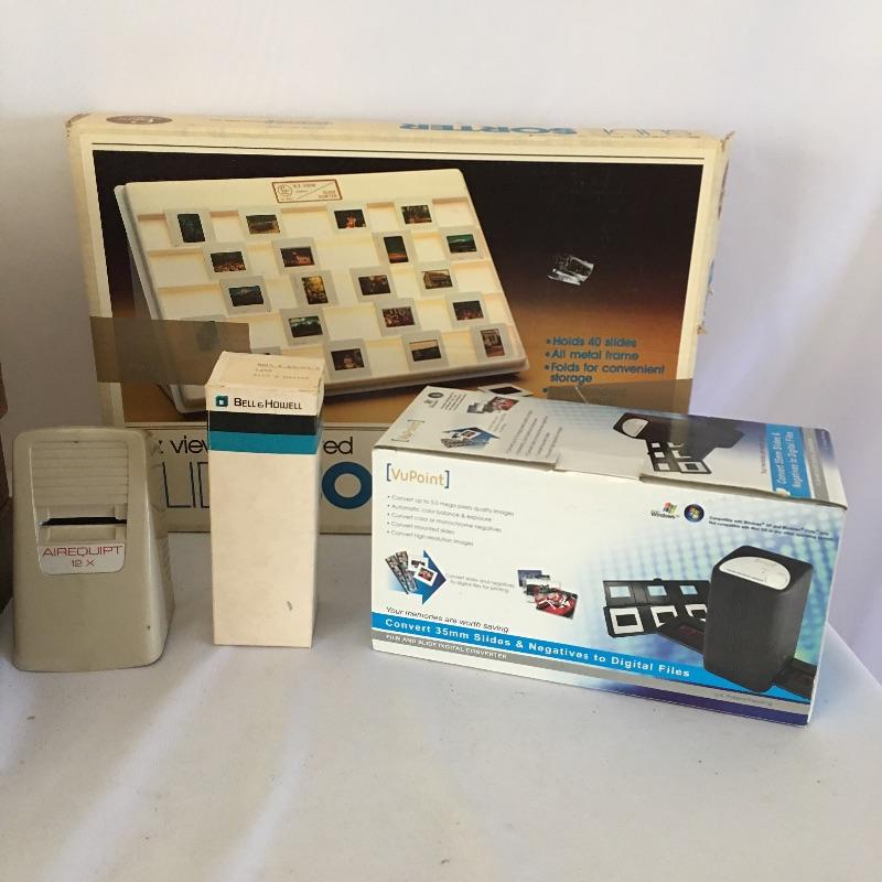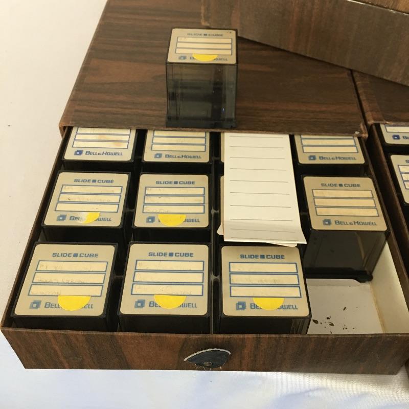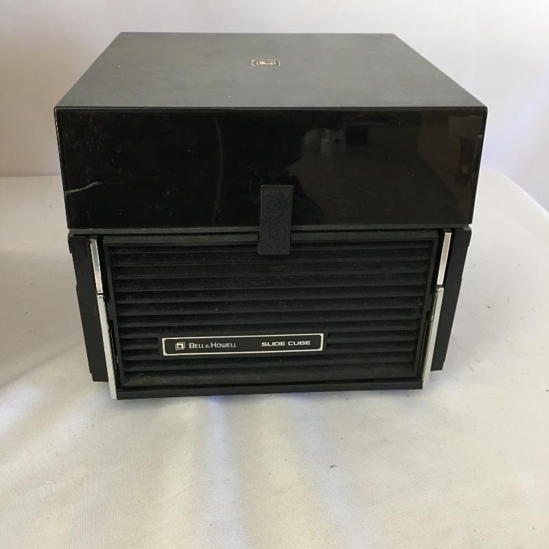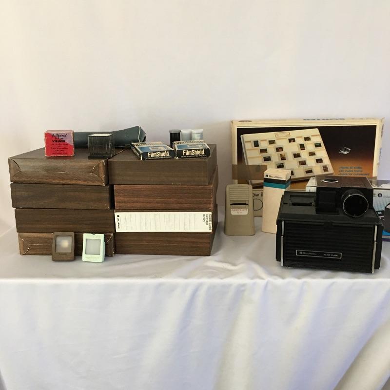 Perfect your old fashioned experience with this vintage lot! We’ve included a Bell and Howell slide cube projector with 128 slide cubes in cases, slide viewer, film shield, slide to digital converter, small tripod and more. Projector worked when tested.