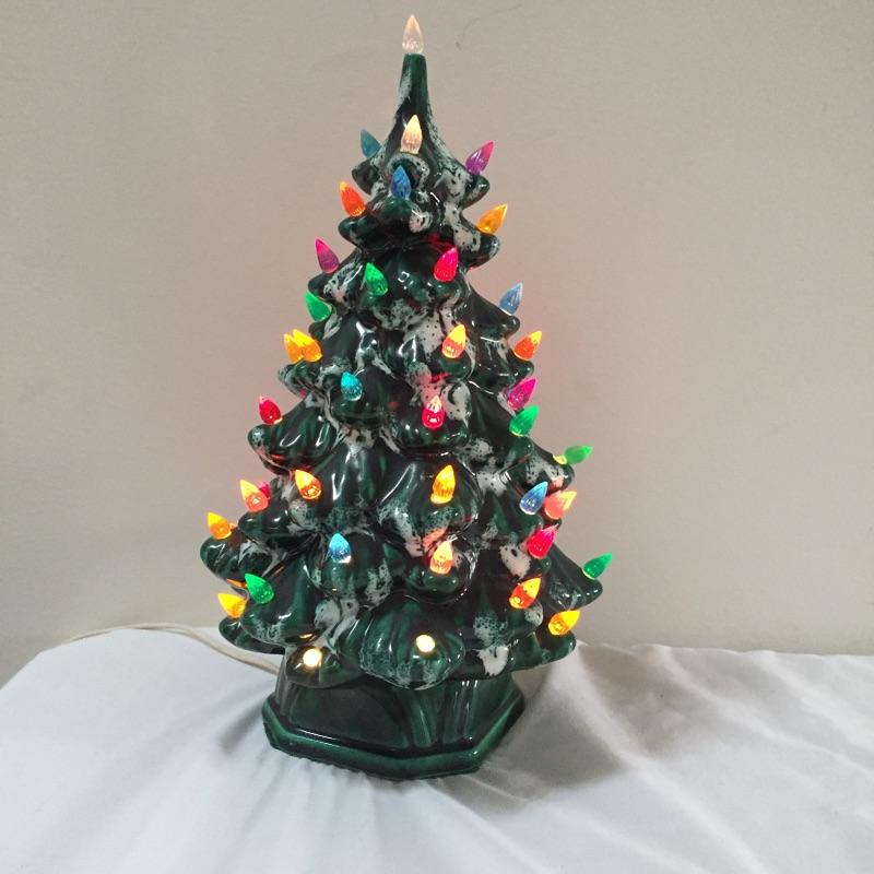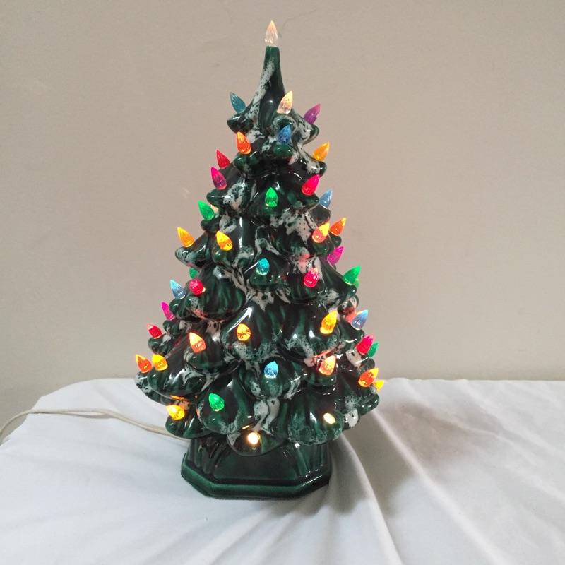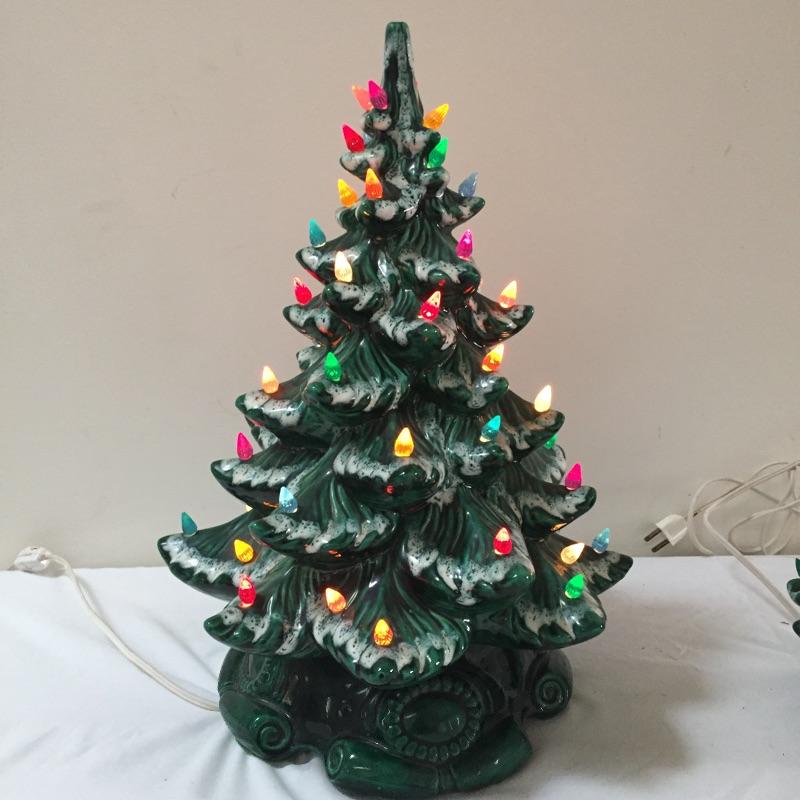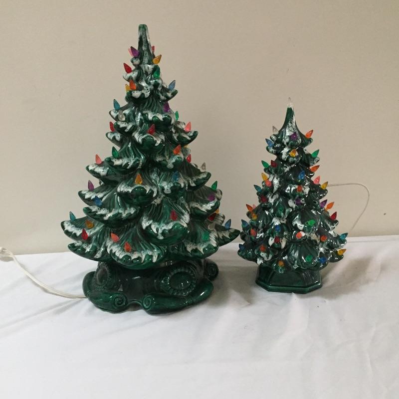 Delightful pair of Ceramic Christmas trees. Both trees light up when plugged in and have extra colored lights. All lights appear to be in tact. Largest tree measures 16” tall. Light up your next Christmas. Shipping available.