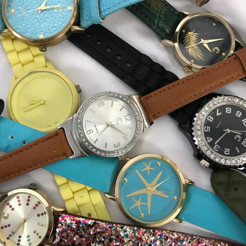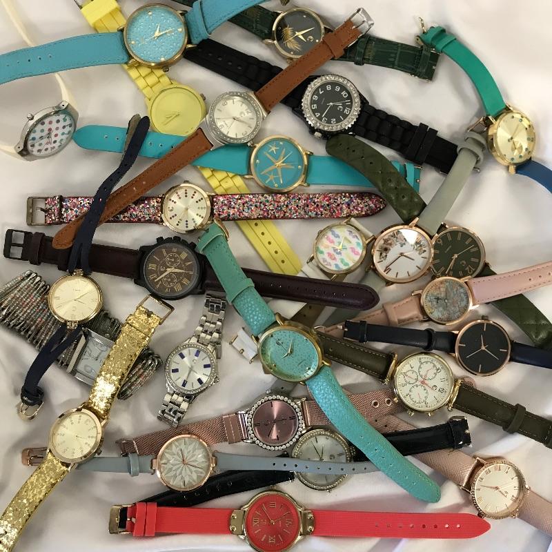 Charming Charlie watch collection. The collection includes twenty six Charming Charlie watches in oodles of colors, styles and materials. Watches all appear to need batteries.