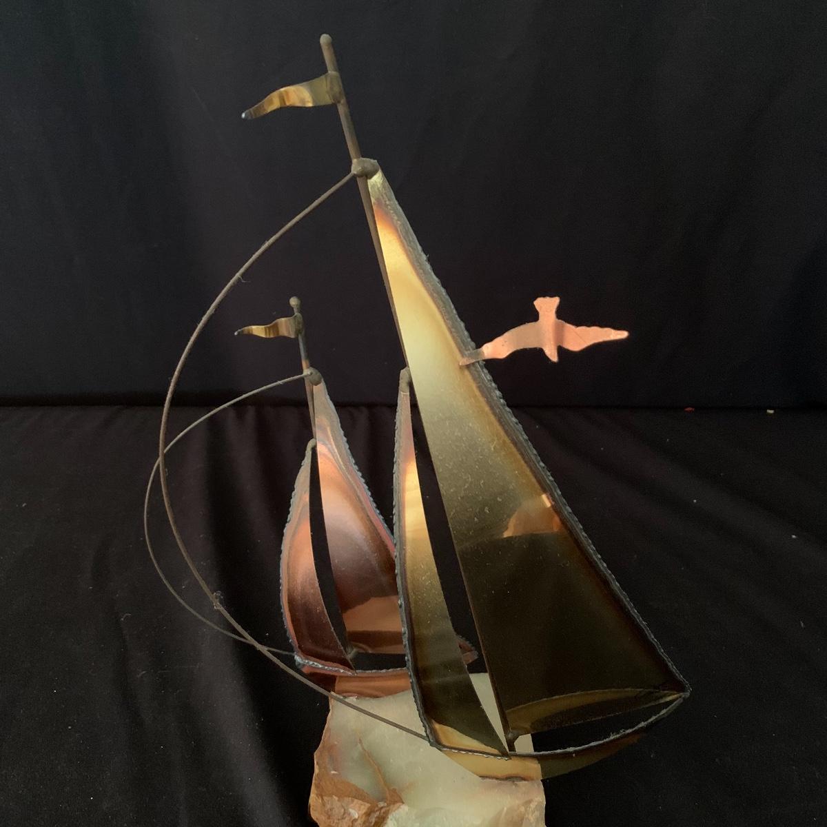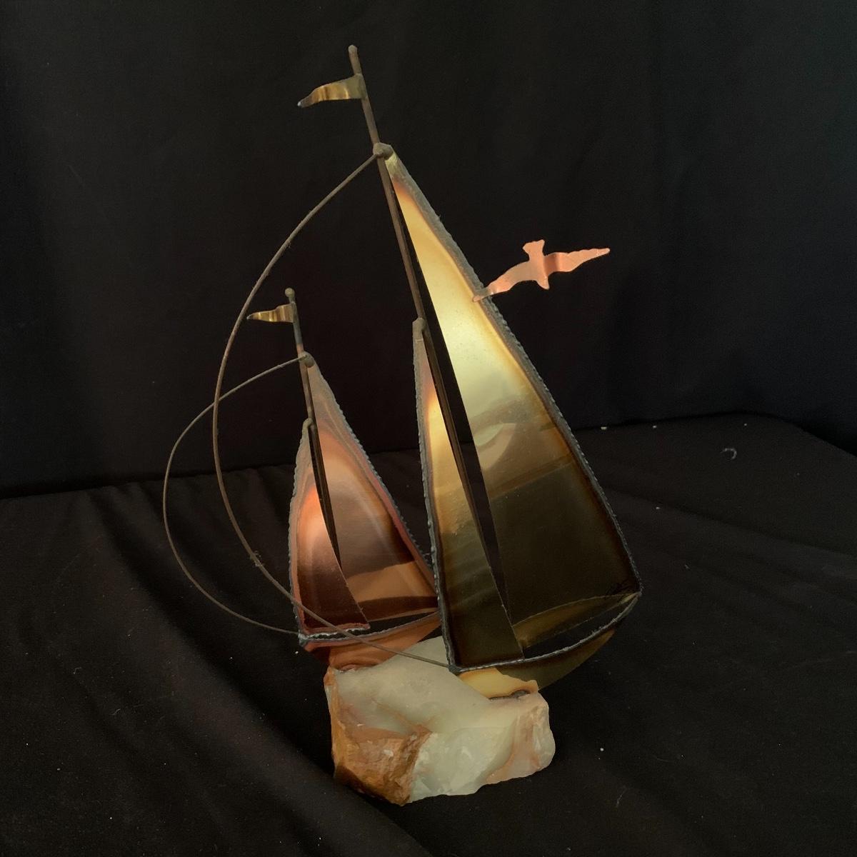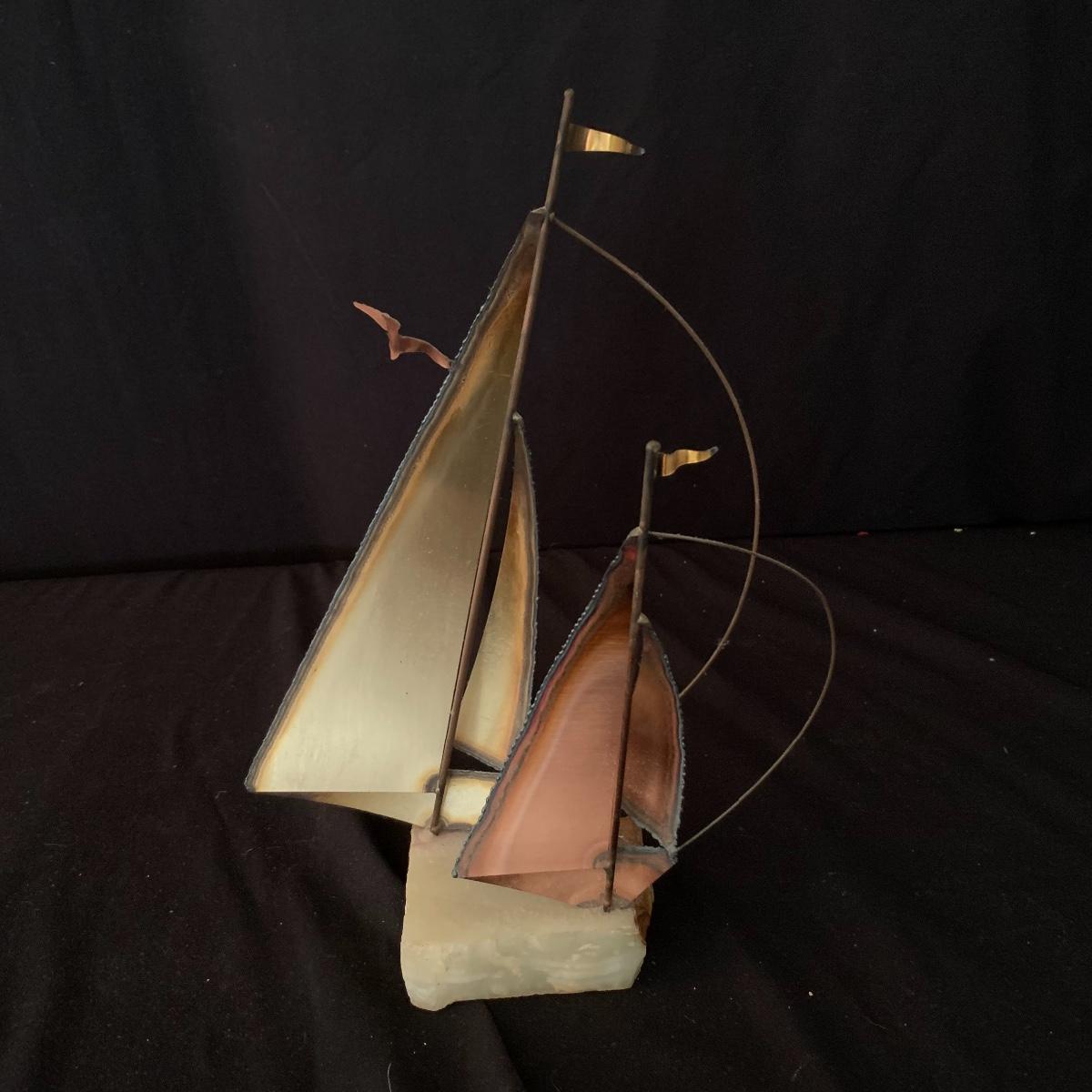 Lot includes one Mario Jason nautical brass sailboat sculpture on a green onyx base. The sculpture is signed and has two metal sailboats attached to the base. Sailboat piece measures 3.5” x 9” x 14”. Shipping Available