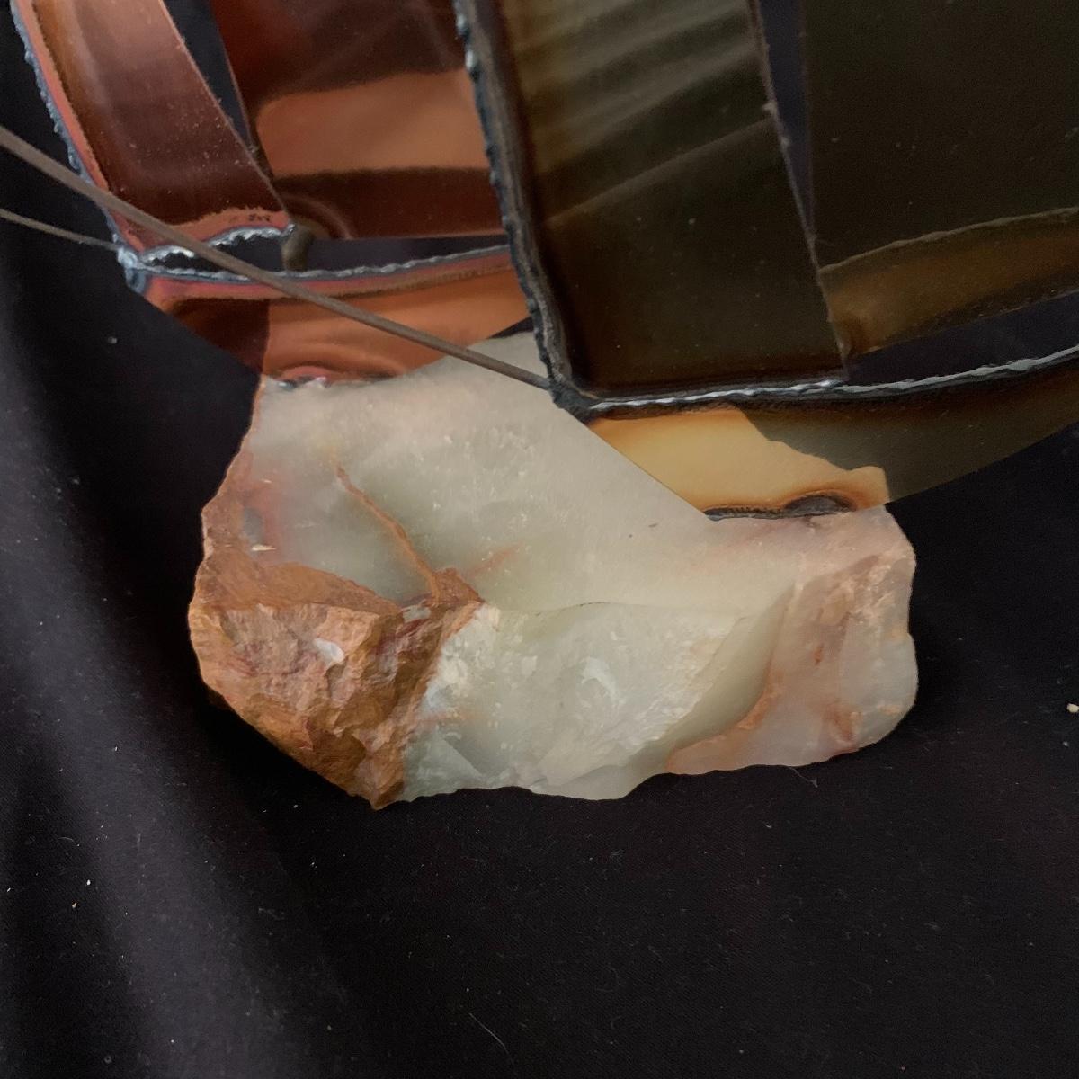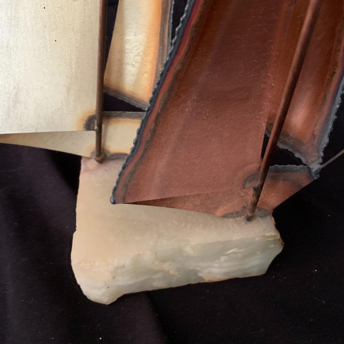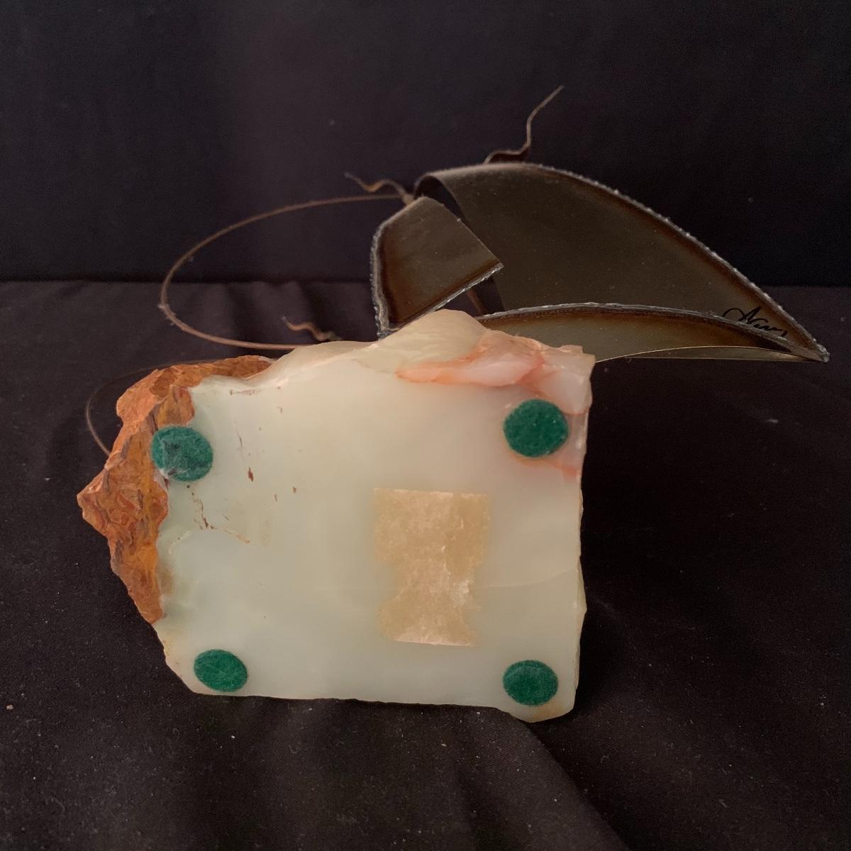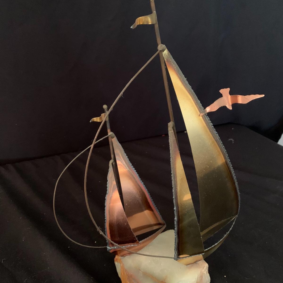 Lot includes one Mario Jason nautical brass sailboat sculpture on a green onyx base. The sculpture is signed and has two metal sailboats attached to the base. Sailboat piece measures 3.5” x 9” x 14”. Shipping Available