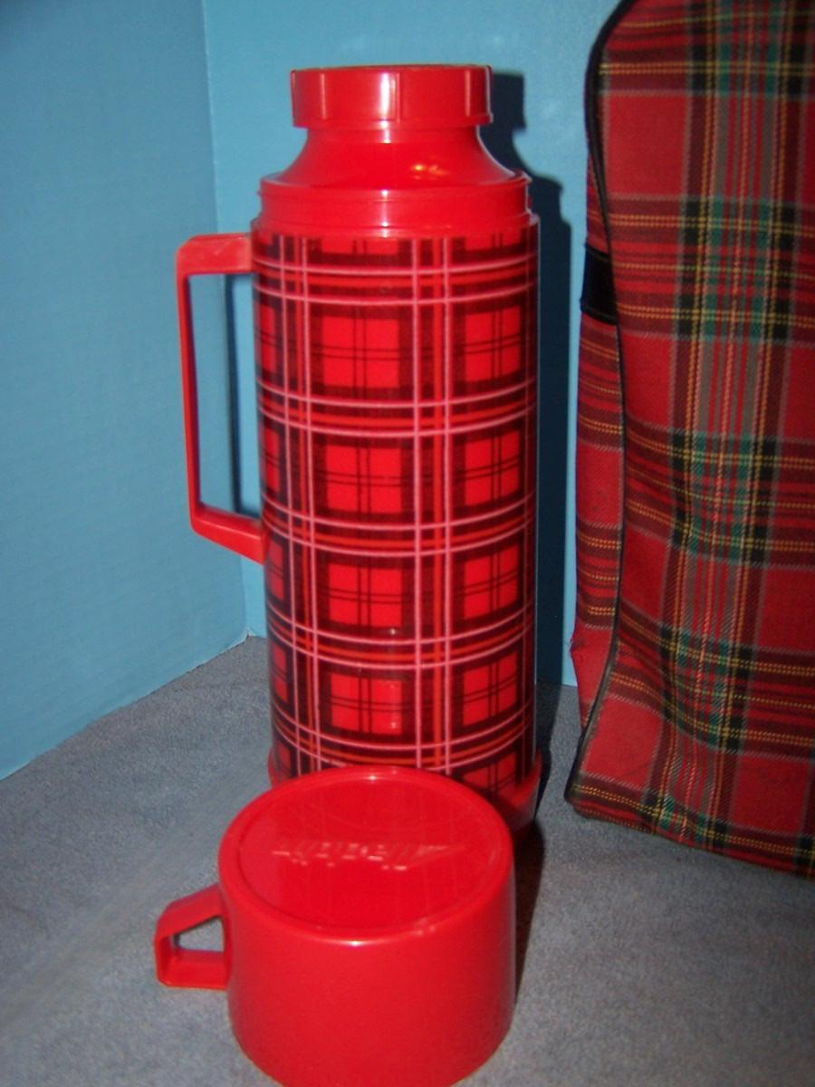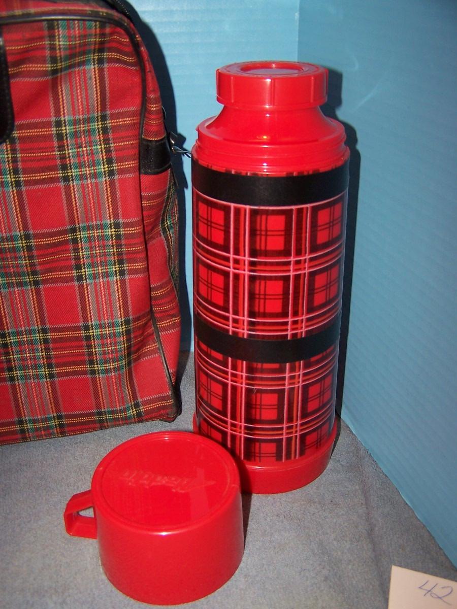 THIS IS A FABULOUS MID CENTURY ALADDIN RED PLAID PICNIC SET!!! IT HAS 2 THERMOSES-- 12'' TALL, AND A SANDWICH KEEPER.... EXCELLENT CONDITION!!!