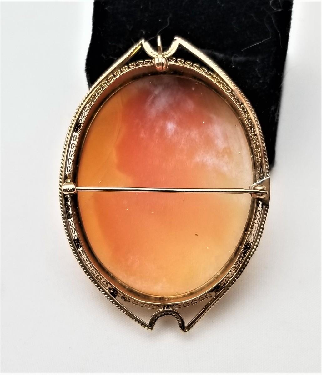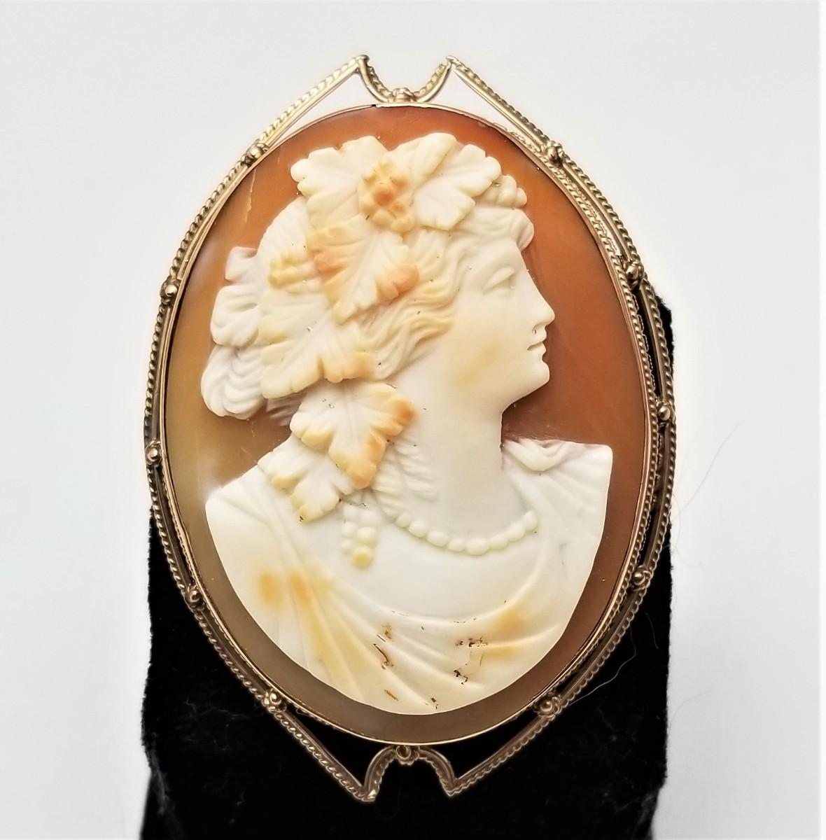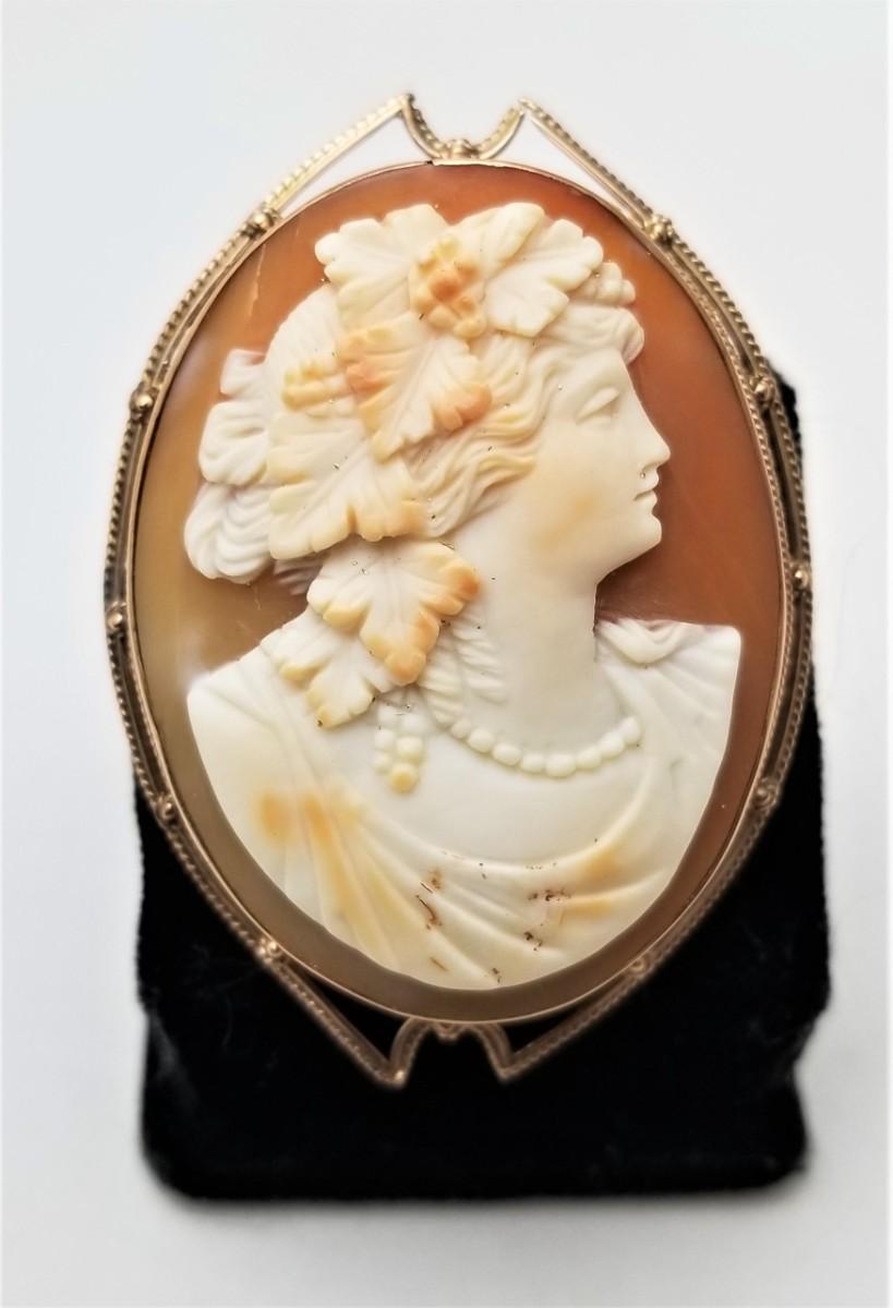 This cameo was carved by a Master around the year 1900 - set in a (marked) 10kt gold mount. Has a cunning little bail that comes up so you can also wear it as a necklace. Measures about 2.25" tall, and 1.5" across. Good antique condition. Clasp is secure.