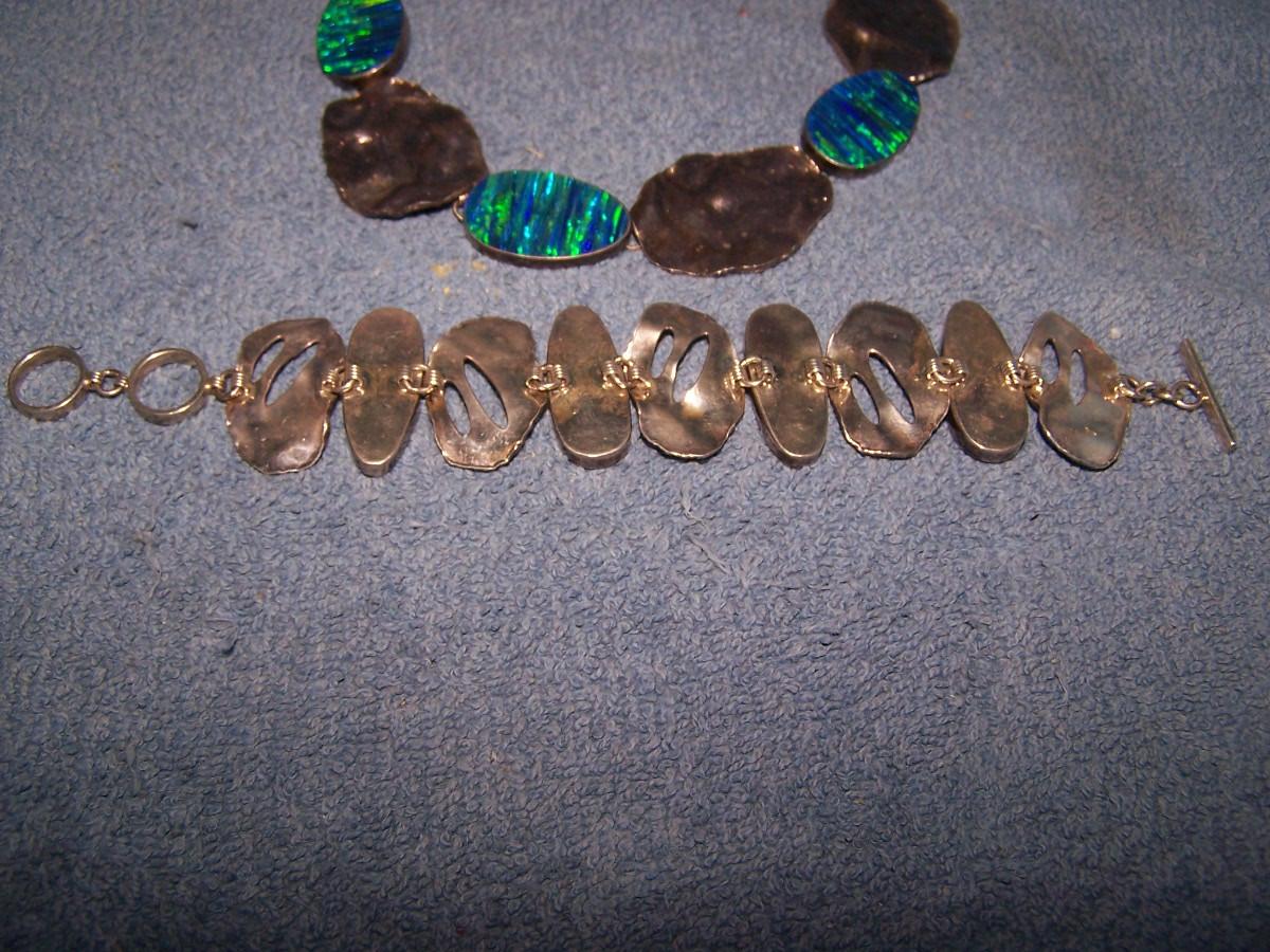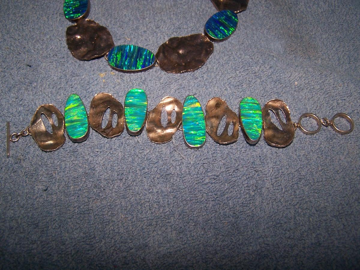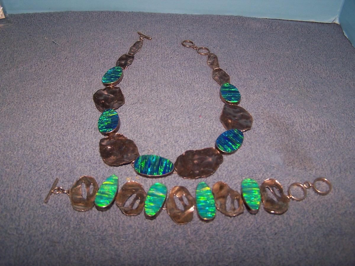 THIS IS A GRAND STERLING & OPAL NECKLACE & BRACELET SET. BOTH ARE MARKED-JS 925... LAB GROWN OPALS-GORGEOUS COLOR!!! NECKLACE-18 1/2'', BRACELET-7 3/4''... 89.49 GR TW.. SLIGHT WEAR..