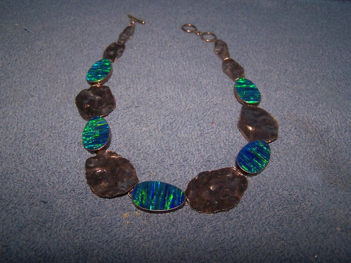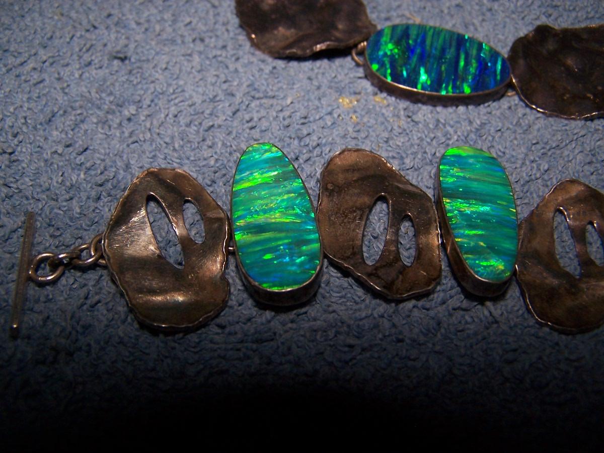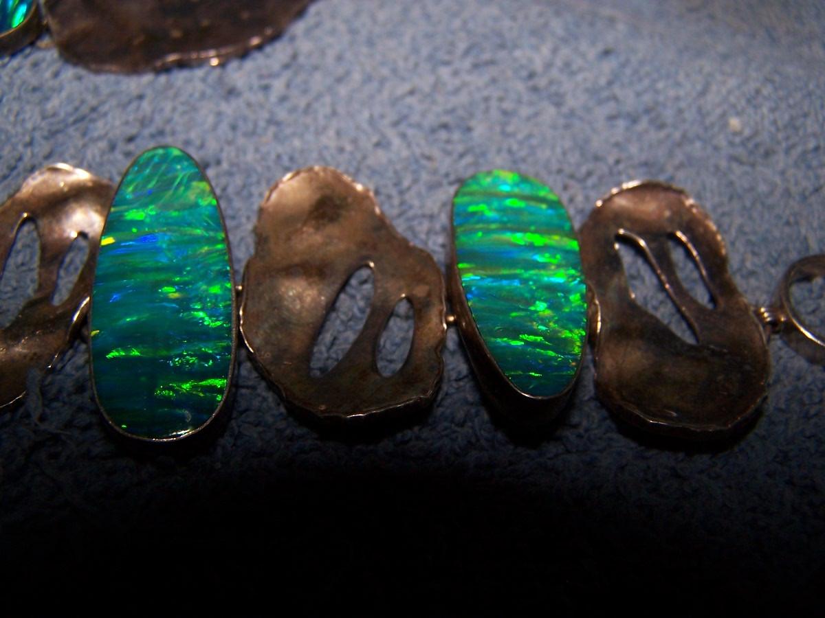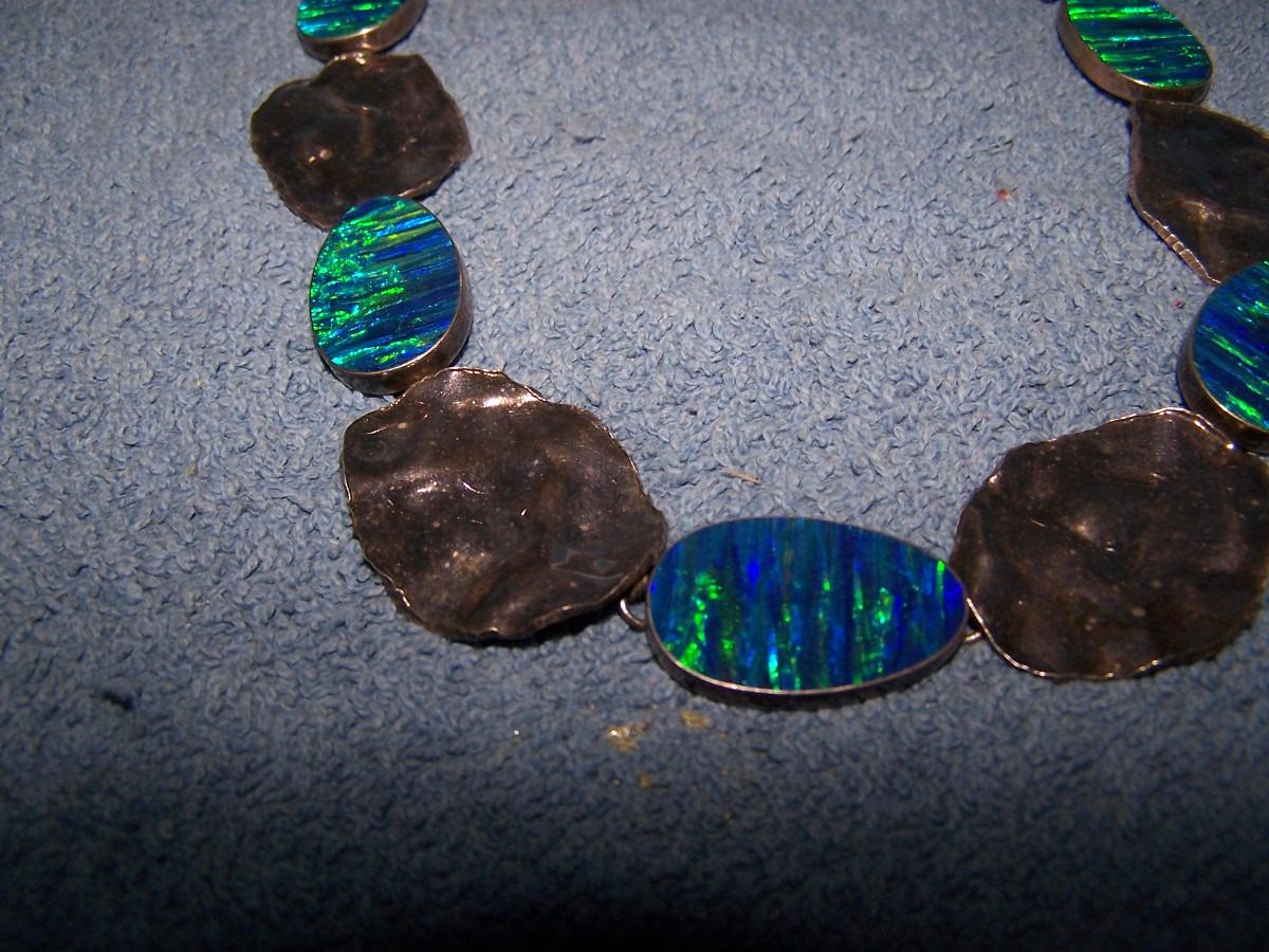 THIS IS A GRAND STERLING & OPAL NECKLACE & BRACELET SET. BOTH ARE MARKED-JS 925... LAB GROWN OPALS-GORGEOUS COLOR!!! NECKLACE-18 1/2'', BRACELET-7 3/4''... 89.49 GR TW.. SLIGHT WEAR..