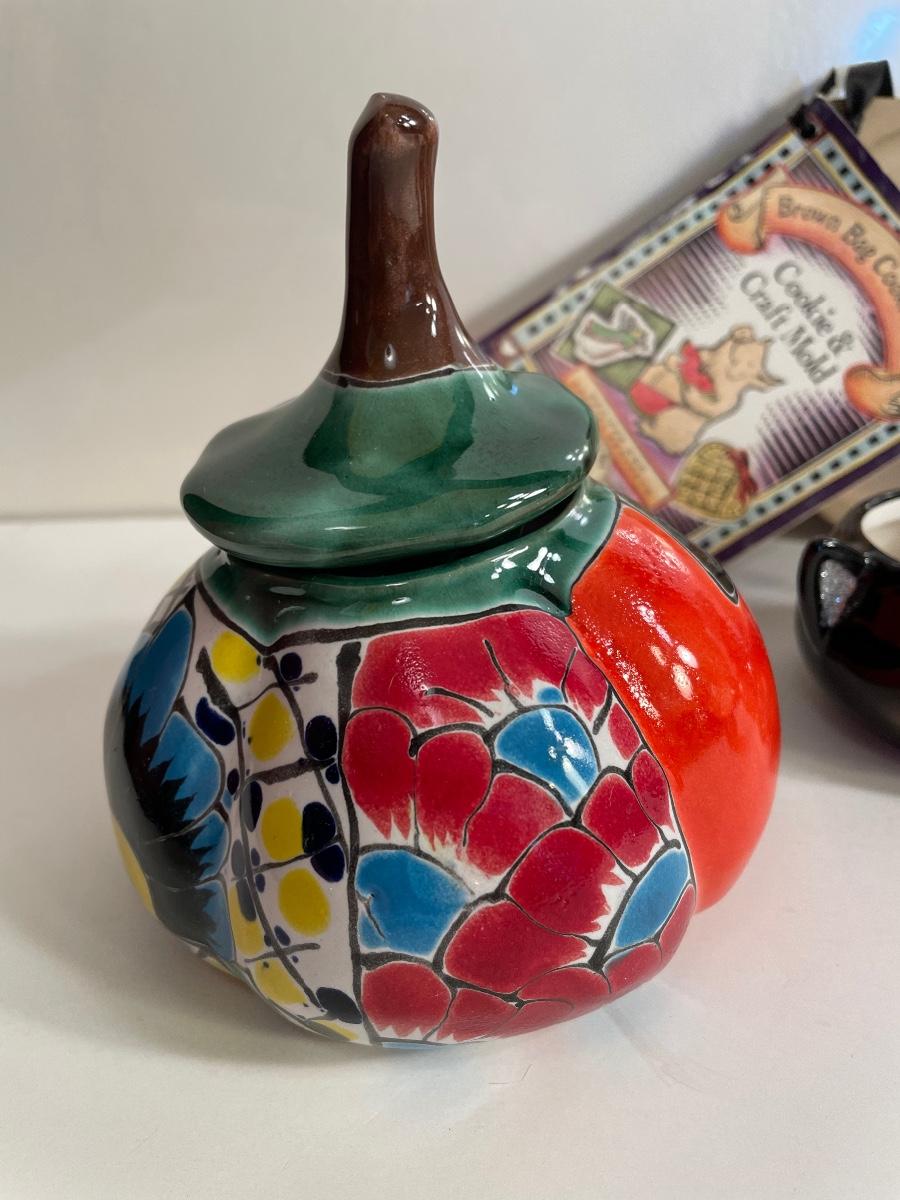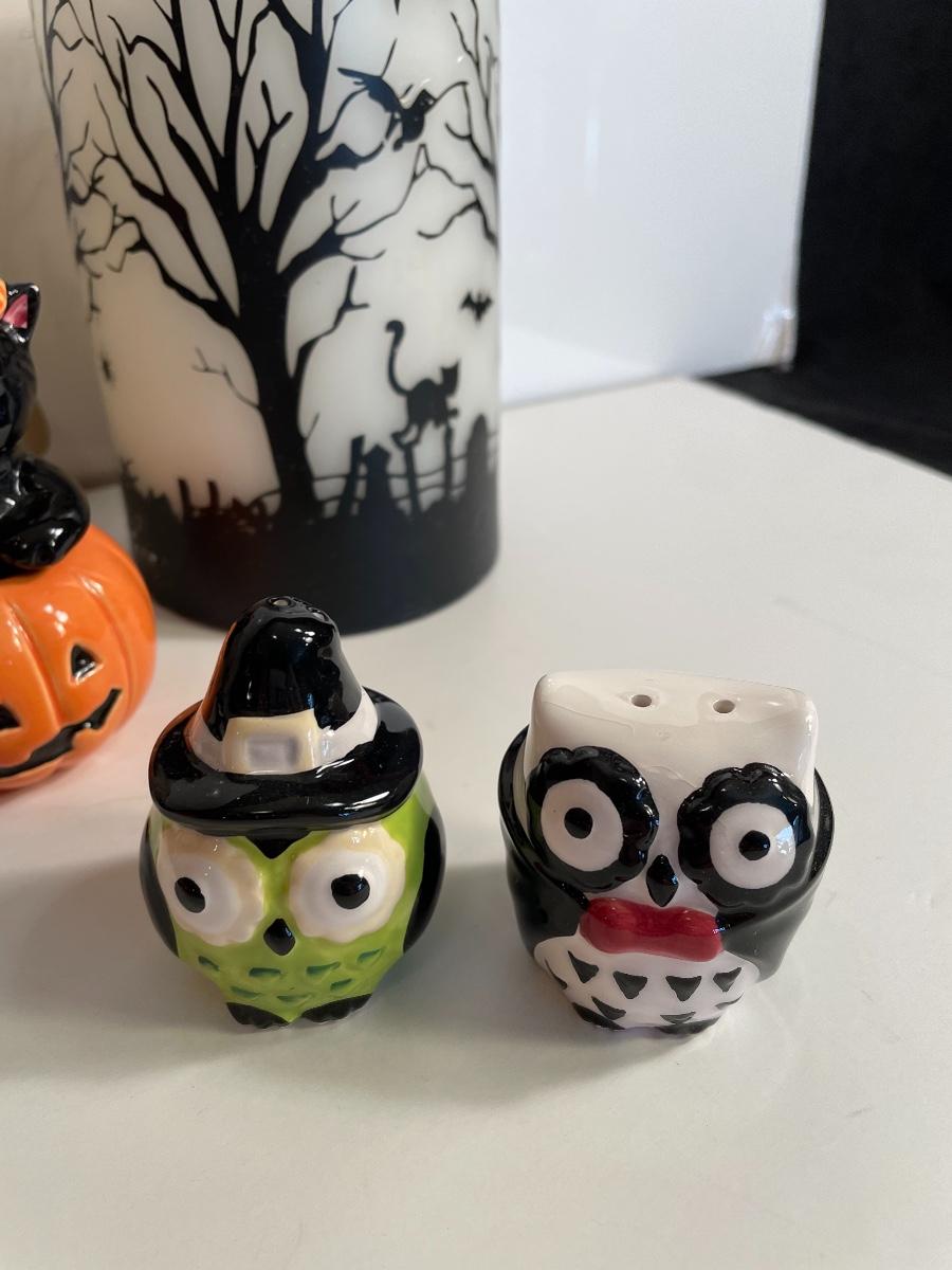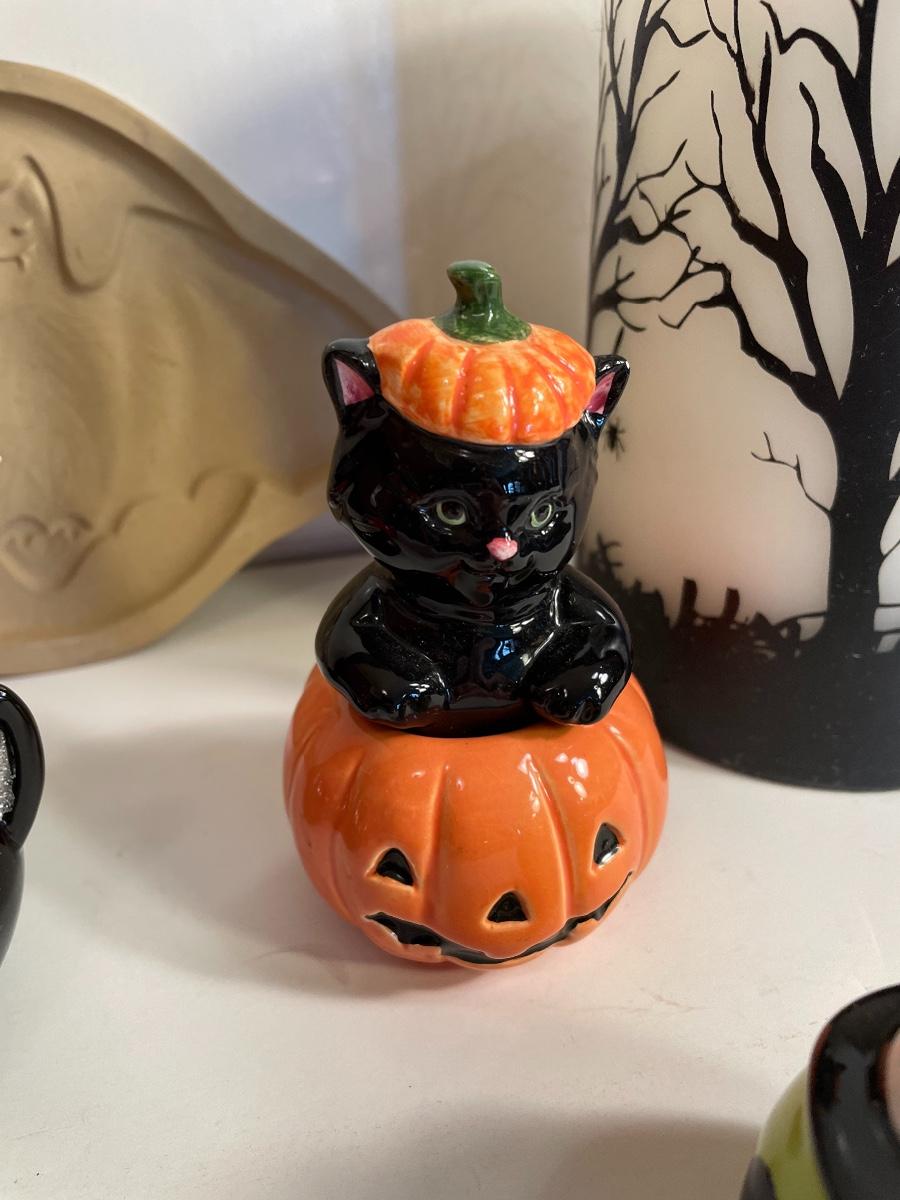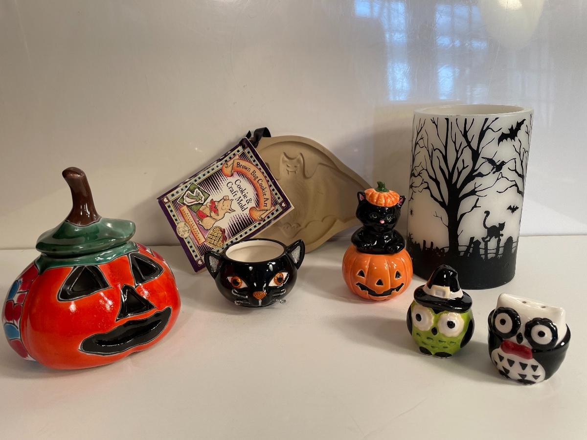Halloween candle, stoneware cookie mold, ceramic pumpkin and two sets of Halloween salt and pepper shakers