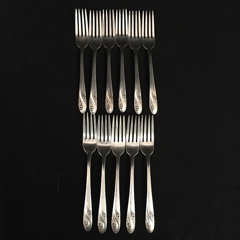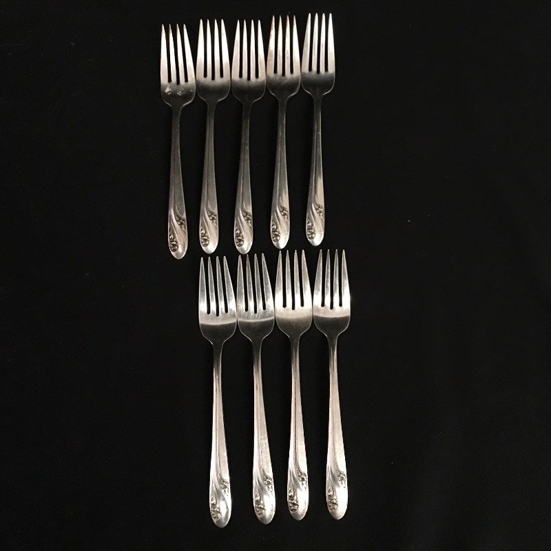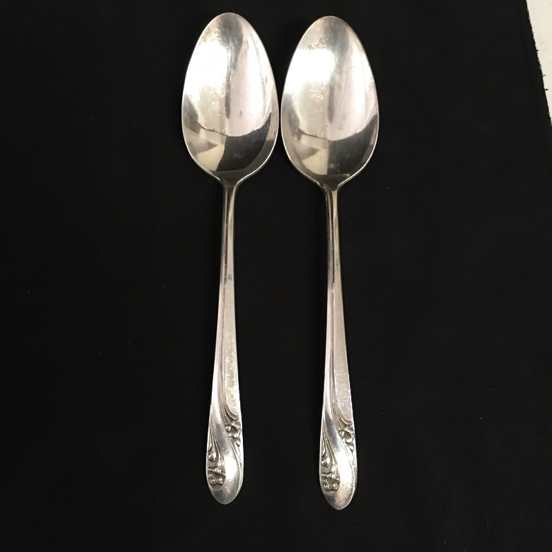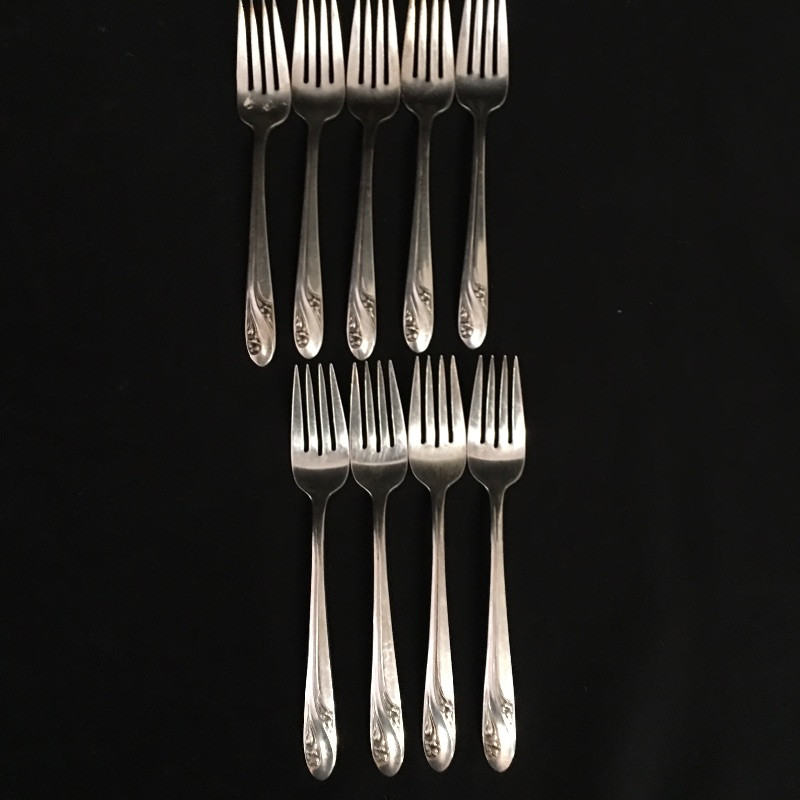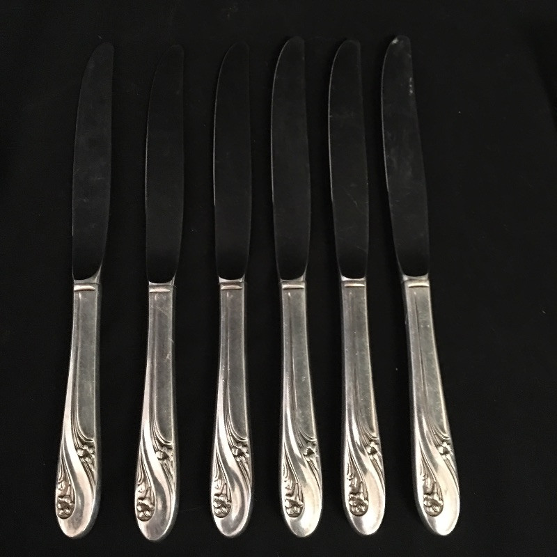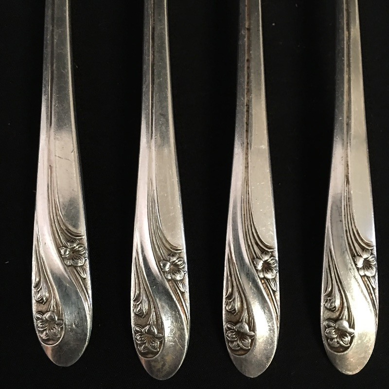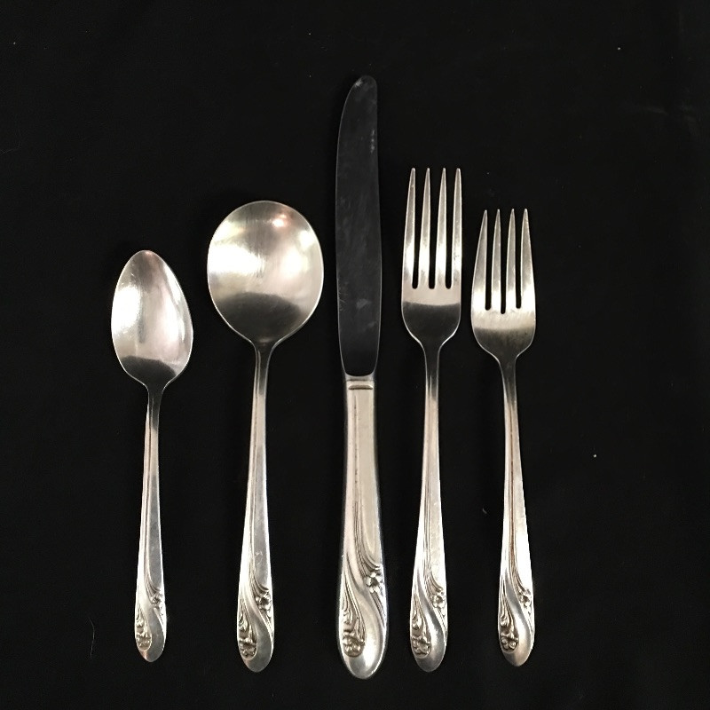 Five piece Holmes & Edwards silver plate flatware with five place settings with many extras and two serving spoons, see images. The cutlery has a lovely detailed floral design etched on them, look closely at images to appreciate the style of this collection.