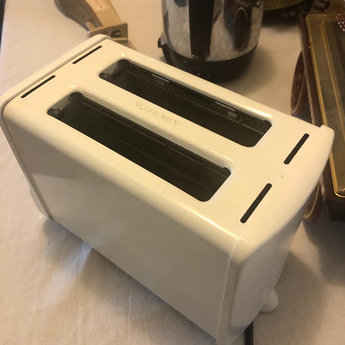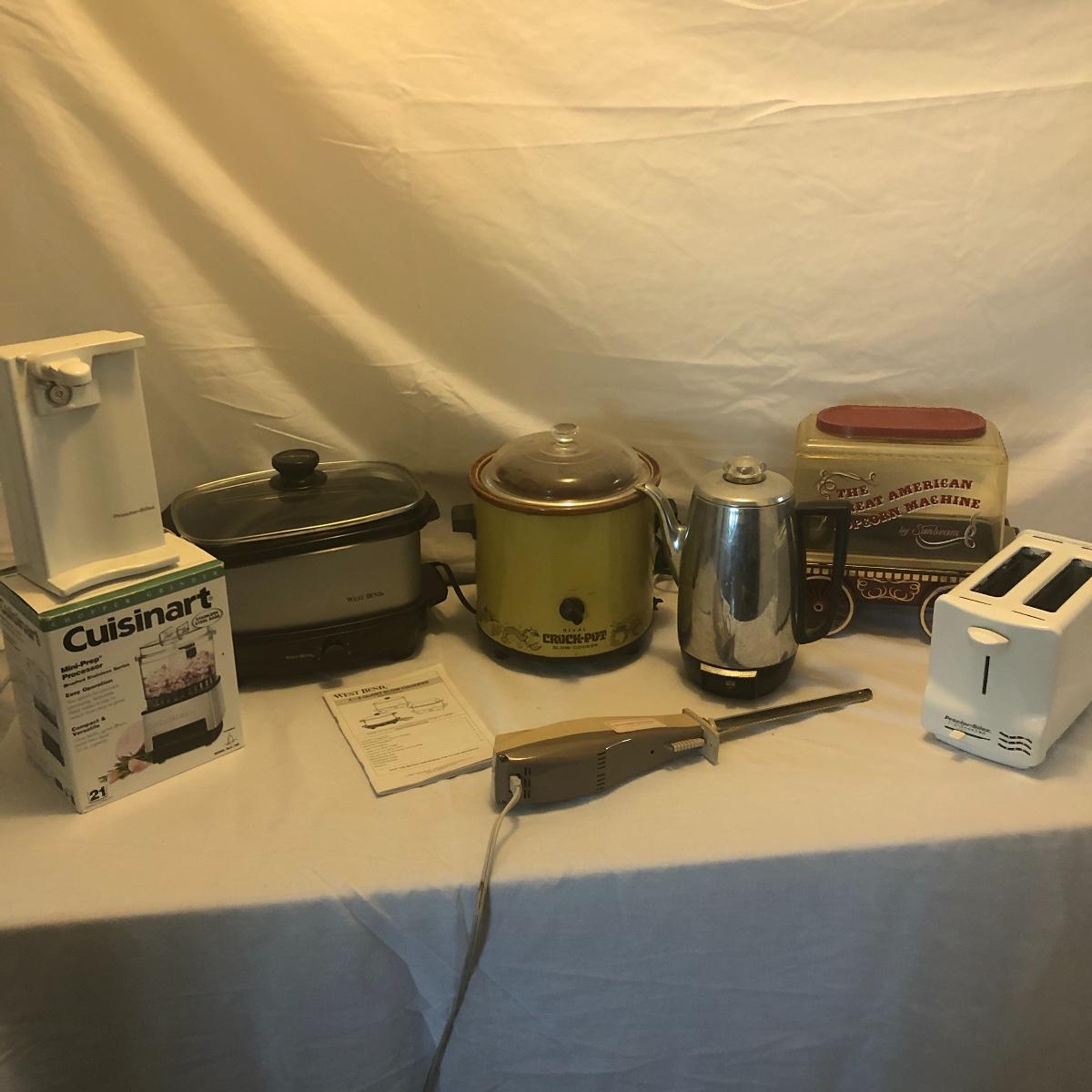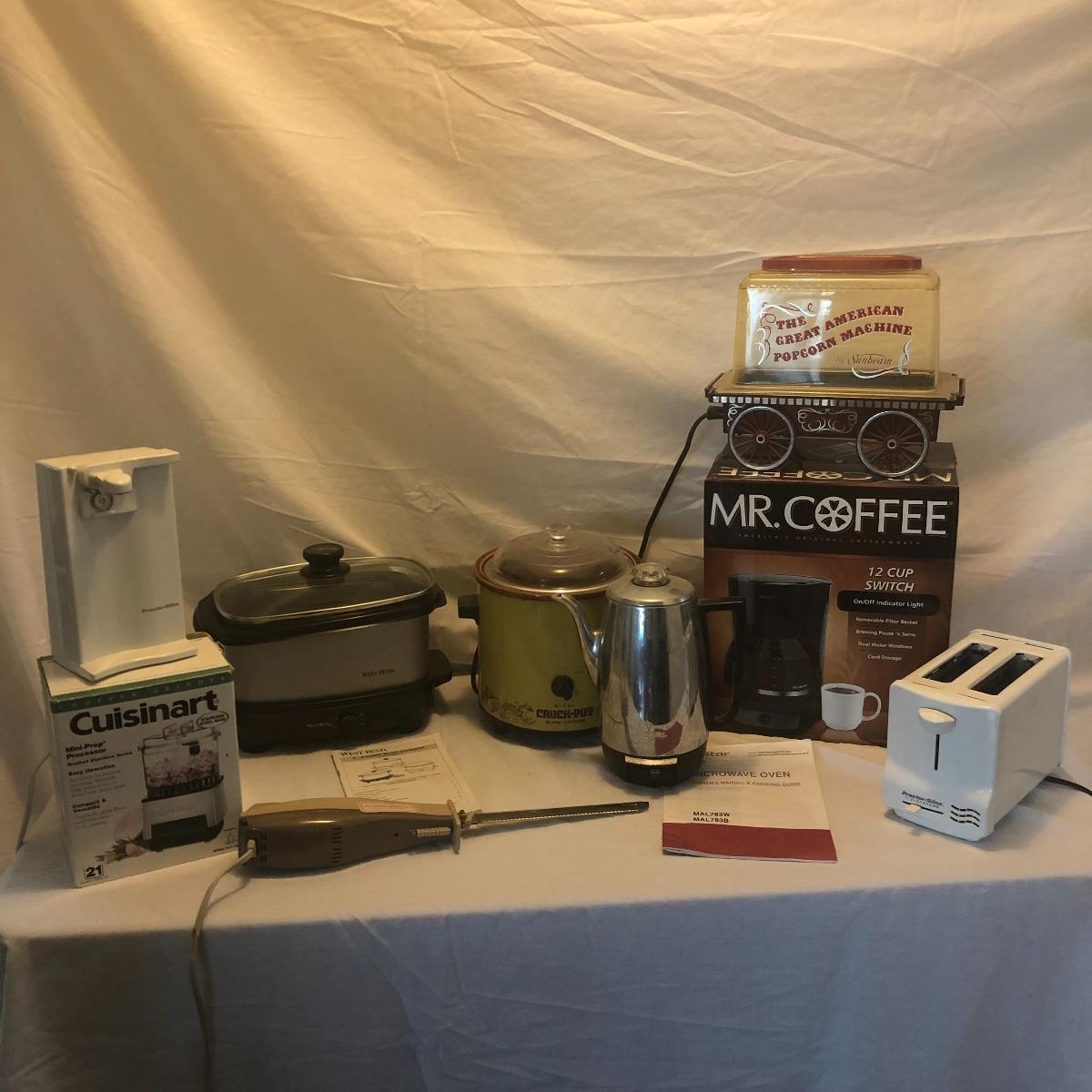 This lot includes a microwave, new in box 12 cup Mr. Coffee maker, a toaster, a Proctor-Silex coffee maker, a Cuisinart mini-prep processor, an electric knife, a West Bend 5-6 quart slow cooker, a Rival crockpot with glass lid, coffee percolator and popcorn maker. All Appliances powered on when plugged in. Local pick up only.