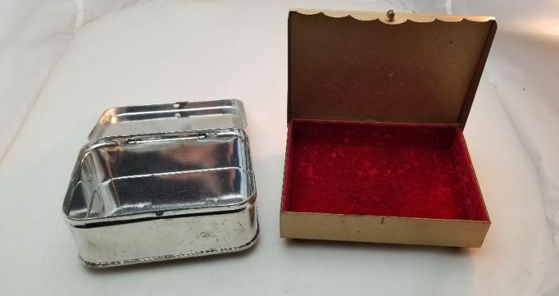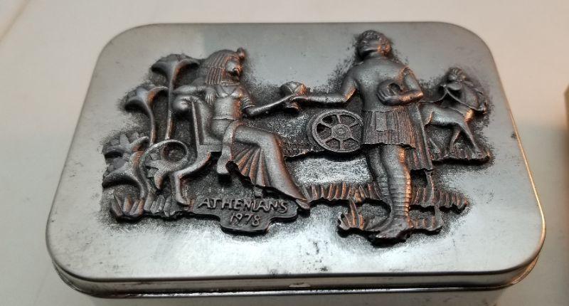 Two vintage krewe favors - silver-toned hinged box from Athenians, dated 1978 (measures 4.5" x 3.25", 2" tall) and a gold-toned hinged trinket box from Les Marionnettes, dated 1964 (5.25" x 3.75", 1.5" tall)