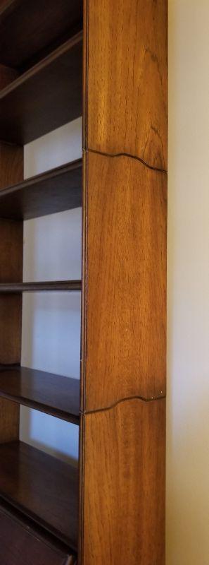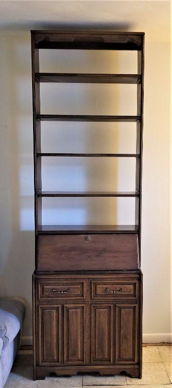 An unusual piece of vintage furniture by the Lane Furniture Company. The bookcase is in three sections and sits on top of the drop down desk. You can use all, or part - or have a totally separate bookcase and a stand-alone desk. 94.5" tall when fully put together (as shown) - will fit under an 8' ceiling. 30" wide, 16" deep. 1970's. Clean. A very versatile piece of furniture.
