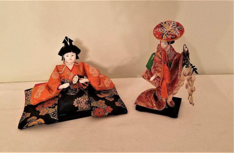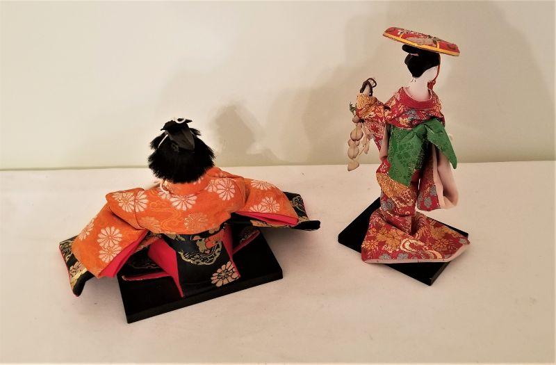 Two typical Japanese character dolls - classic Geisha and seated musician. Both in good condition - these dolls are typically purchased as trip souvenirs. Musician is 9.5" wide, Geisha is 8" tall. Both in good condition.