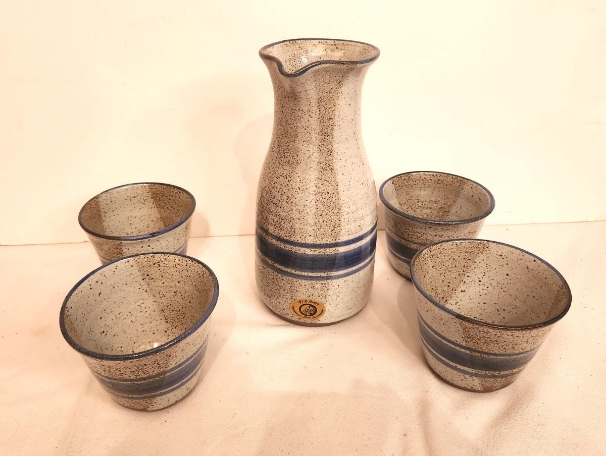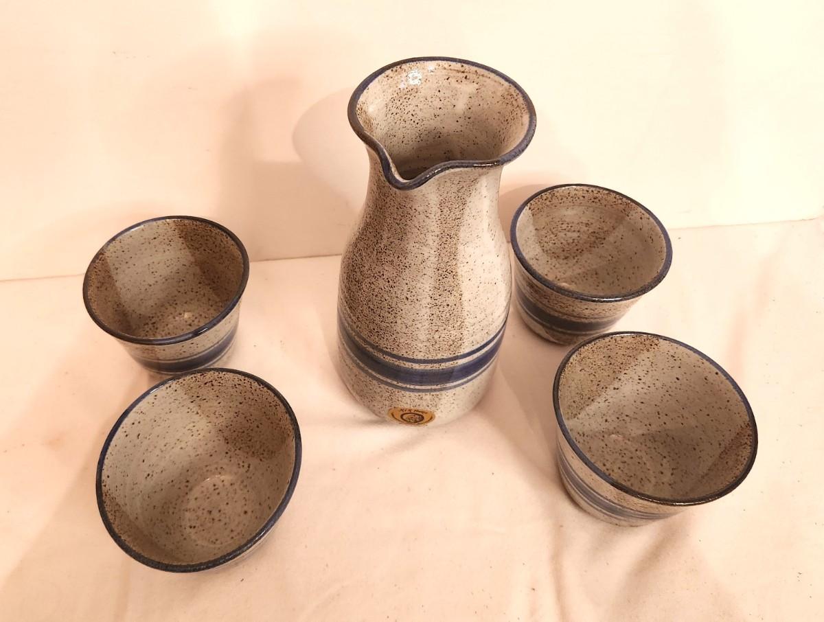 Nice lot of H&R Studio Pottery (California) - has original label - carafe and 4 matching cups. Carafe is 10" tall, cups are 3.5" tall. These look like they have never been used.
