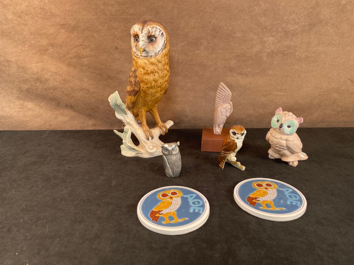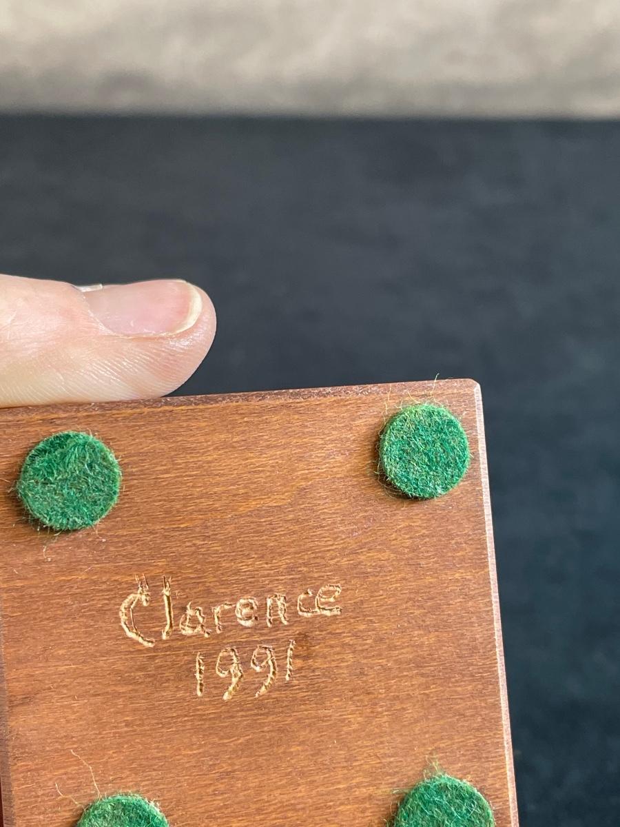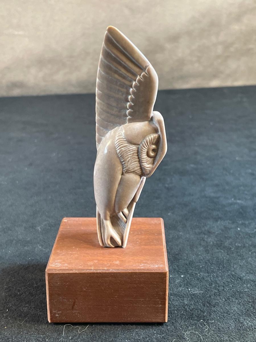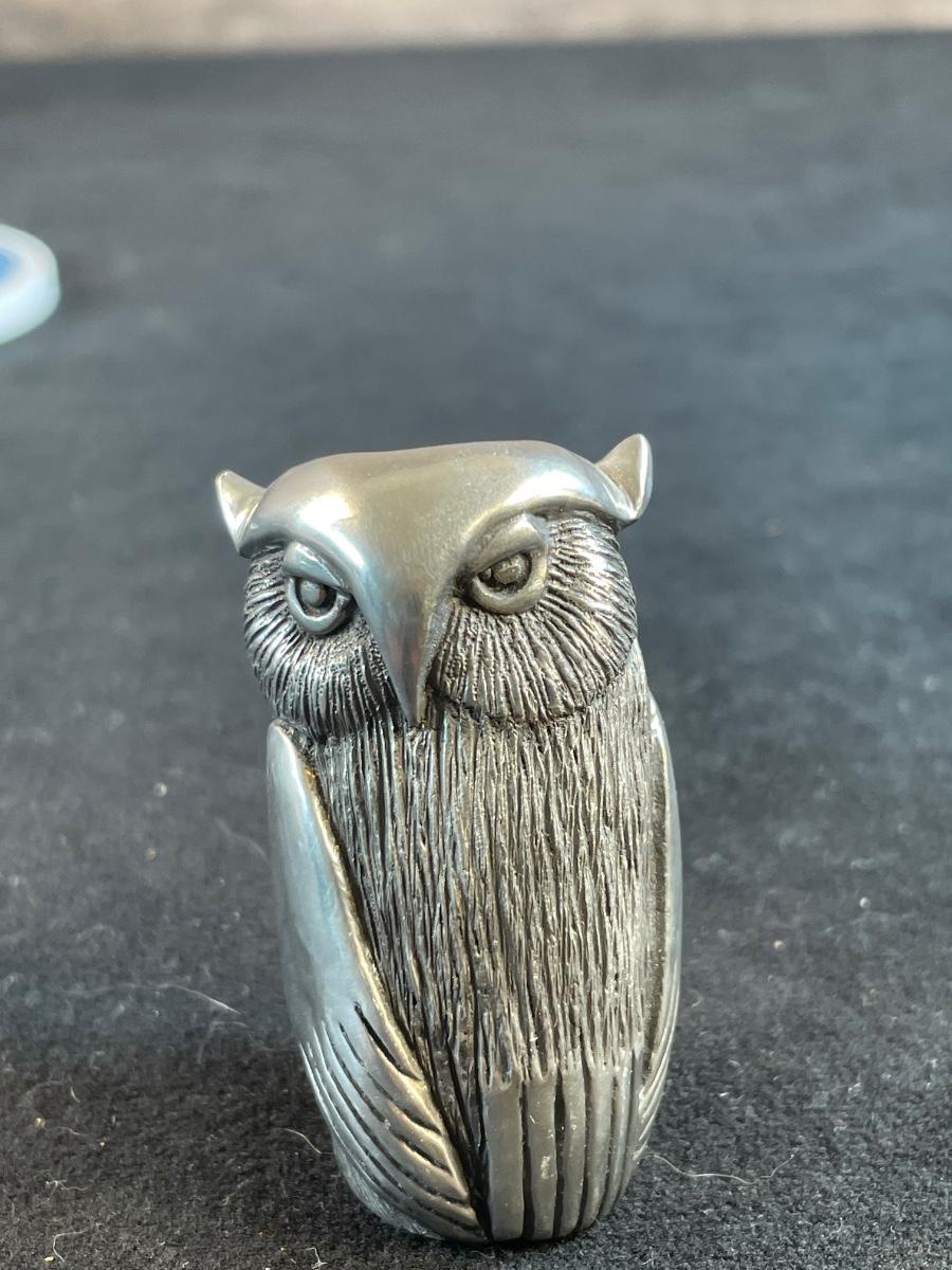 small pewter owl and soapstone owl on a wood base, both marked "Clarence"