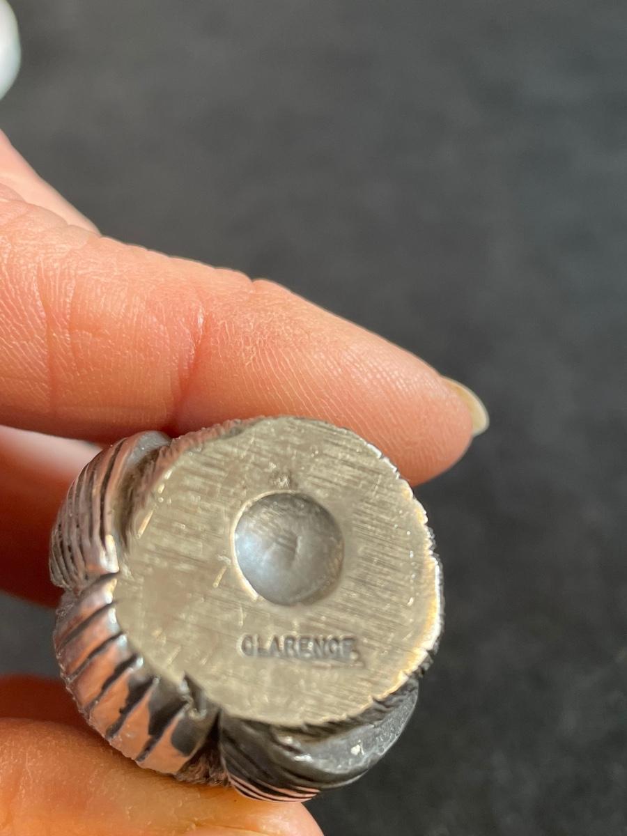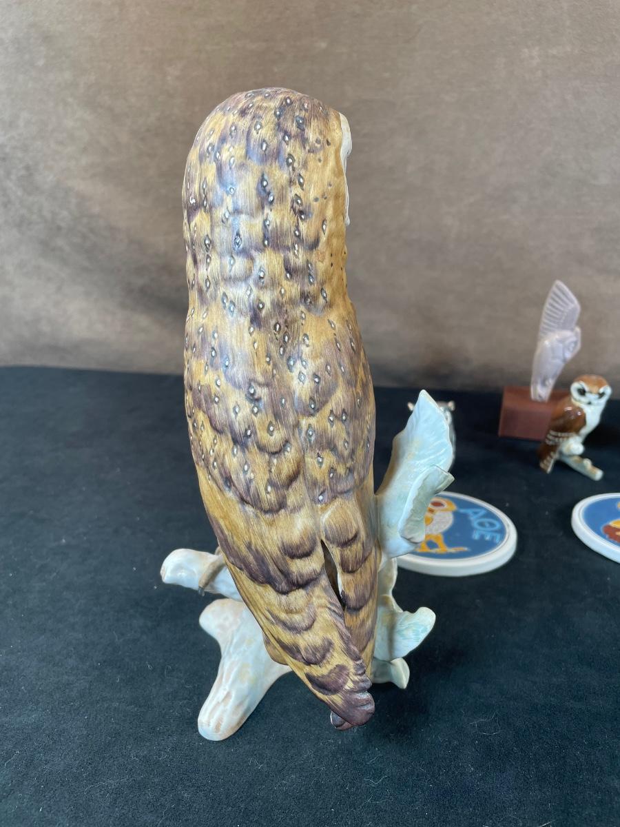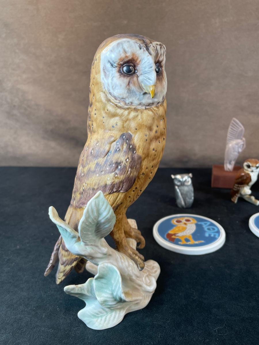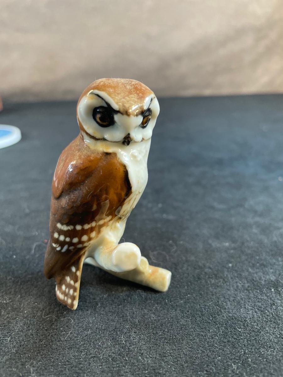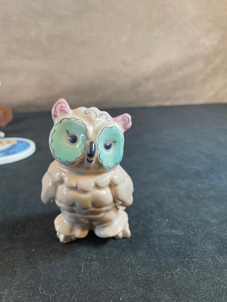 small pewter owl and soapstone owl on a wood base, both marked "Clarence"