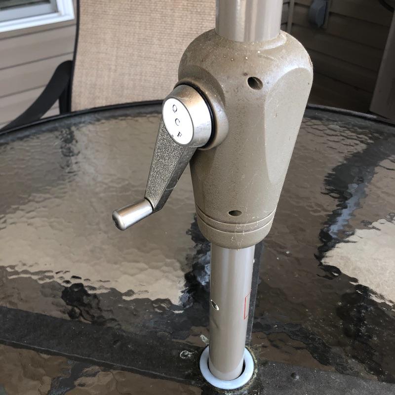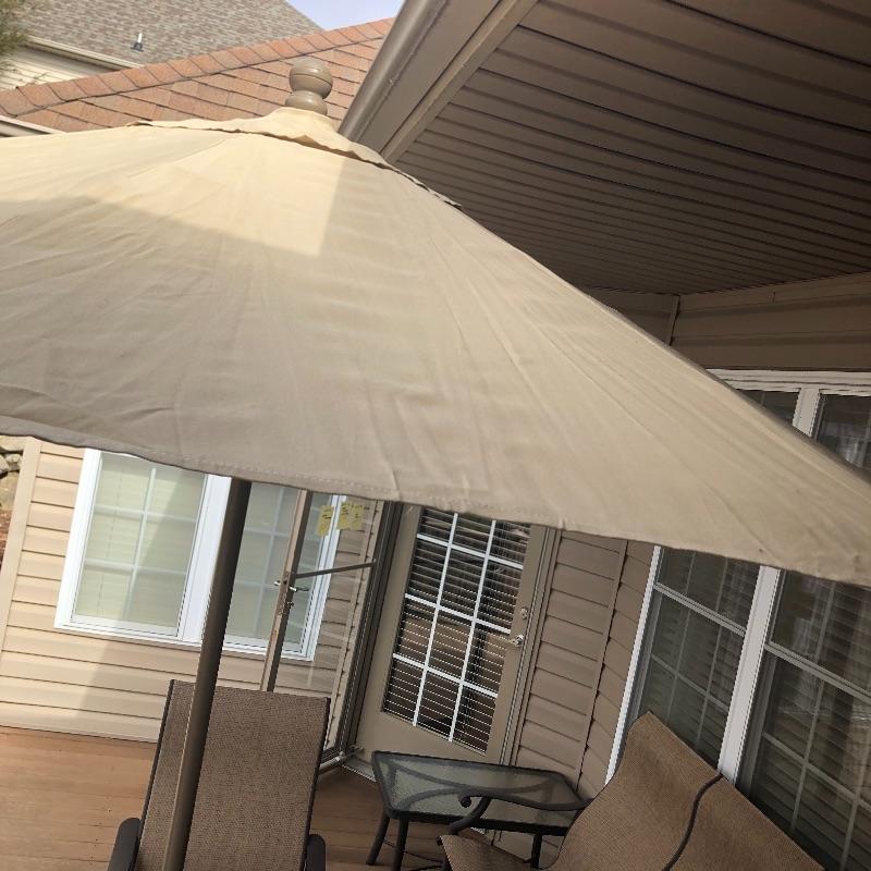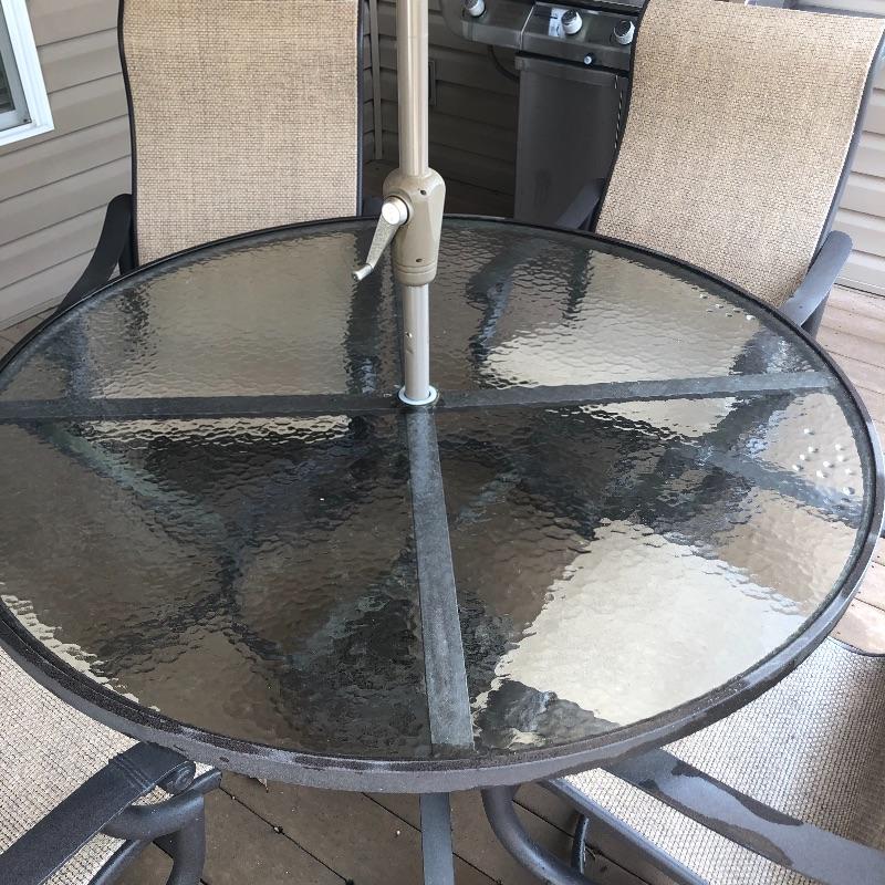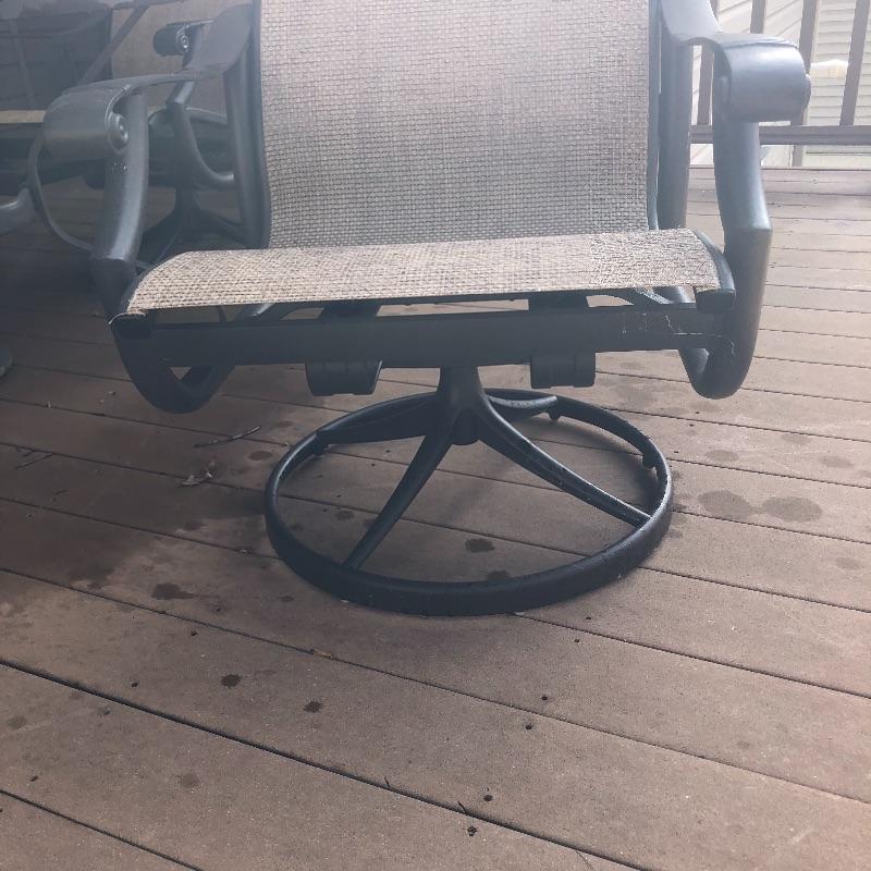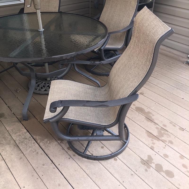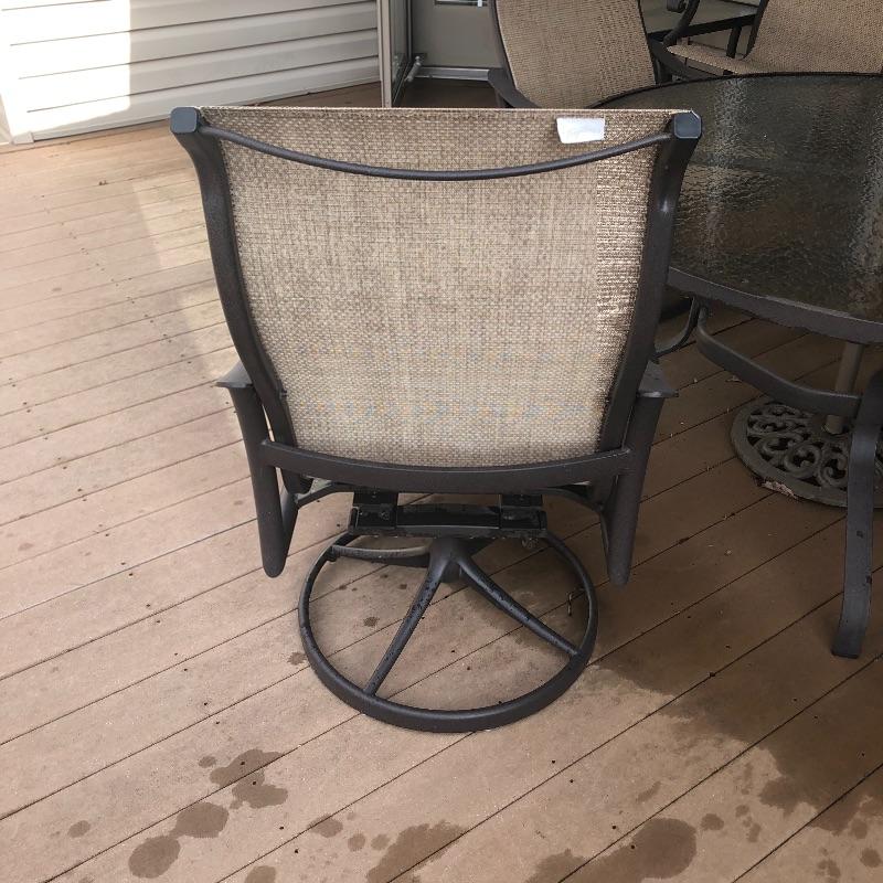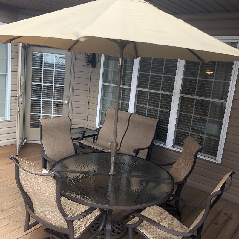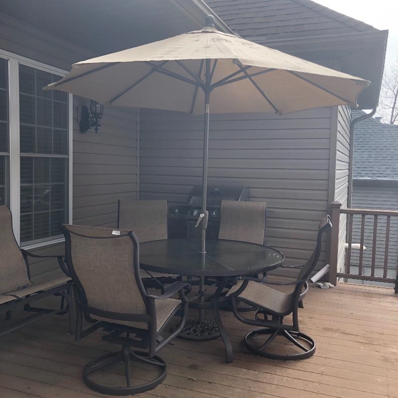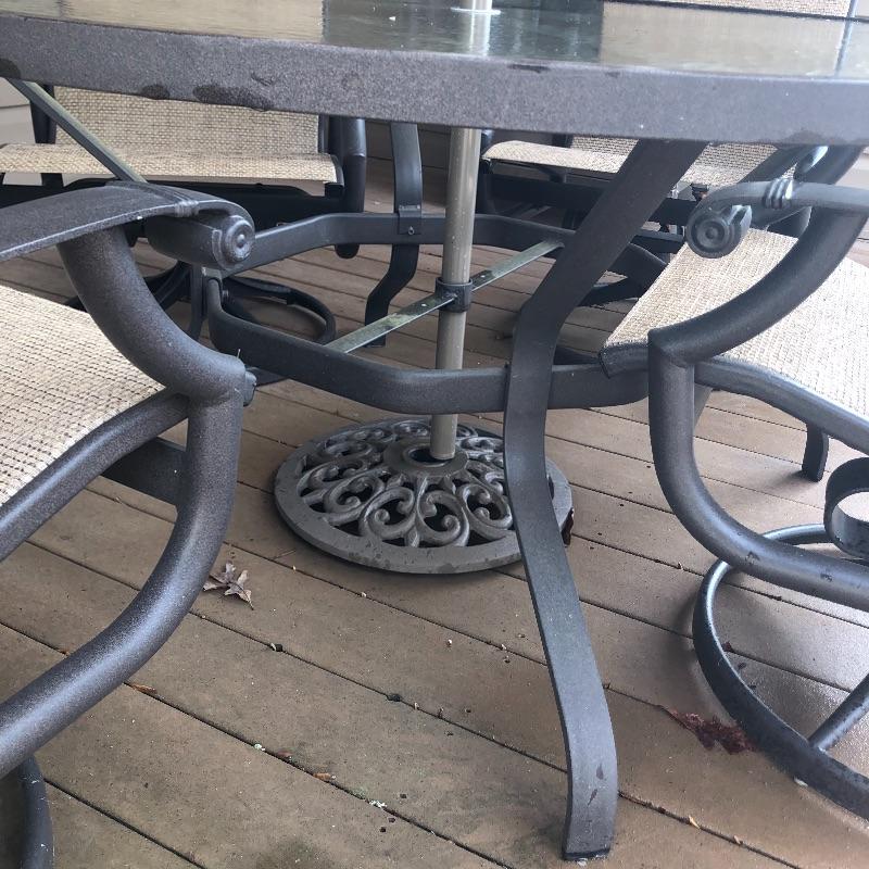 This large patio table is in excellent condition and includes the matching umbrella with separate metal stand. The four matching swivel rocker chairs are also in great condition and are super comfortable. This set matches the items in the previous lot 41.