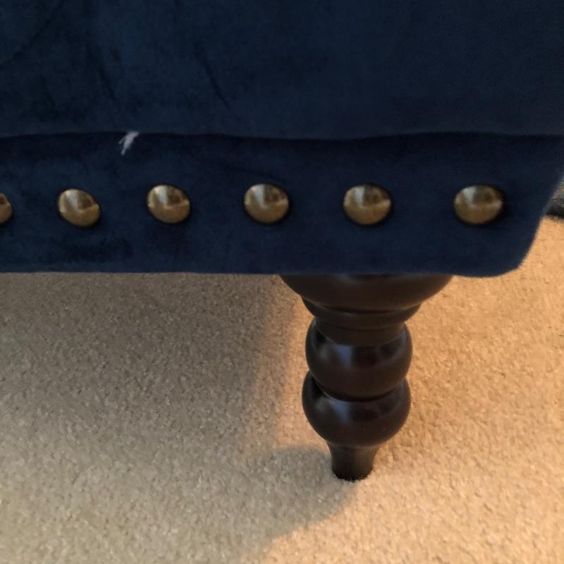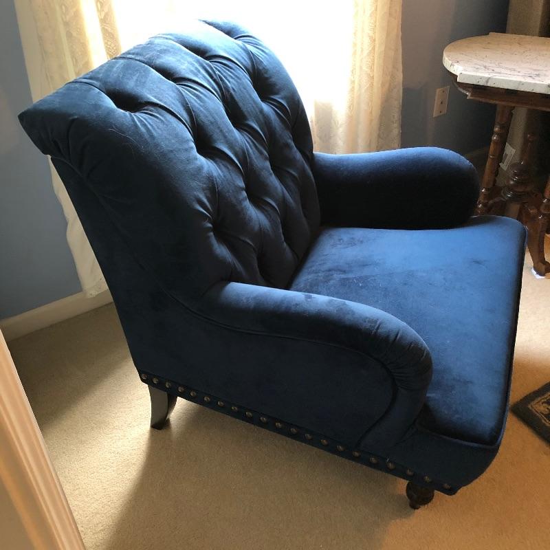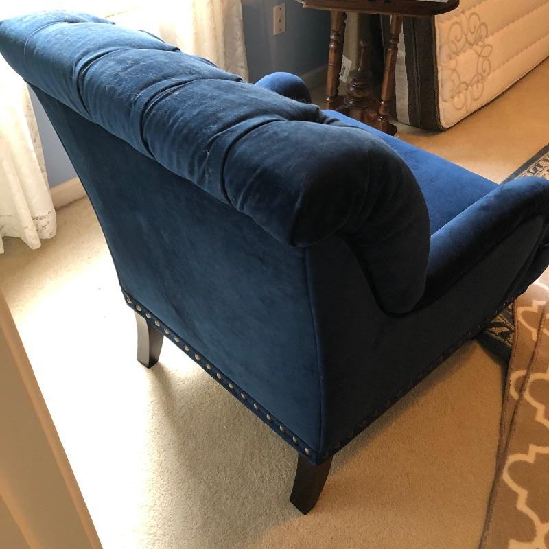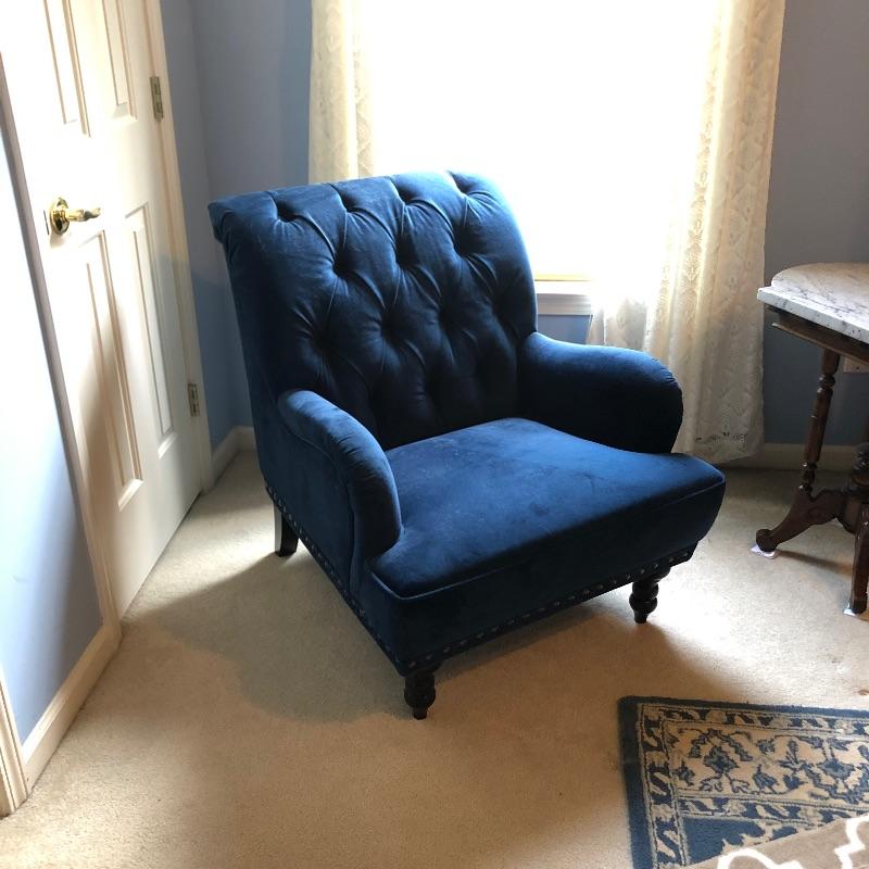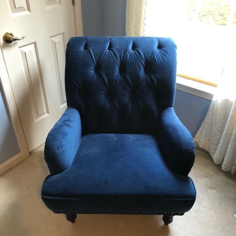 The perfect chair for your bedroom or reading nook, this Pier One Chair is as comfortable as it is attractive. A royal blue color, it appears to be micro fiber that looks like velvet. It is in great condition, just needs vacuuming as there is some pet hair. Has metal button detail along side.