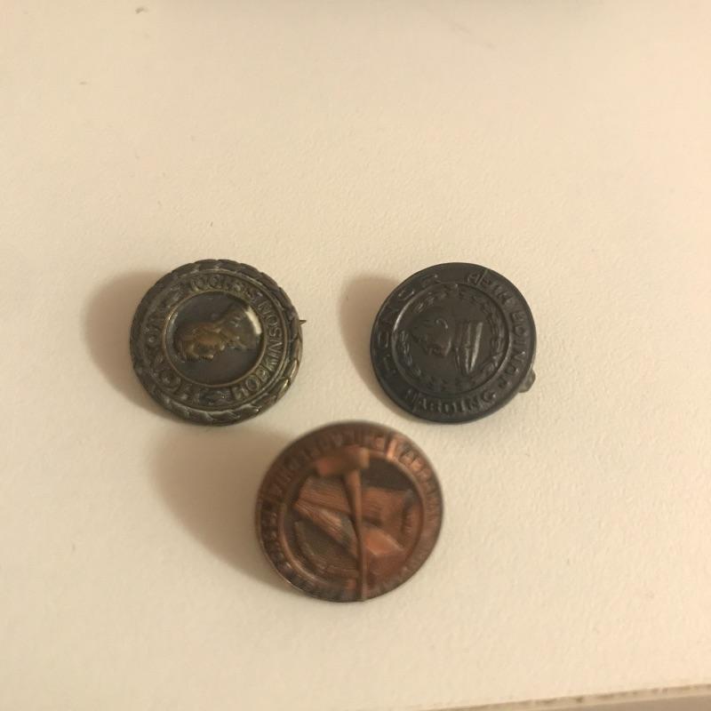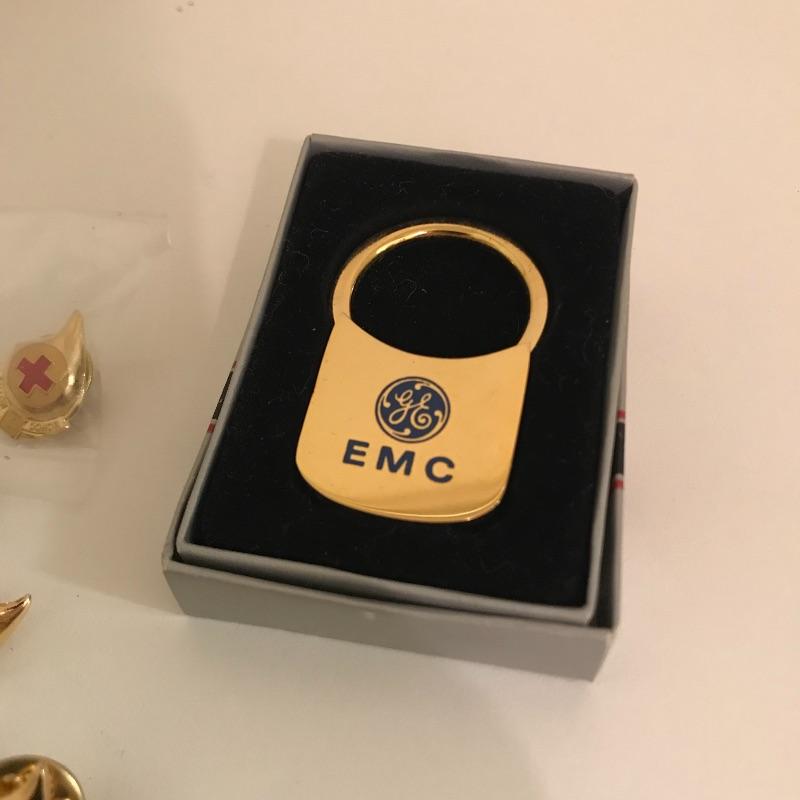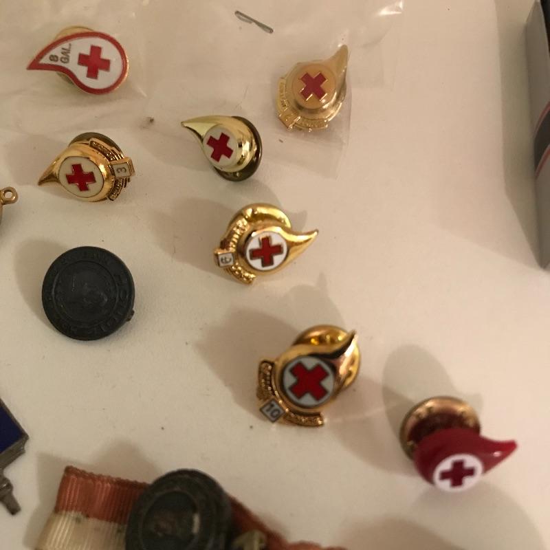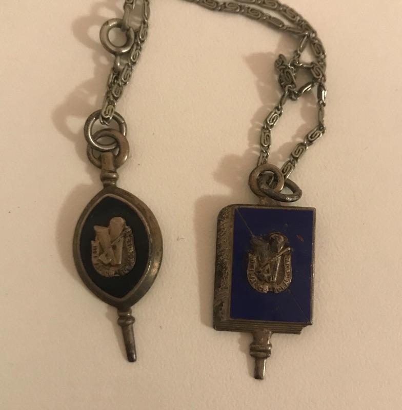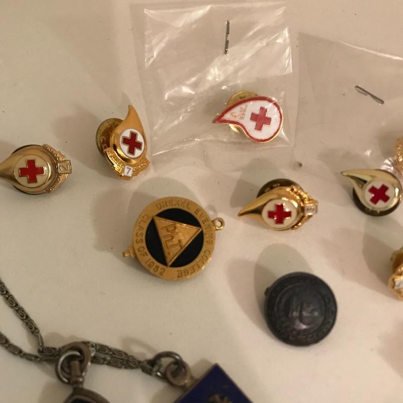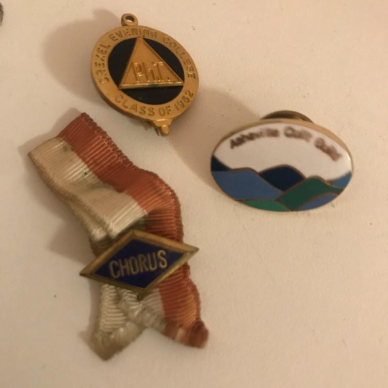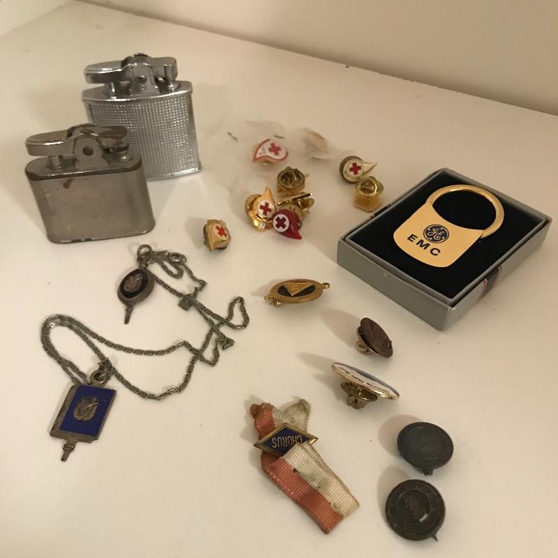 Lot includes assorted pins and pendants, five of which are sterling silver. SS pins and pendants appear to be “honors” awards from various schools. Lot also includes two antique metal lighters and a GM key holder. See pics. Shipping available