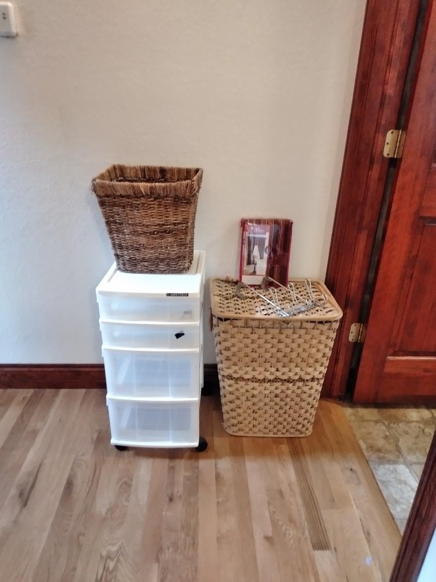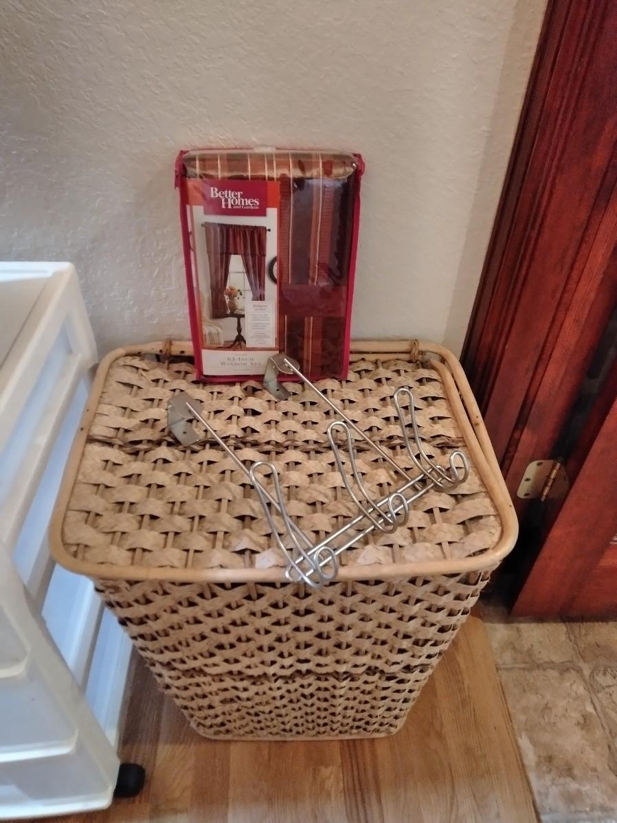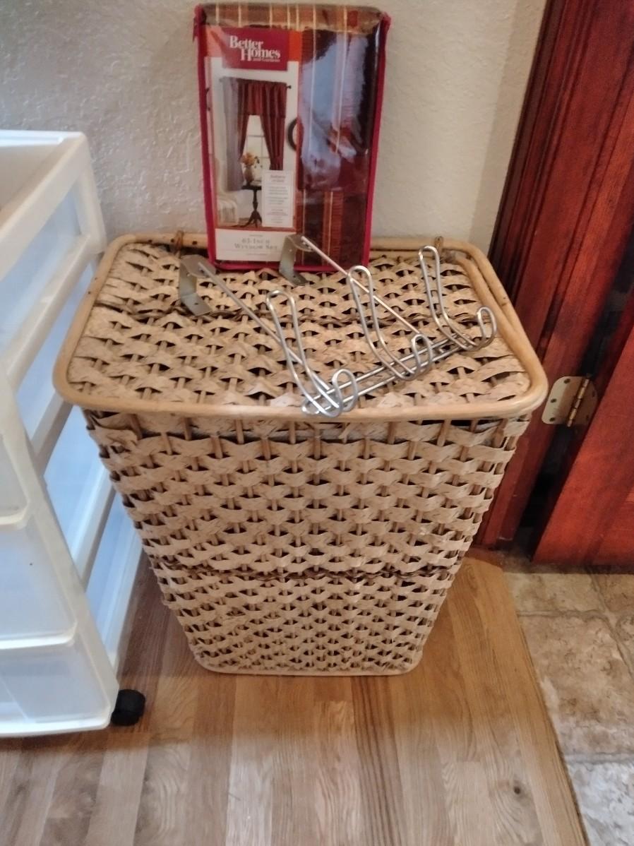THREE DRAWER PLASTIC STORAGE, WICKER LAUNDRY HAMPER, WICKER TRASH CAN, AND 63" WINDOW SET.