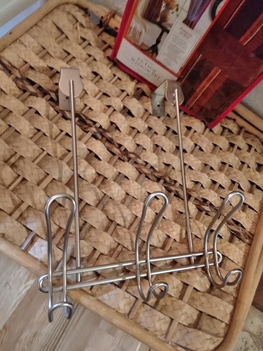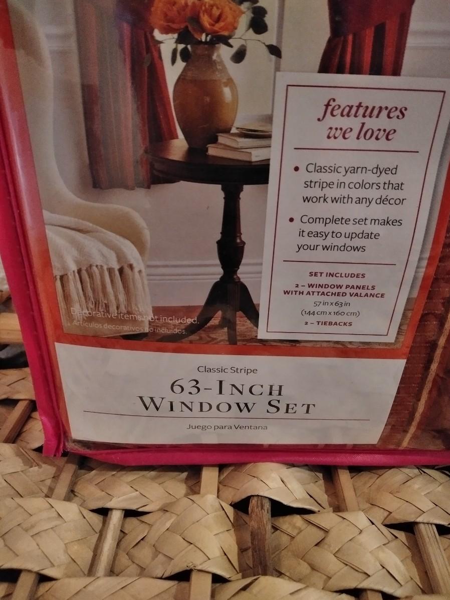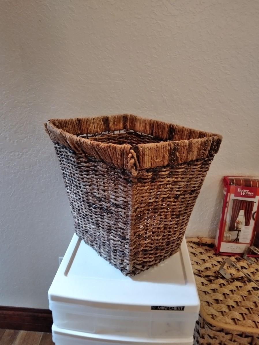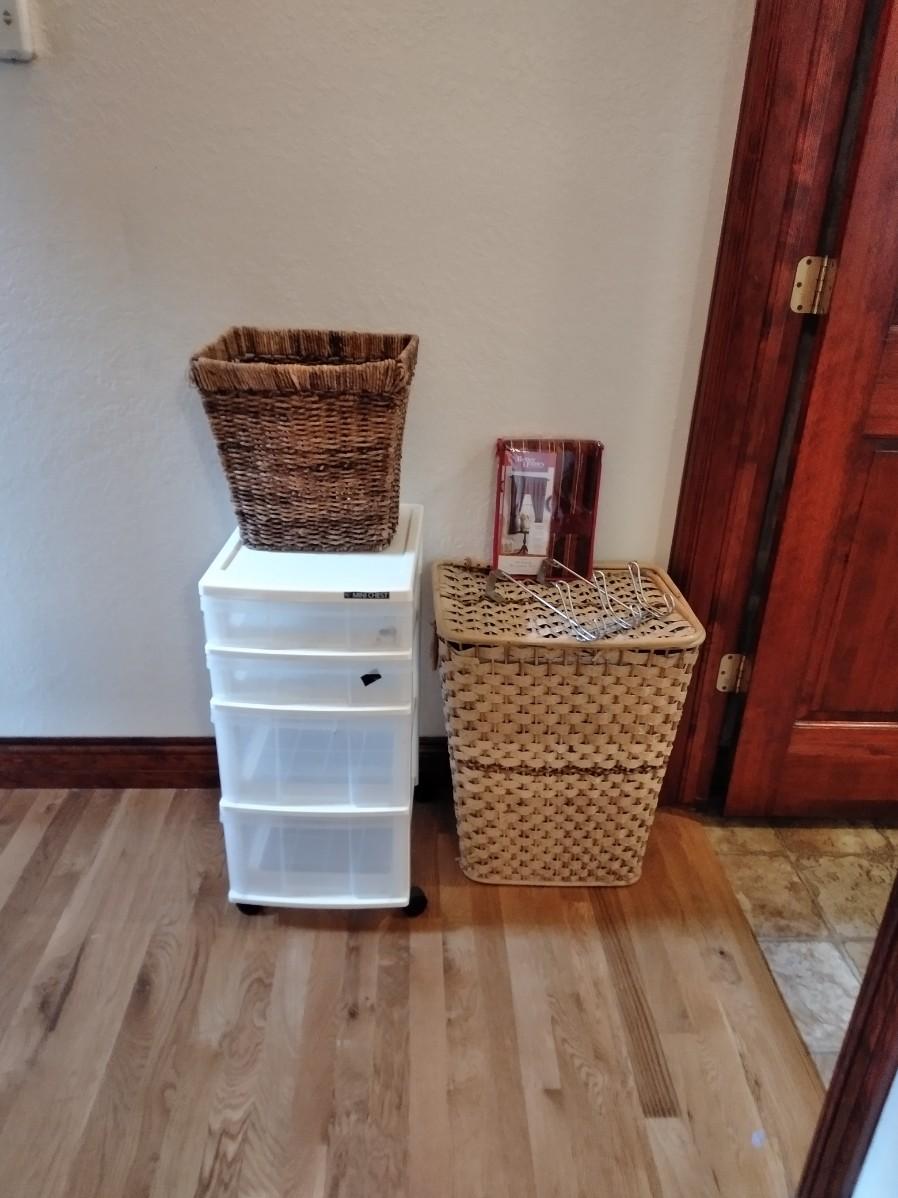 THREE DRAWER PLASTIC STORAGE, WICKER LAUNDRY HAMPER, WICKER TRASH CAN, AND 63" WINDOW SET.