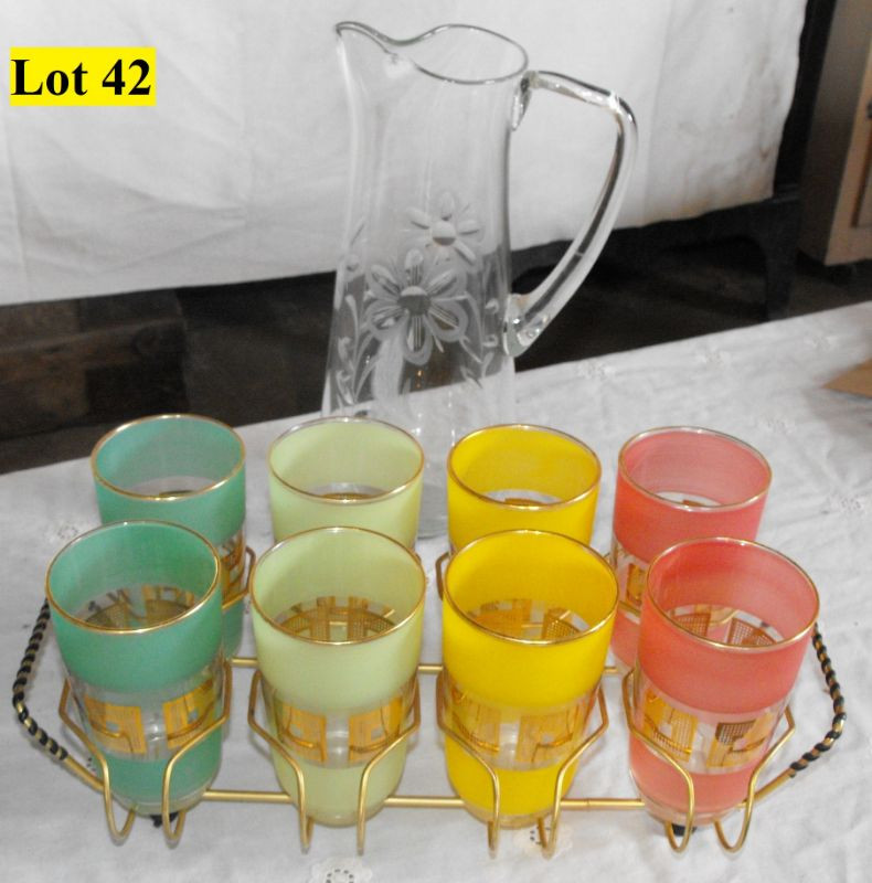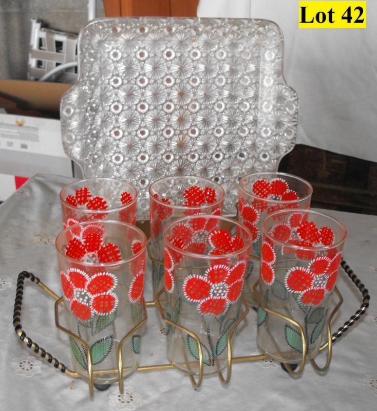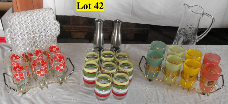 3 Sets of Drinking Glasses (carriers for 2 sets), Vintage Glass Serving Platter,