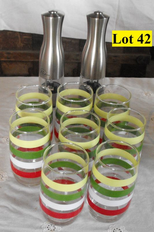 New Stainless Steel Mill Salt and Pepper Grinders/Shakers and Etched Glass Pitcher