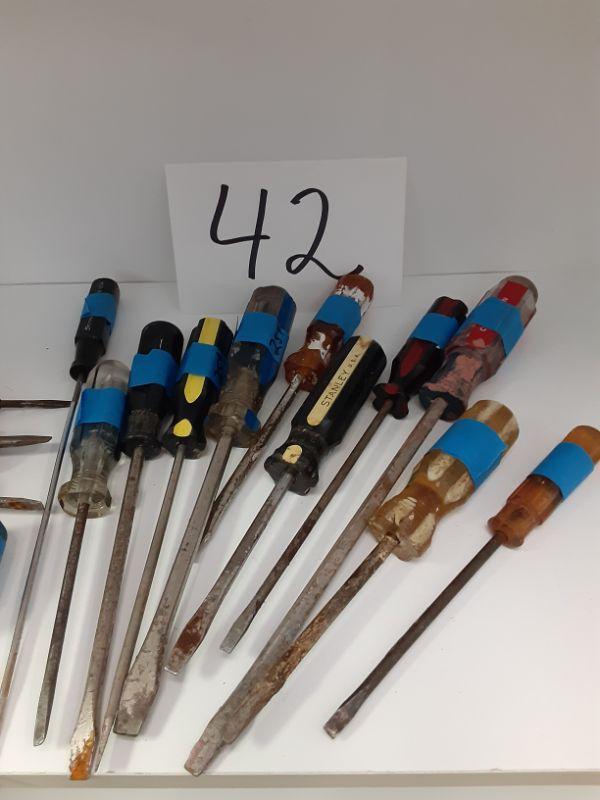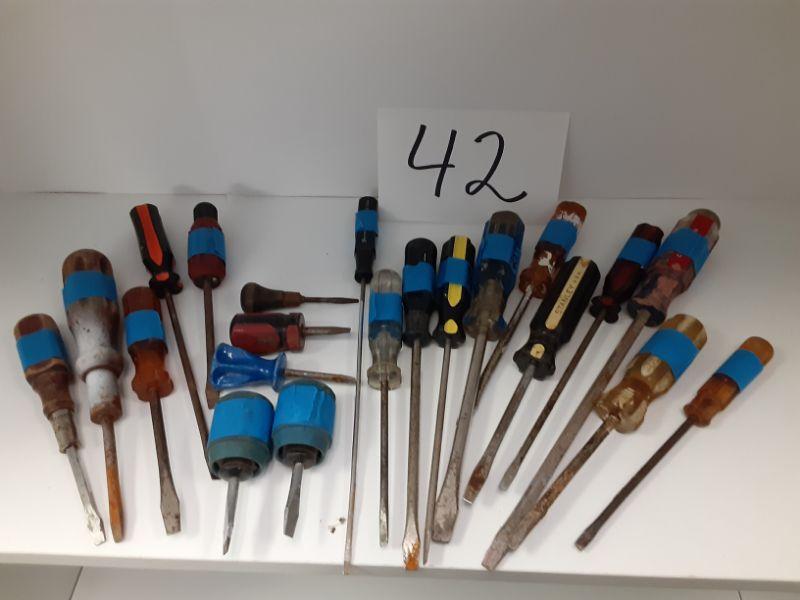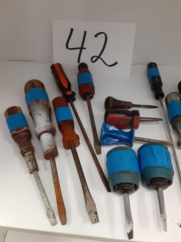 This lot includes an assortment of 18 flat head screwdrivers and three punches. Tape on handles are for identification; no broken or chipped handles. All tools are used.