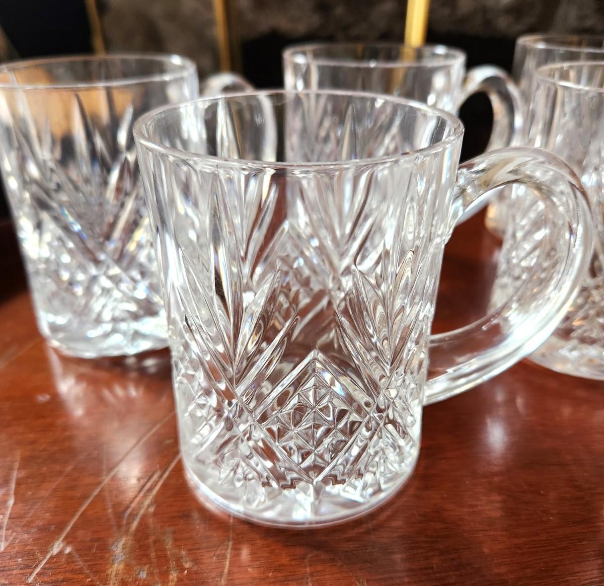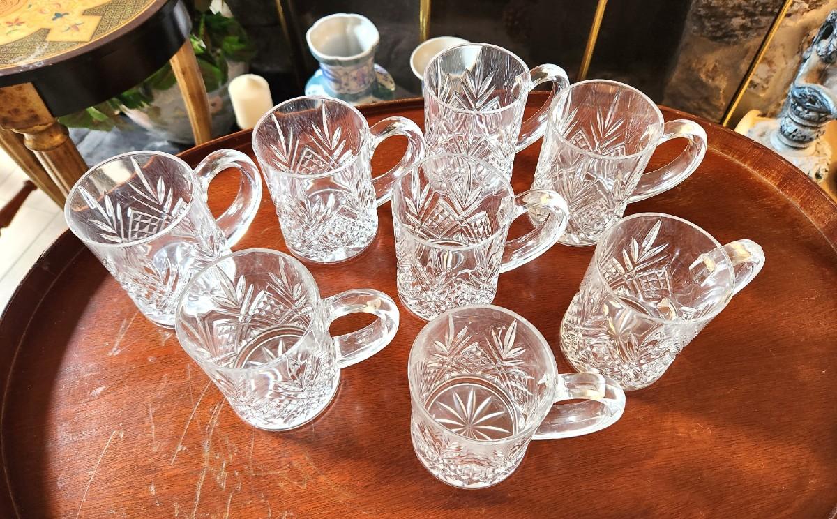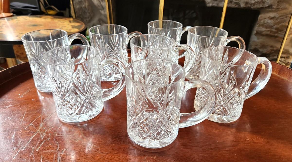 Nice set of 8 crystal mugs, each 4" tall. No maker's mark. All in good conditon.