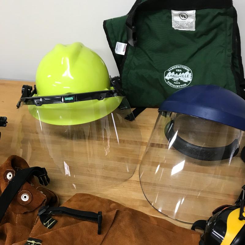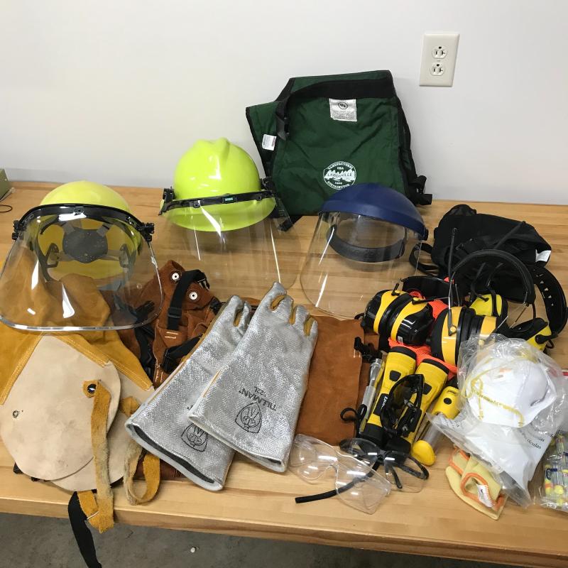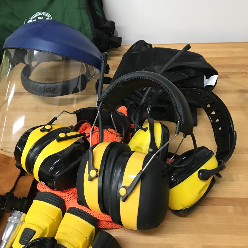 Protective eye wear, head phones, face shields, high heat protective gloves, suede chaps and over coat as well as insulated canvas chaps and much more. Lot is available for local pick up in Asheville, NC only.
